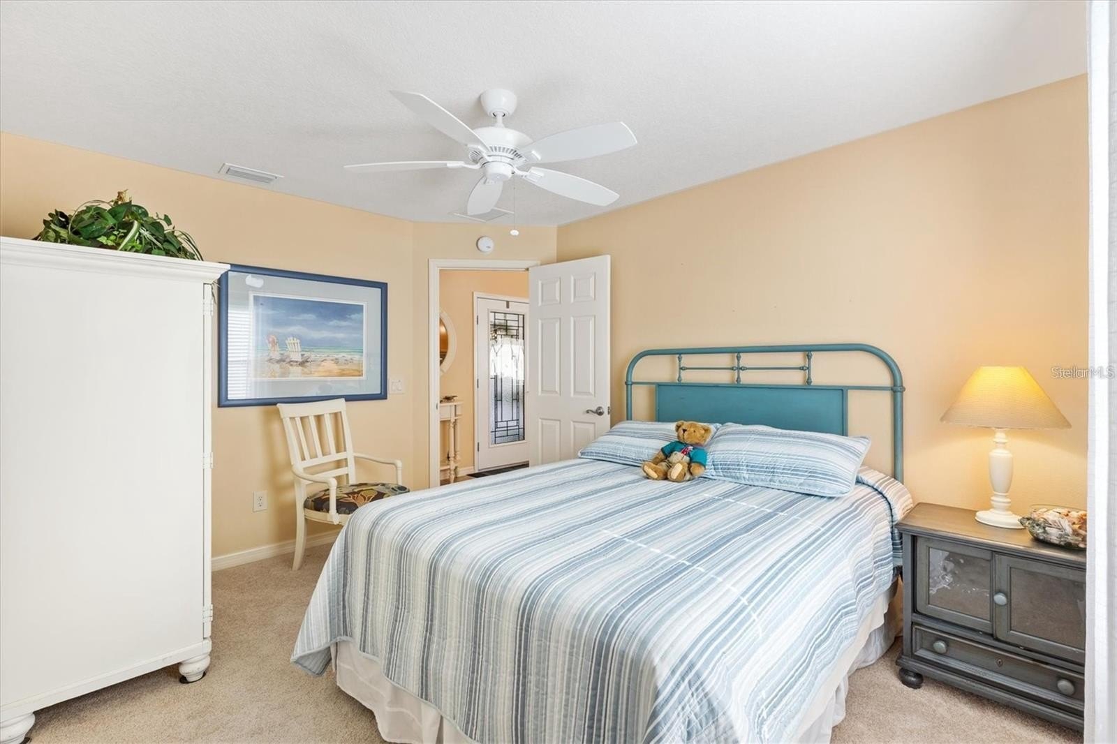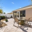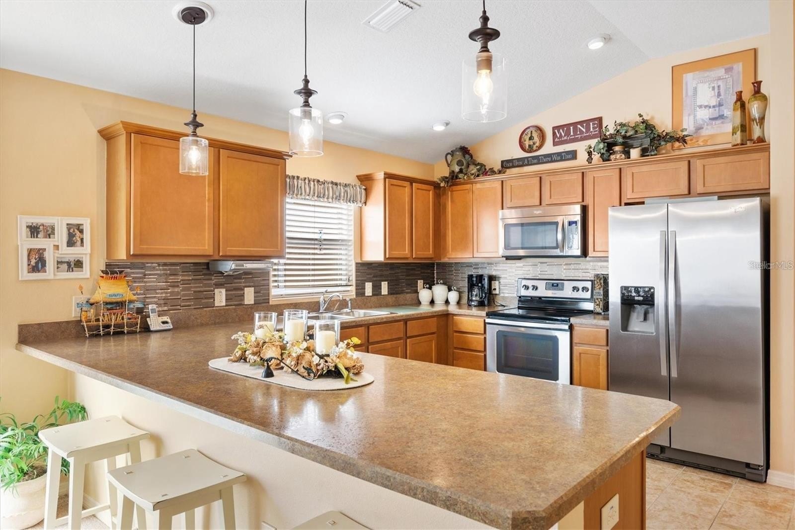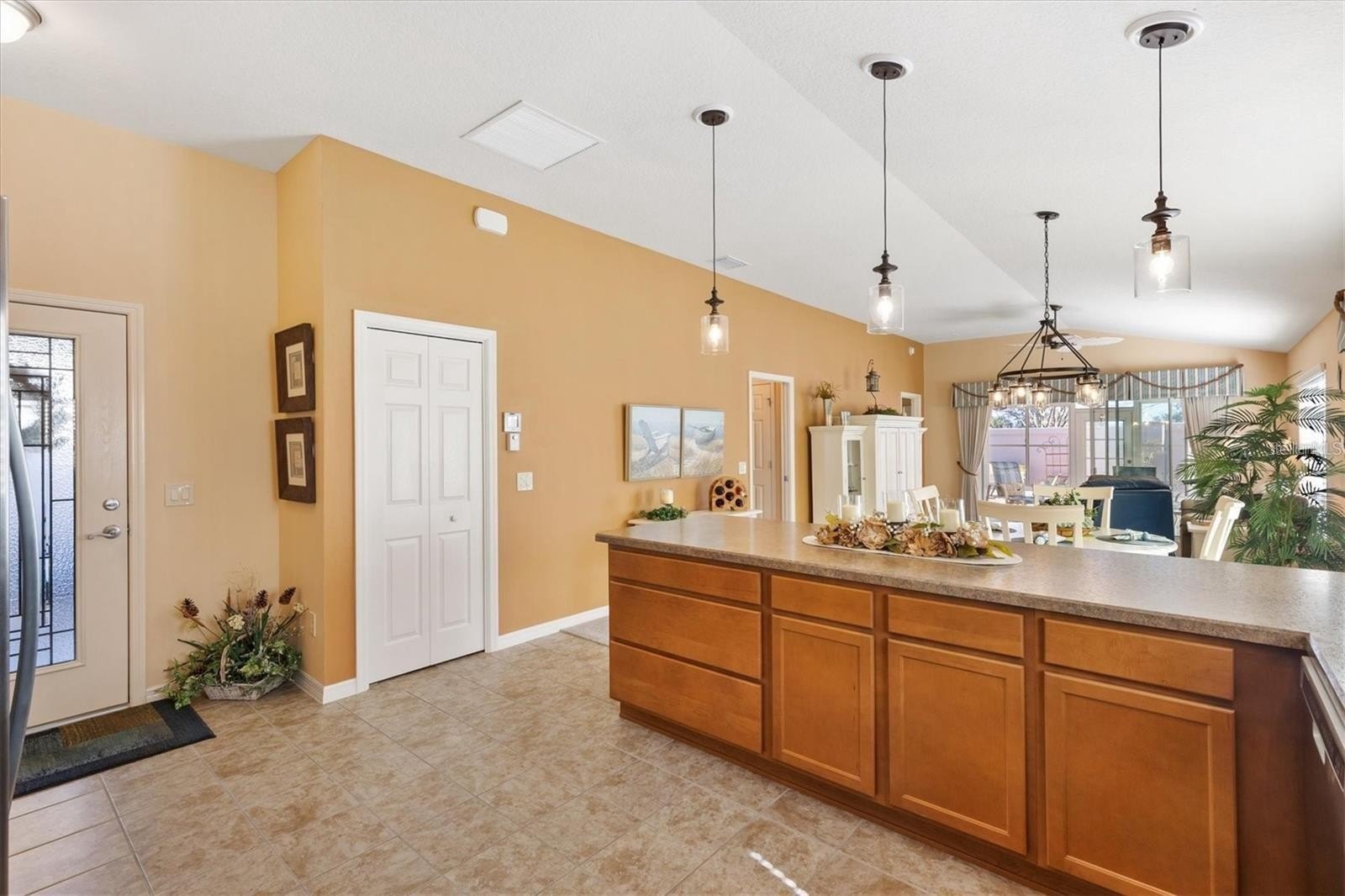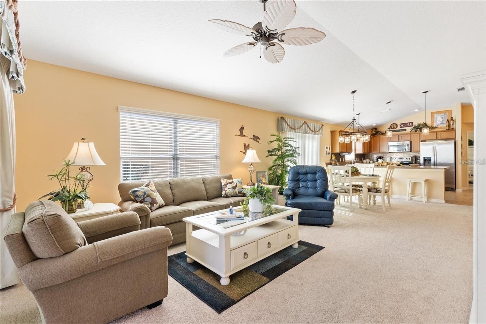 Walk up the epoxy driveway to the cozy front porch. Enter through the upgraded leaded glass front door w/sliding screen for cooler nights. Notice the large kitchen with stainless steel appliances. Large counter top with barstools for extra seating. Kitchen dining room area with sliding glass door wall lets in plenty of natural lighting. High ceilings adds an open airy feeling throughout. Large primary bedroom suite has an eye catching tray ceiling, plus bathroom and walk in closet. Easy access door-wall leading to the recently upgraded ( 2025 ) enclosed glass lanai. Other upgrades are the UV extra fine screening plus tinted glass windows make this special lanai a great living space to get cozy with your favorite book or to entertain your guests. Convenient Split floor plan is great for privacy when company visits. Two guest bedrooms and guest bathroom are separated from the primary bedroom. Another plus is the Indoor laundry room with utility sink. New Water Reverse Osmosis Filtrations system in Kitchen. Garage has epoxy floors.