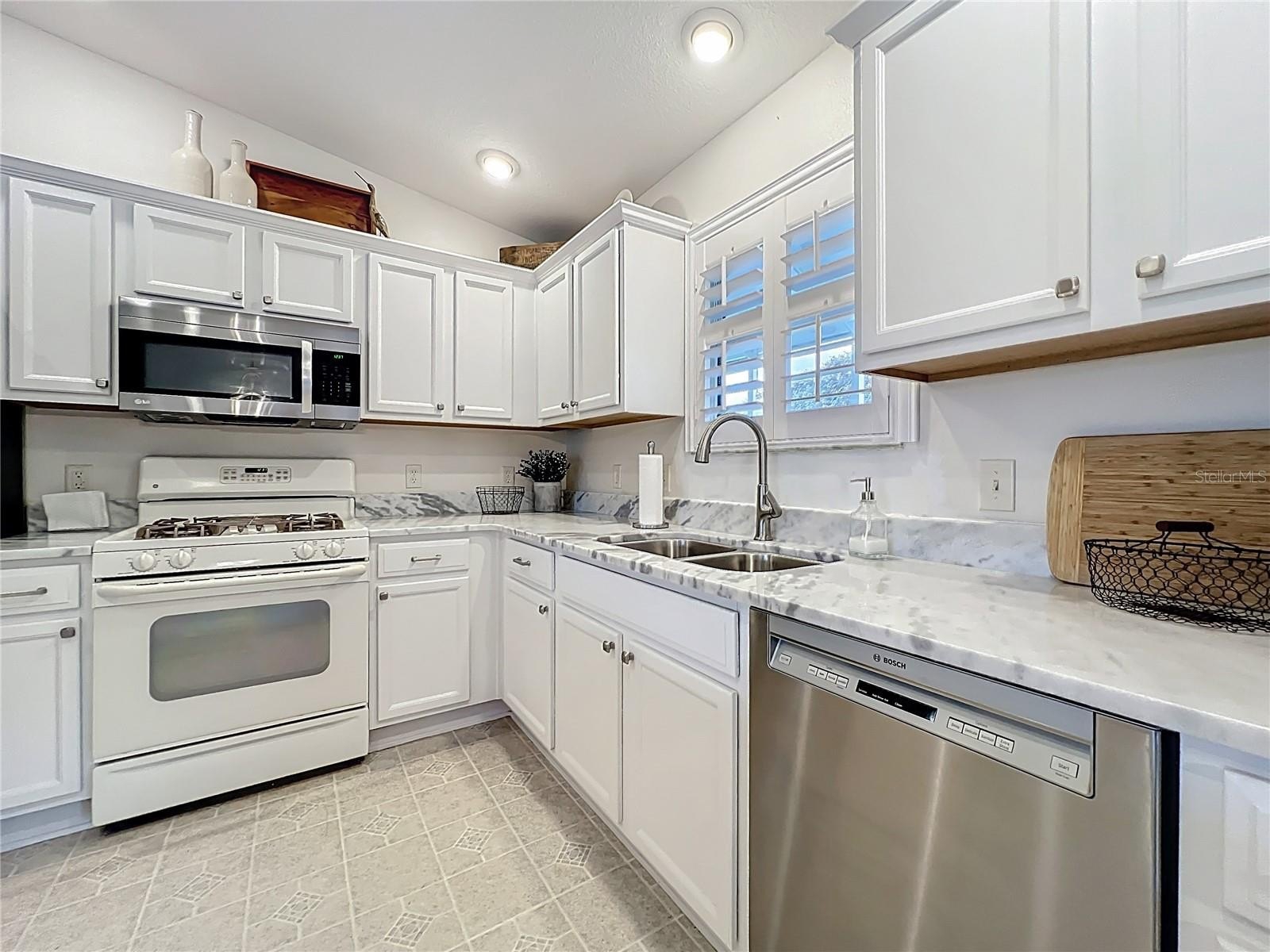 The updated kitchen features stone countertops, crisp clean cabinetry, and plenty of workspace for cooking and entertaining. Both bathrooms have been completely renovated with solar lights, including the spacious primary bath with dual sinks.