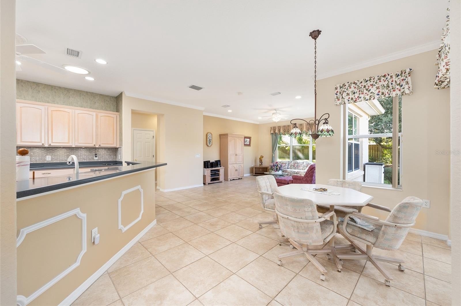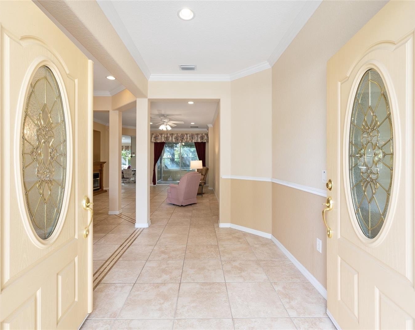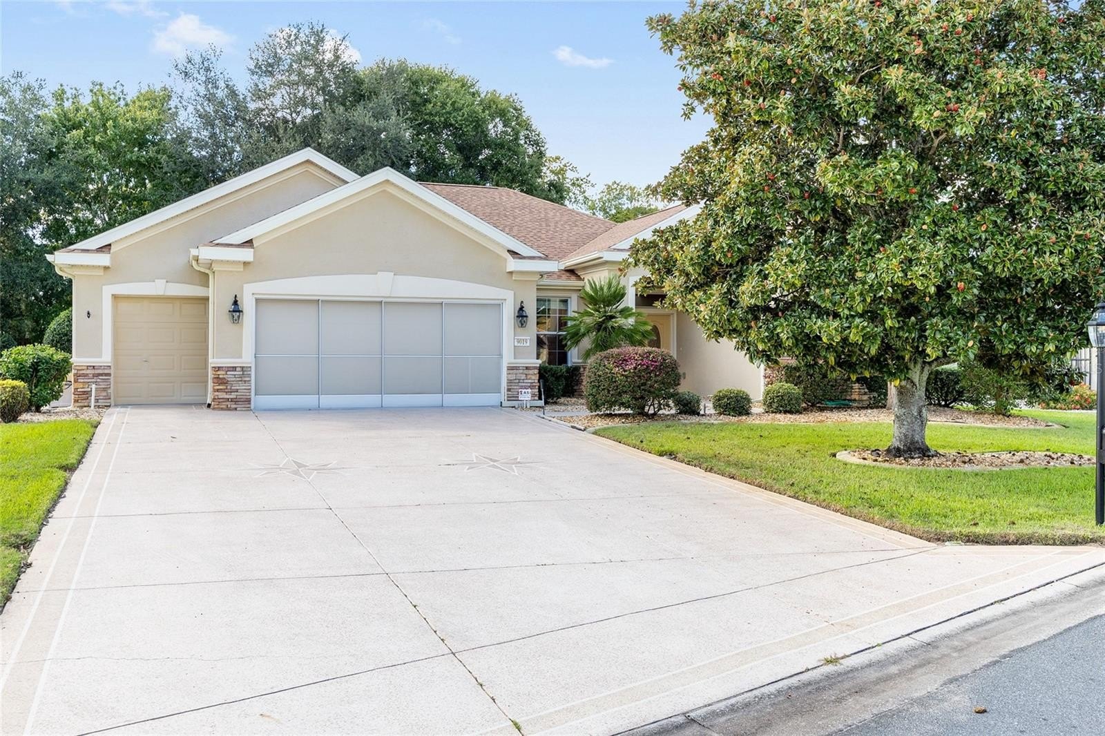 Looking for one of the most sought-after models in Del Webb? This Kingston 3-bedroom, 2-bath home sits on a private, professionally landscaped lot and offers exceptional comfort and style. You’ll love the spacious floor plan featuring a dining room, living room, and large family room, with ceramic tile throughout except for the bedrooms, which have beautiful engineered wood flooring. The updated kitchen boasts stainless steel appliances, including a gas range, bottom-freezer refrigerator, and 42” cabinets with over and under lighting. Two solar tubes and recessed lighting add brightness throughout. The living room features an electric fireplace, and the dining room is enhanced with recessed lights and a chandelier. Photos of 2 guest bedrooms and lanai are virtual. some furnitures available Enjoy year-round relaxation in the enclosed lanai, level with the main flooring, finished in ceramic tile, and equipped with its own mini-split heating and cooling system. Step outside to the 17x14 paver patio with an 18-foot Sunsetter manual awning and dusk-to-dawn lighting — perfect for outdoor enjoyment. The primary bedroom features a tray ceiling and crown molding, with an en-suite offering raised vanities, a large shower with bench, and a separate soaking tub. The indoor laundry room includes a Bosch washer and dryer (new 2024), plenty of cabinets, and a folding counter. Additional highlights include R30 insulation throughout, an extended 4-foot garage with golf cart garage, drop-down attic stairs, and a mini-split HVAC in the garage. Major updates include new roof (2024), HVAC (2021), Rinnai tankless hot water system, and a security system. Don’t miss this exceptional home — call today to schedule your private showing! Photos of 2 guest bedrooms with furniture and lanai are virtual.