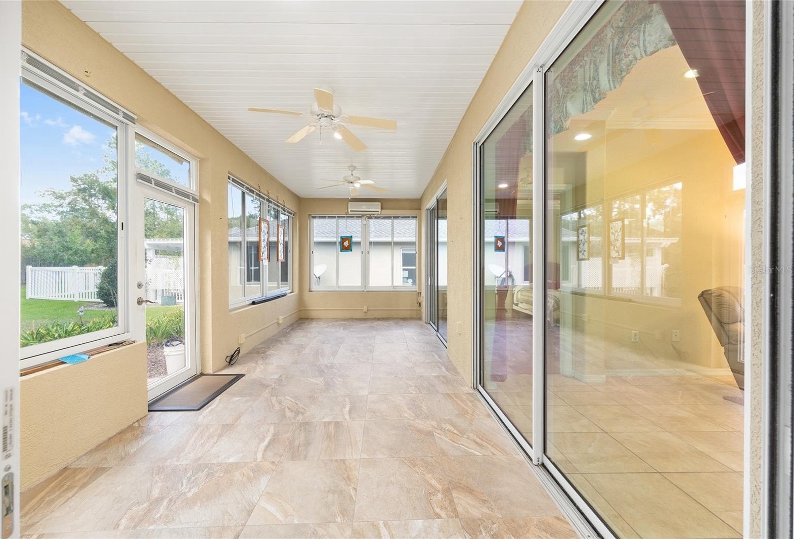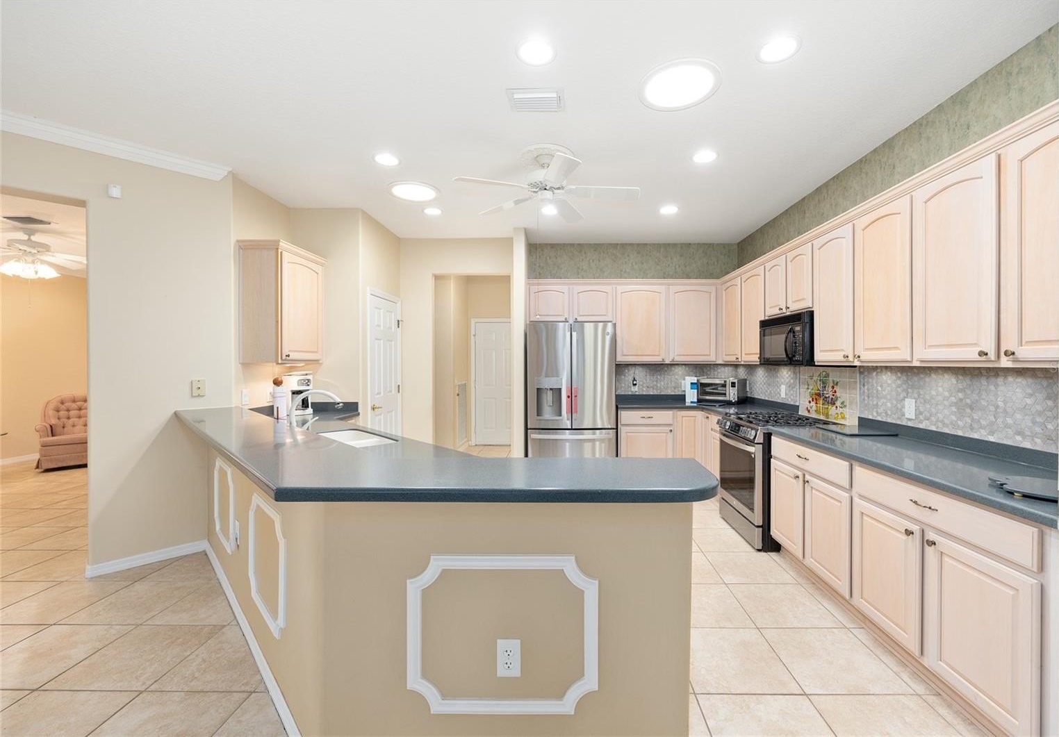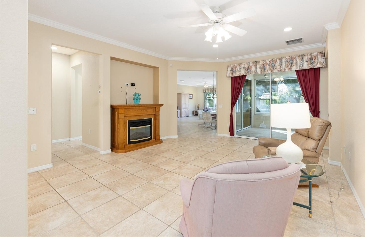 Looking for one of the most sought-after models in Del Webb? This Kingston 3-bedroom, 2-bath home sits on a private, professionally landscaped lot and offers exceptional comfort and style. You’ll love the spacious floor plan featuring a dining room, living room, and large family room, with ceramic tile throughout except for the bedrooms, which have beautiful engineered wood flooring. The updated kitchen boasts stainless steel appliances, including a gas range, bottom-freezer refrigerator, and 42” cabinets with over and under lighting. Two solar tubes and recessed lighting add brightness throughout. The living room features an electric fireplace, and the dining room is enhanced with recessed lights and a chandelier. Photos of 2 guest bedrooms and lanai are virtual. some furnitures available Enjoy year-round relaxation in the enclosed lanai, level with the main flooring, finished in ceramic tile, and equipped with its own mini-split heating and cooling system. Step outside to the 17x14 paver patio with an 18-foot Sunsetter manual awning and dusk-to-dawn lighting — perfect for outdoor enjoyment. The primary bedroom features a tray ceiling and crown molding, with an en-suite offering raised vanities, a large shower with bench, and a separate soaking tub. The indoor laundry room includes a Bosch washer and dryer (new 2024), plenty of cabinets, and a folding counter. Additional highlights include R30 insulation throughout, an extended 4-foot garage with golf cart garage, drop-down attic stairs, and a mini-split HVAC in the garage. Major updates include new roof (2024), HVAC (2021), Rinnai tankless hot water system, and a security system. Don’t miss this exceptional home — call today to schedule your private showing! Photos of 2 guest bedrooms with furniture and lanai are virtual.