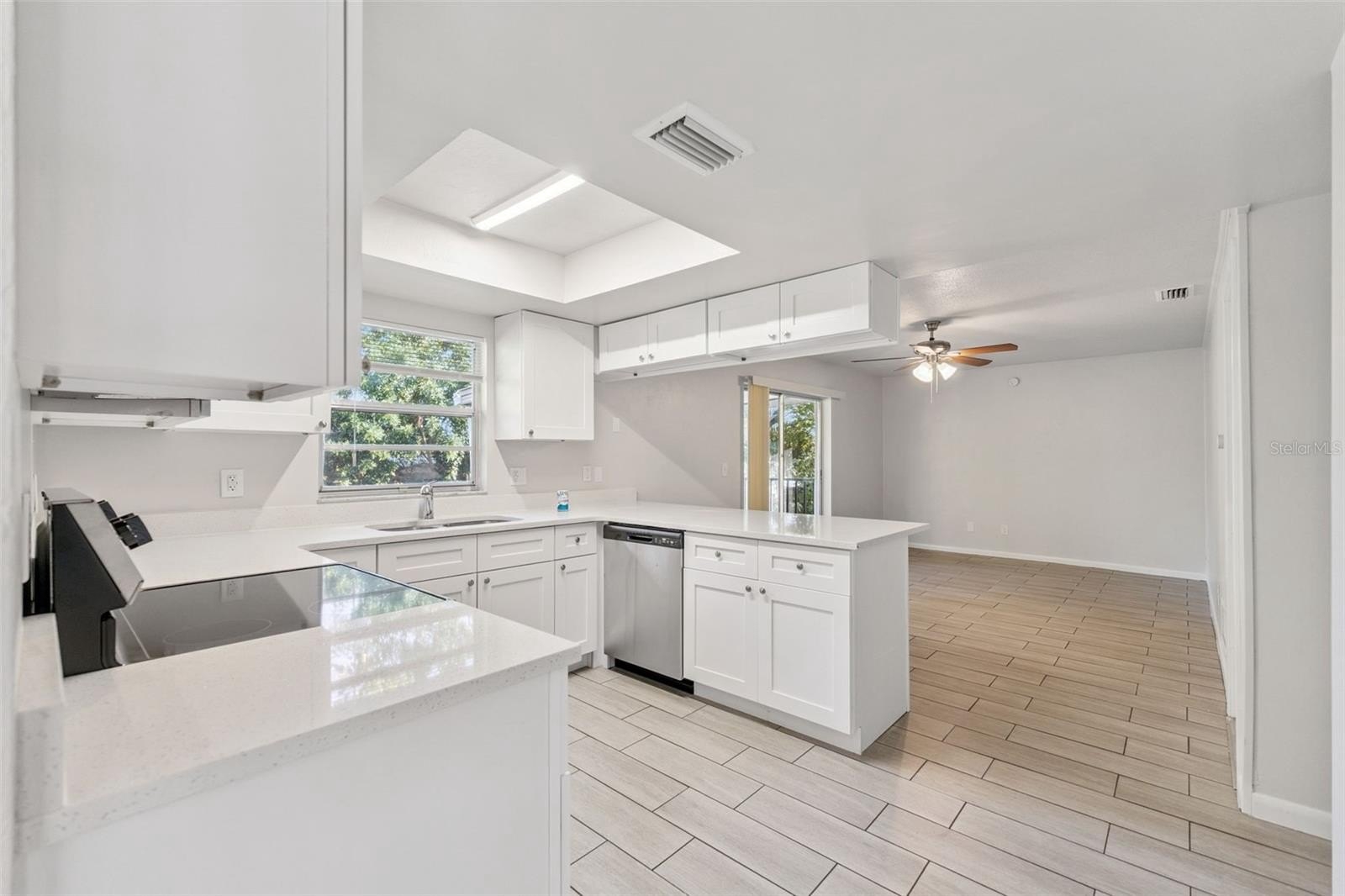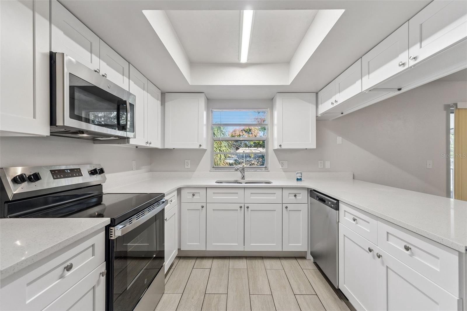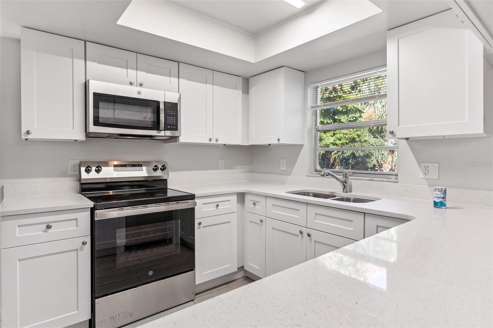 Step inside to find a layout featuring new flooring, updated lighting, and stylish finishes throughout. The kitchen boasts updated cabinets, sleek appliances, and ample counter space, making it ideal for both everyday living and entertaining. Both bathrooms have been upgraded with new vanities, toilets, and contemporary fixtures, adding a fresh and elegant touch.