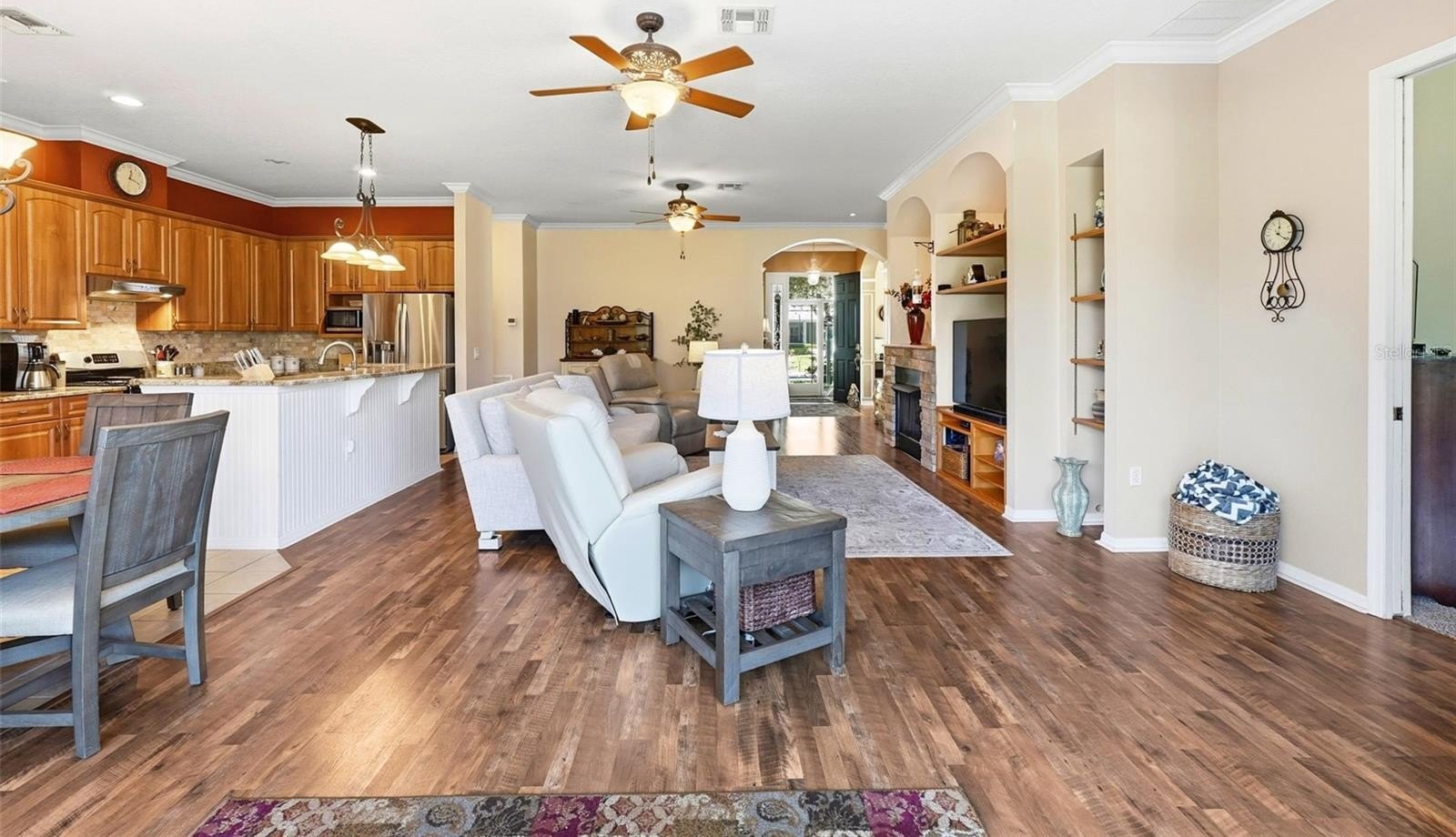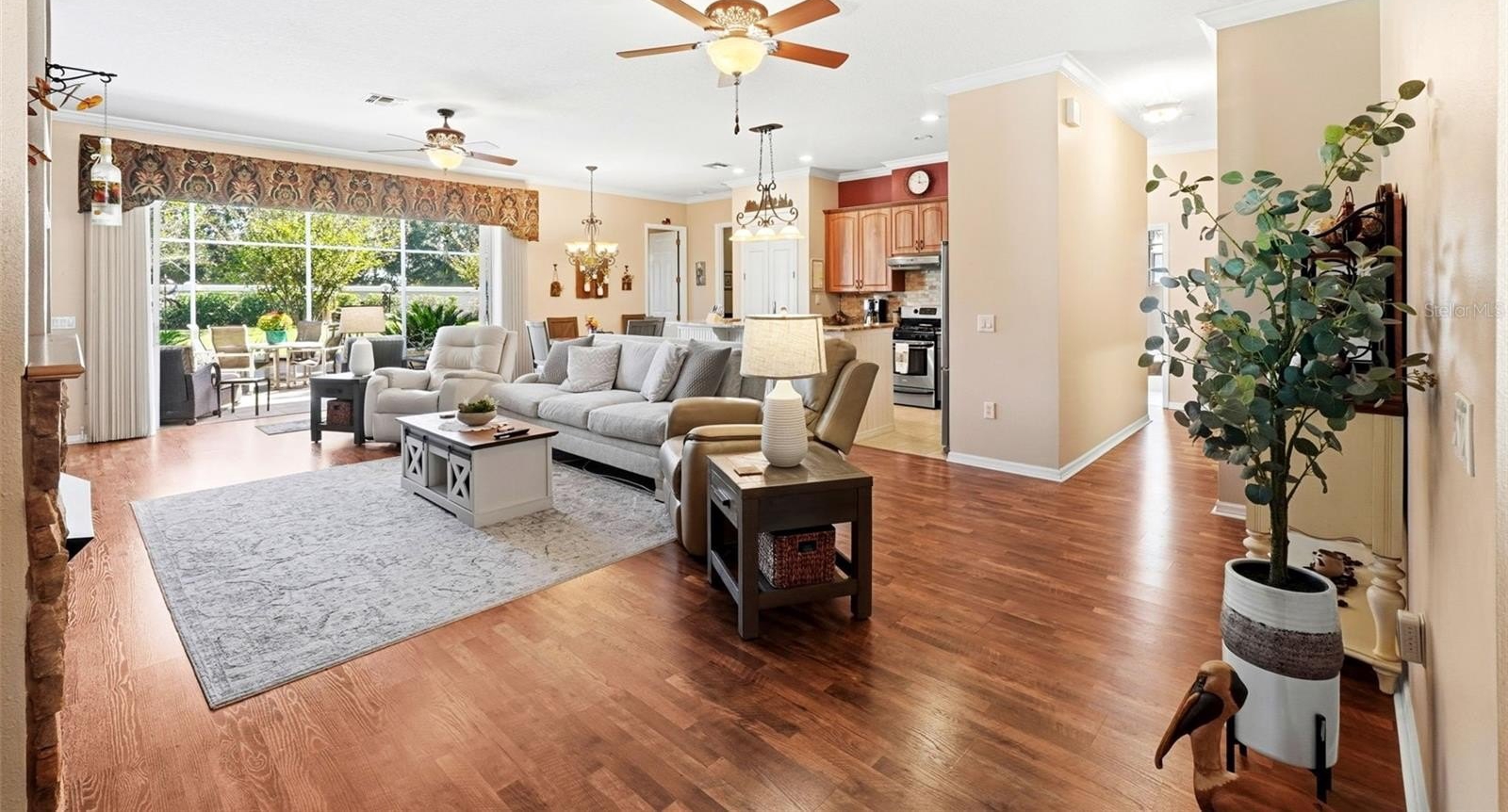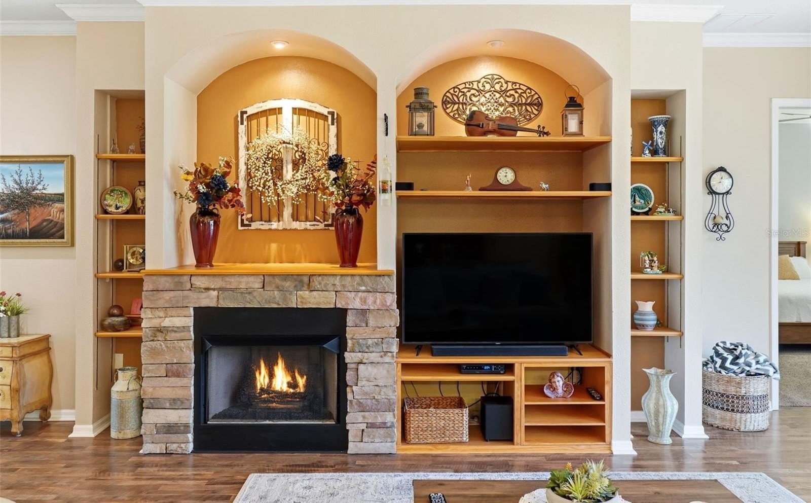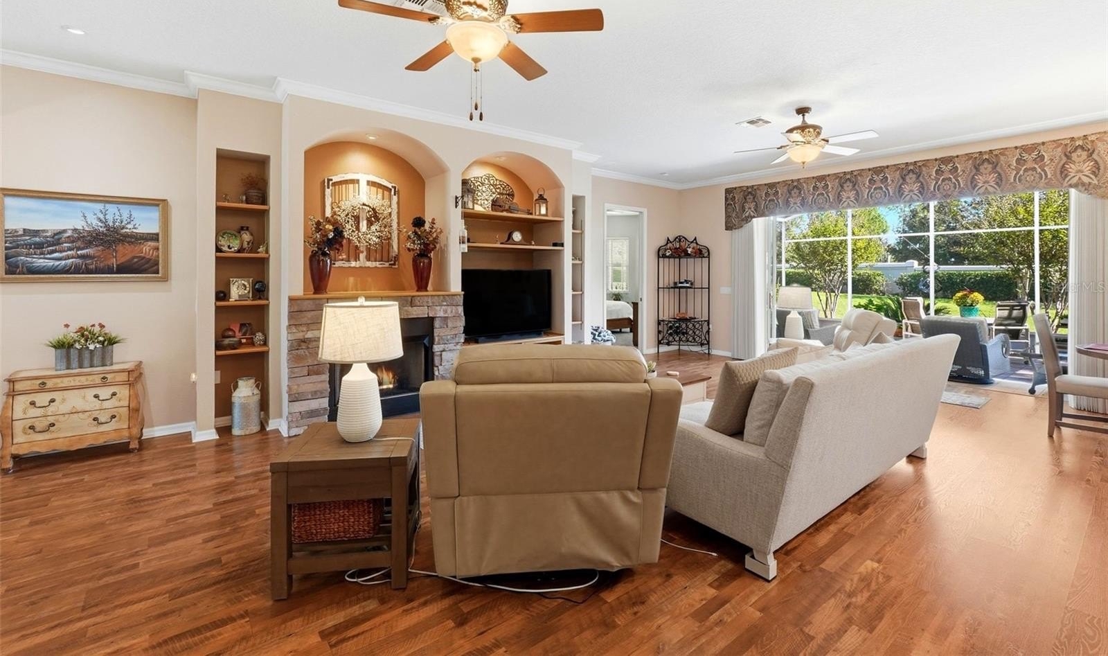 Welcome to this beautifully maintained home in the sought-after 24 hour guard-gated community of Summit Greens! This thoughtfully designed residence features a flexible split-bedroom floorplan with a bonus third guest room (no closet) and a host of desirable upgrades. Enjoy gas utilities including a newer water heater (3 years), gas range, and a cozy gas fireplace. The home also offers granite countertops, stainless steel appliances, and crown molding for an elegant touch. Relax or entertain in the expanded, 29' x 18, screen-enclosed patio with no rear neighbors for added privacy. The expanded garage provides space for a workshop or golf cart, while the widened driveway offers extra parking. With laminate and tile flooring throughout the main living areas and carpeted bedrooms, this home combines comfort and style. Located in one of Clermont’s premier 55+ communities, residents of Summit Greens enjoy resort-style amenities including a clubhouse, fitness center, pool, tennis courts (including clay), pickelball courts, walking trails, and vibrant social activities—all just minutes from shopping, dining, and major highways.