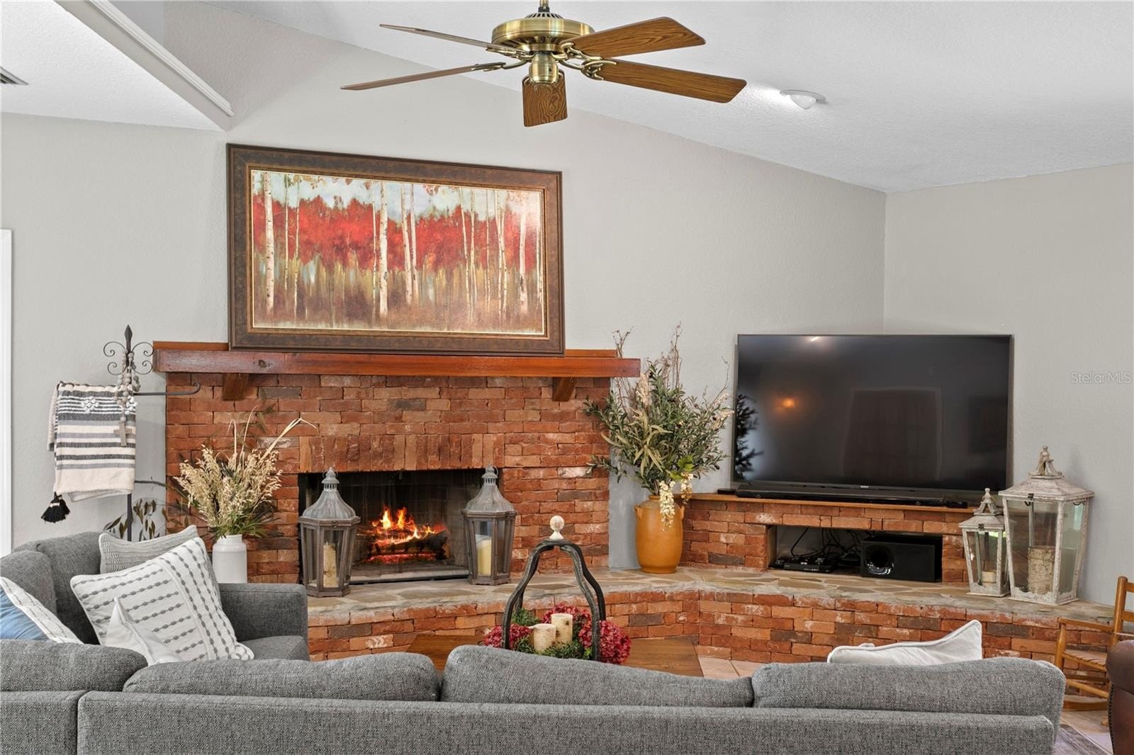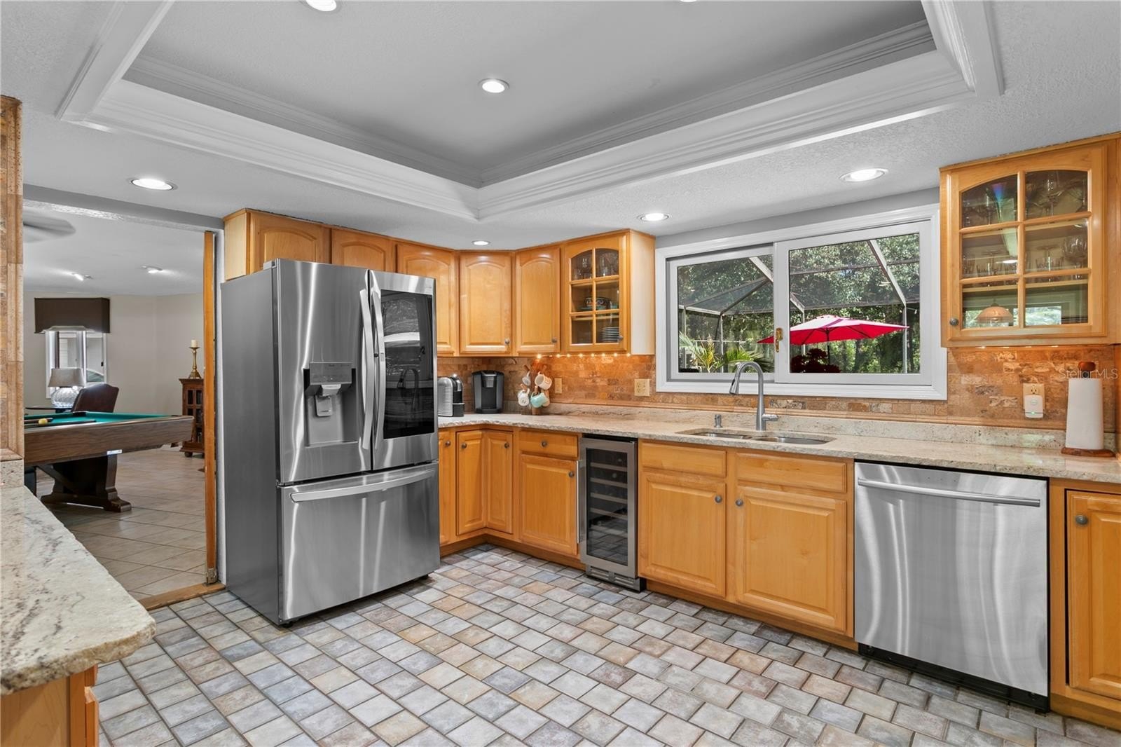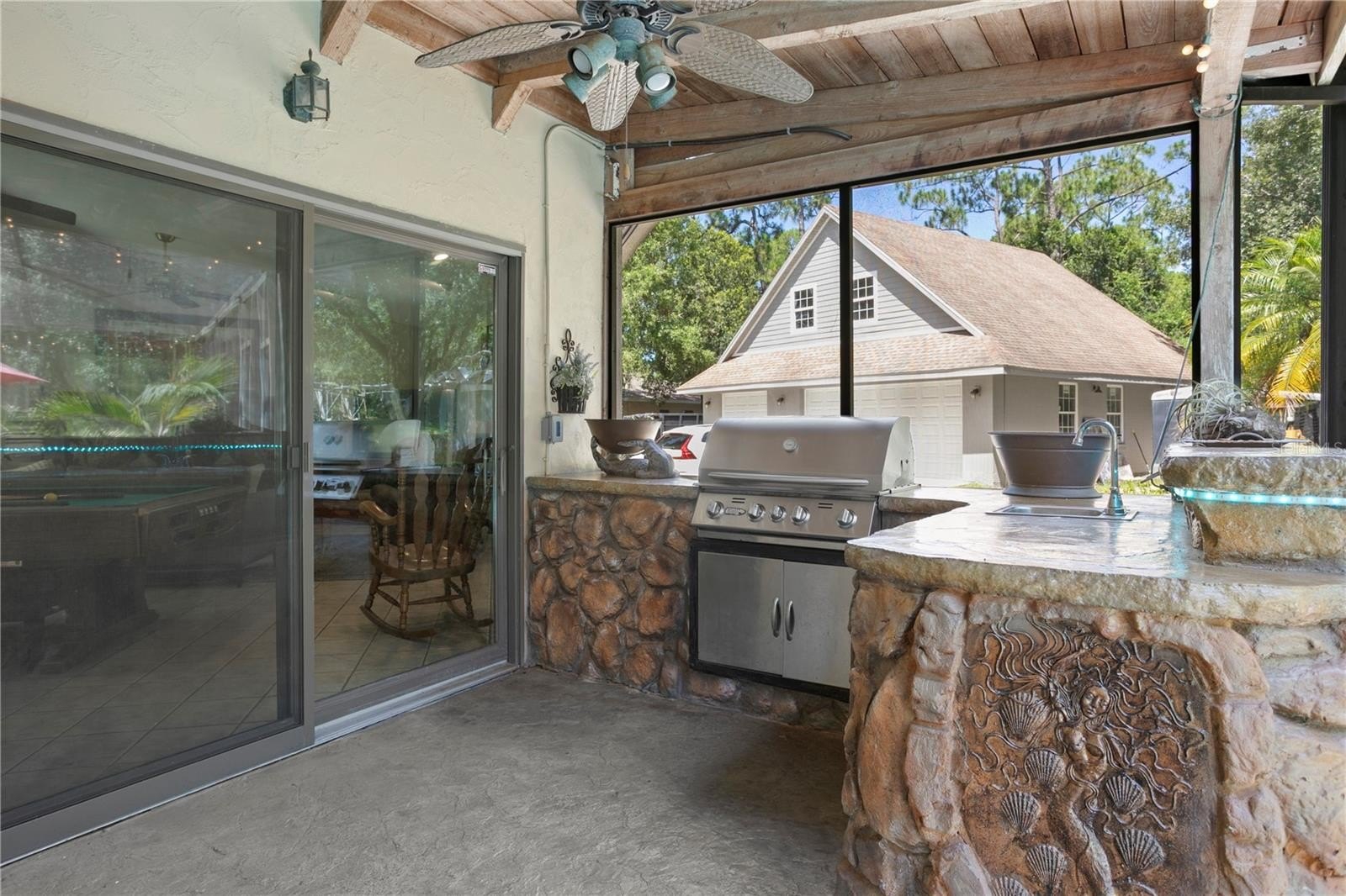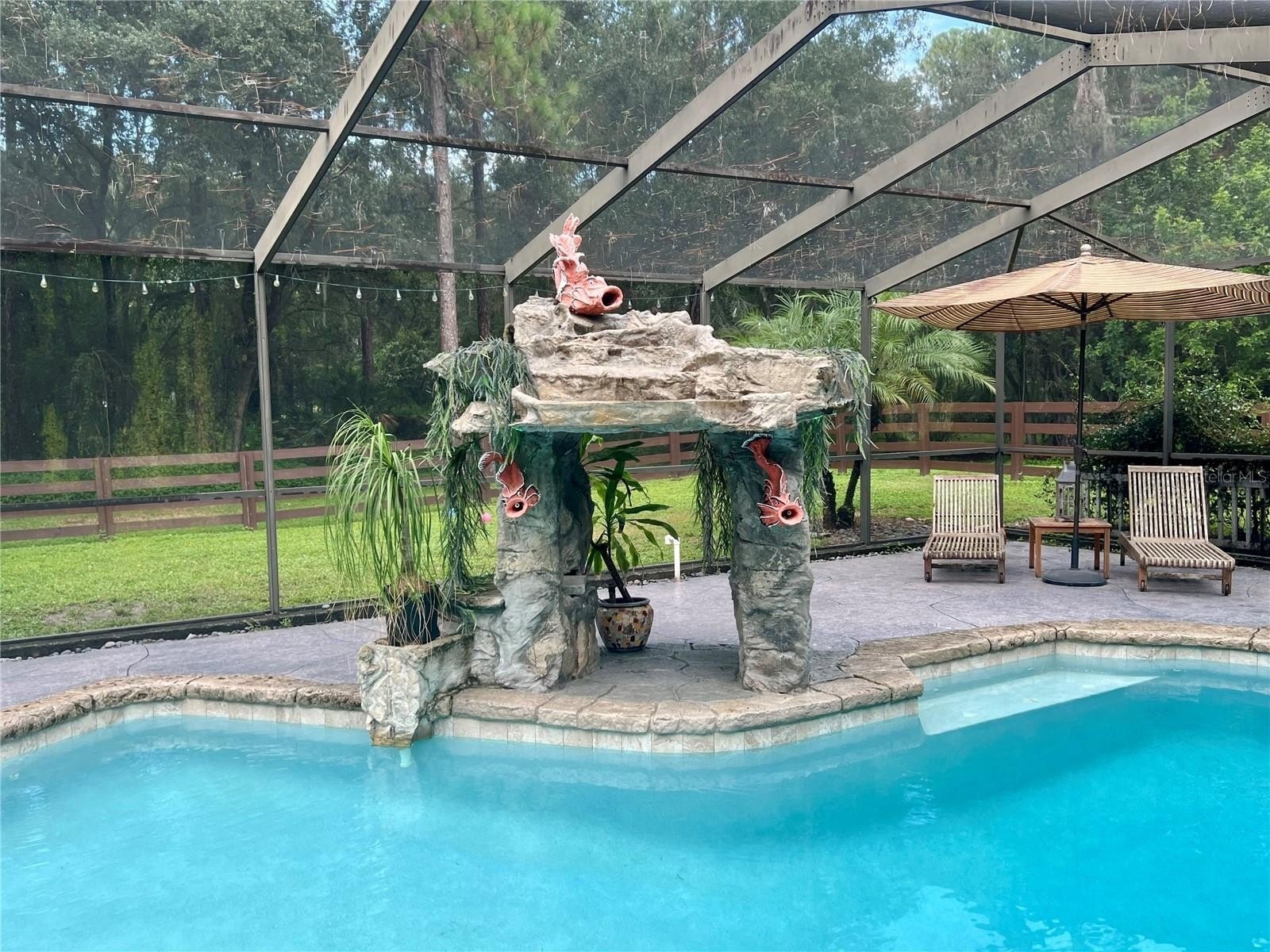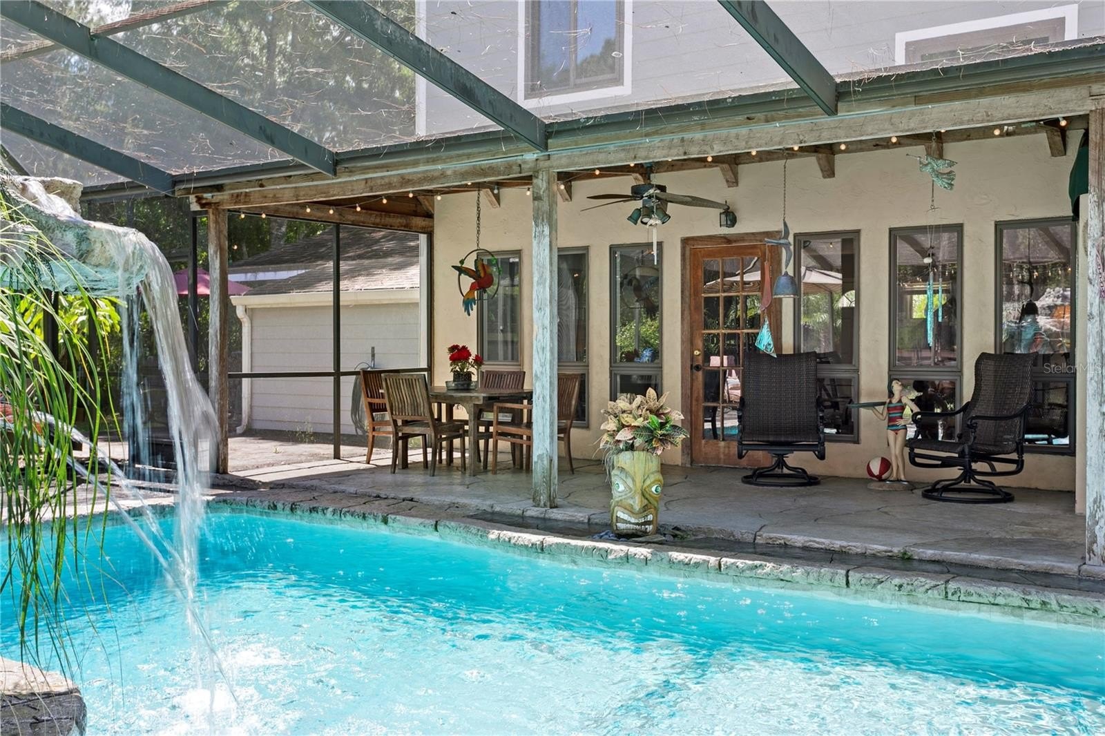 where thoughtful design and warmth unfold. As you step inside, the formal living and dining room offers a spacious feel, the first of two wood-burning fireplaces, a convenient half bath, and French doors that open to the lanai and pool area, creating a seamless indoor-outdoor flow. The layout includes five bedrooms and three and a half baths, with the primary suite privately tucked away on the first floor. This primary bedroom offers high ceilings, a spa-like bath, a walk-in closet with custom built-ins, and a recently updated impact slider for private access to the outdoors. The kitchen is full of charm and function, with Granite natural edge countertops, newer stainless-steel appliances, a wine fridge, and a built-in breakfast nook. A pass-through window connects to the lanai, and just off the kitchen, a second living room with another fireplace and bay window invites you to unwind. Passing through the living room, an impressive private guest suite with its own full bath and separate entrance provides ideal space for guests or games, theater, or music. Maybe a home office. Upstairs, three additional bedrooms and a full bath offers flexible living, work, or hobby space. Outside, enjoy a screen-enclosed, handcrafted, grotto-style pool, handcrafted outdoor kitchen, and both gas and wood-burning fire pits, perfect for entertaining or peaceful evenings at home. The fenced yard offers space for furry friends to roam.