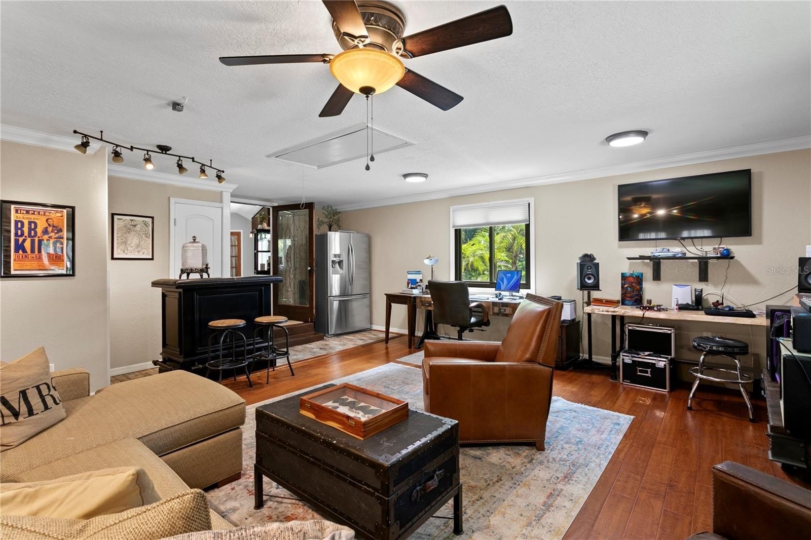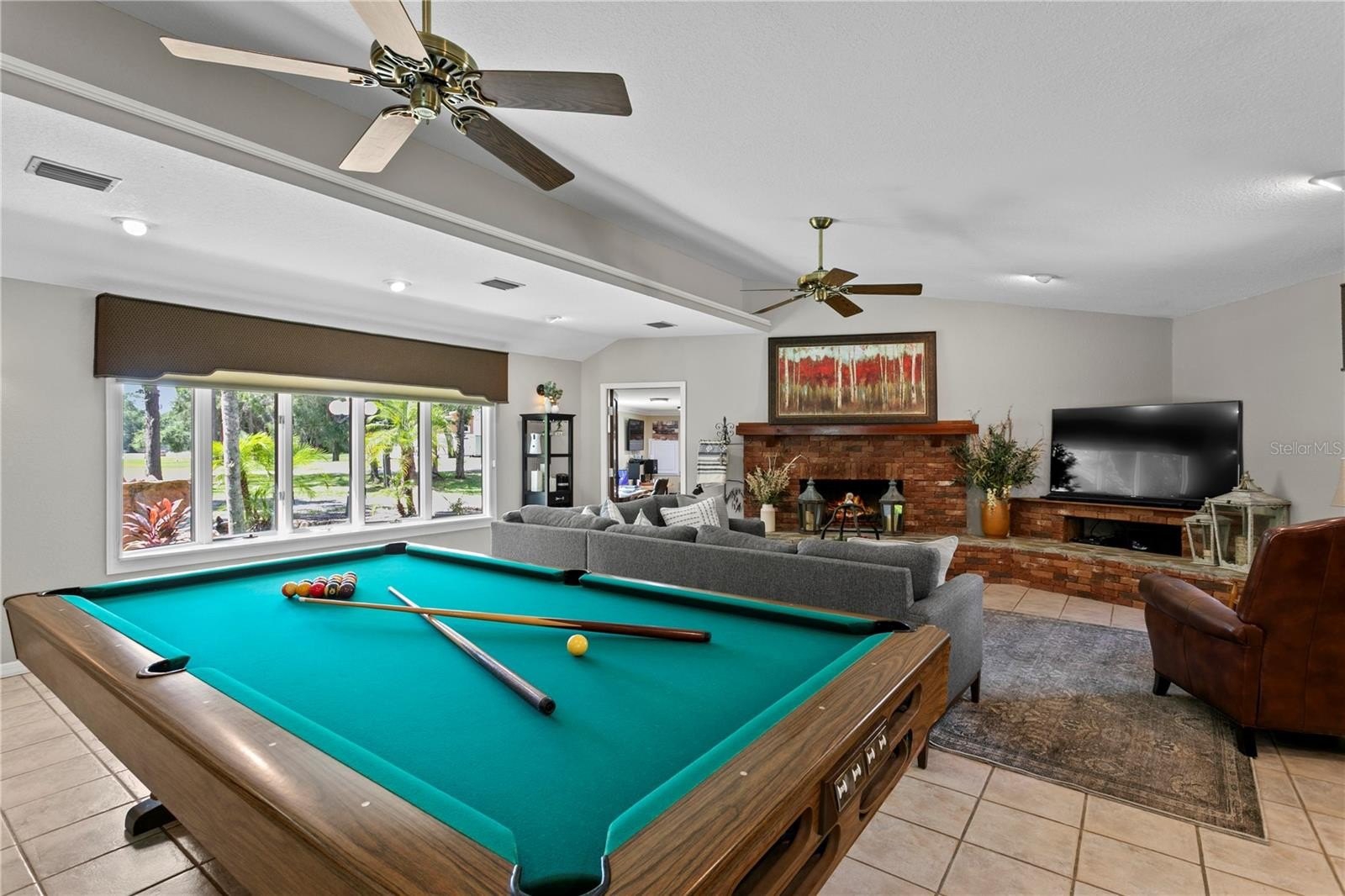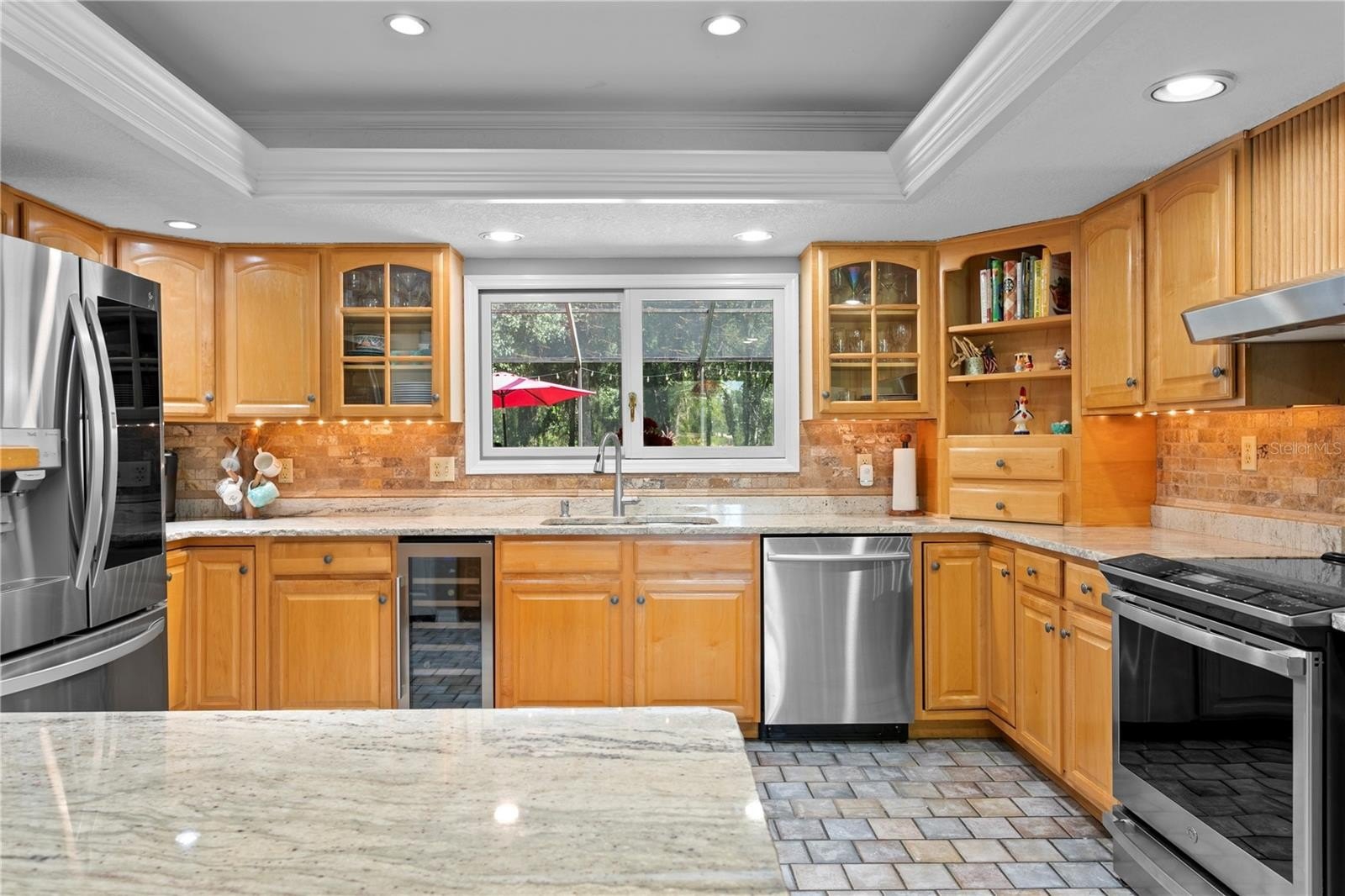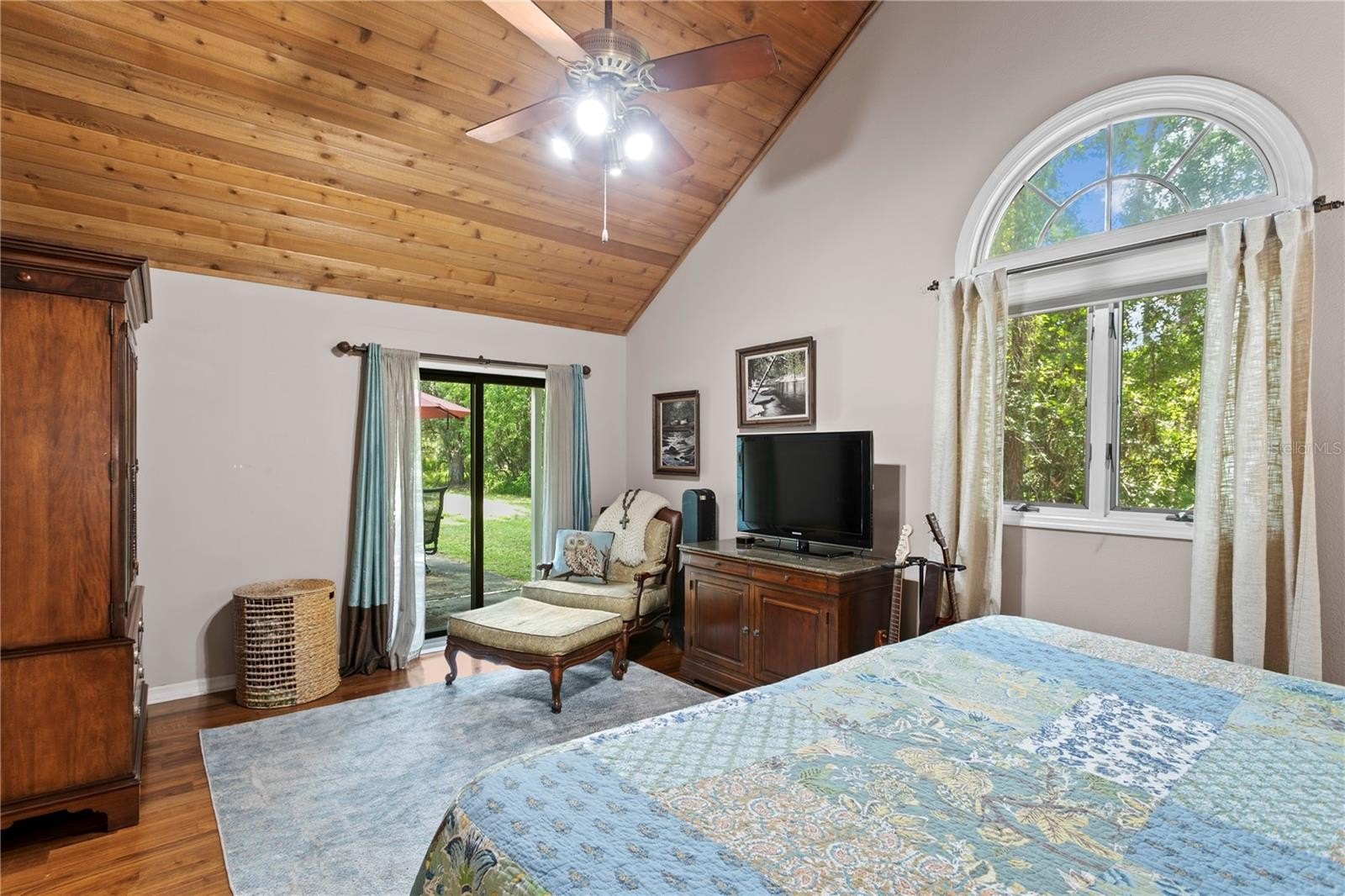 where thoughtful design and warmth unfold. As you step inside, the formal living and dining room offers a spacious feel, the first of two wood-burning fireplaces, a convenient half bath, and French doors that open to the lanai and pool area, creating a seamless indoor-outdoor flow. The layout includes five bedrooms and three and a half baths, with the primary suite privately tucked away on the first floor. This primary bedroom offers high ceilings, a spa-like bath, a walk-in closet with custom built-ins, and a recently updated impact slider for private access to the outdoors. The kitchen is full of charm and function, with Granite natural edge countertops, newer stainless-steel appliances, a wine fridge, and a built-in breakfast nook. A pass-through window connects to the lanai, and just off the kitchen, a second living room with another fireplace and bay window invites you to unwind. Passing through the living room, an impressive private guest suite with its own full bath and separate entrance provides ideal space for guests or games, theater, or music. Maybe a home office. Upstairs, three additional bedrooms and a full bath offers flexible living, work, or hobby space. Outside, enjoy a screen-enclosed, handcrafted, grotto-style pool, handcrafted outdoor kitchen, and both gas and wood-burning fire pits, perfect for entertaining or peaceful evenings at home. The fenced yard offers space for furry friends to roam.
