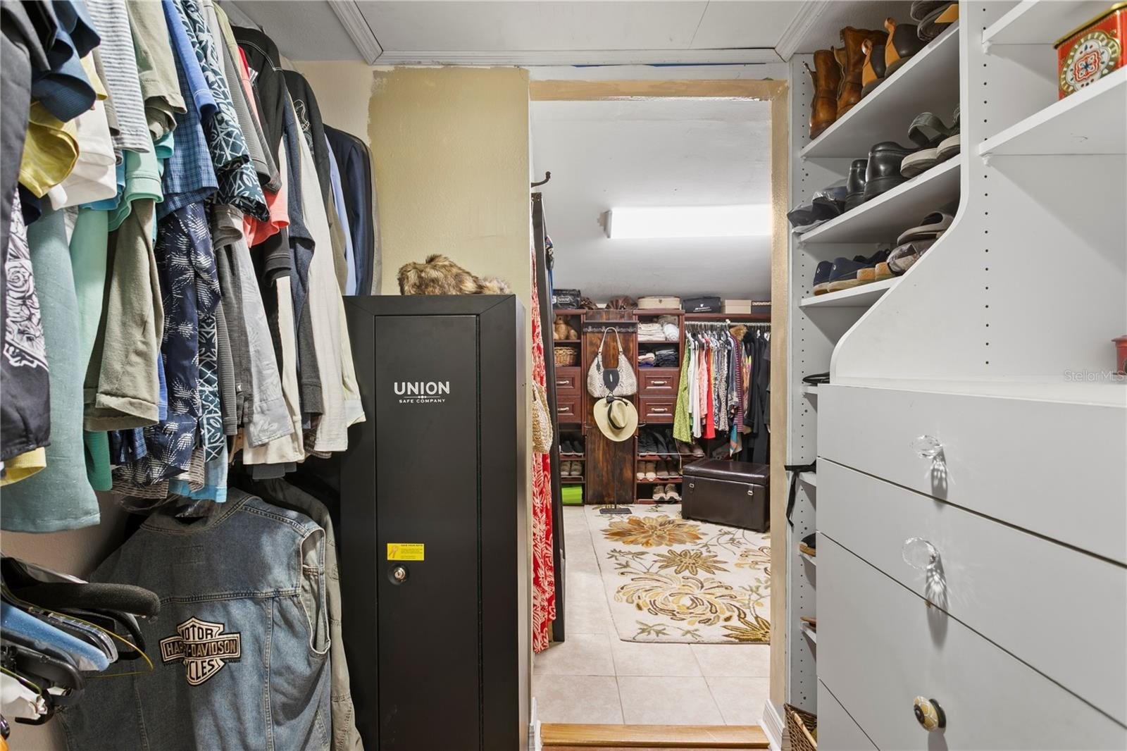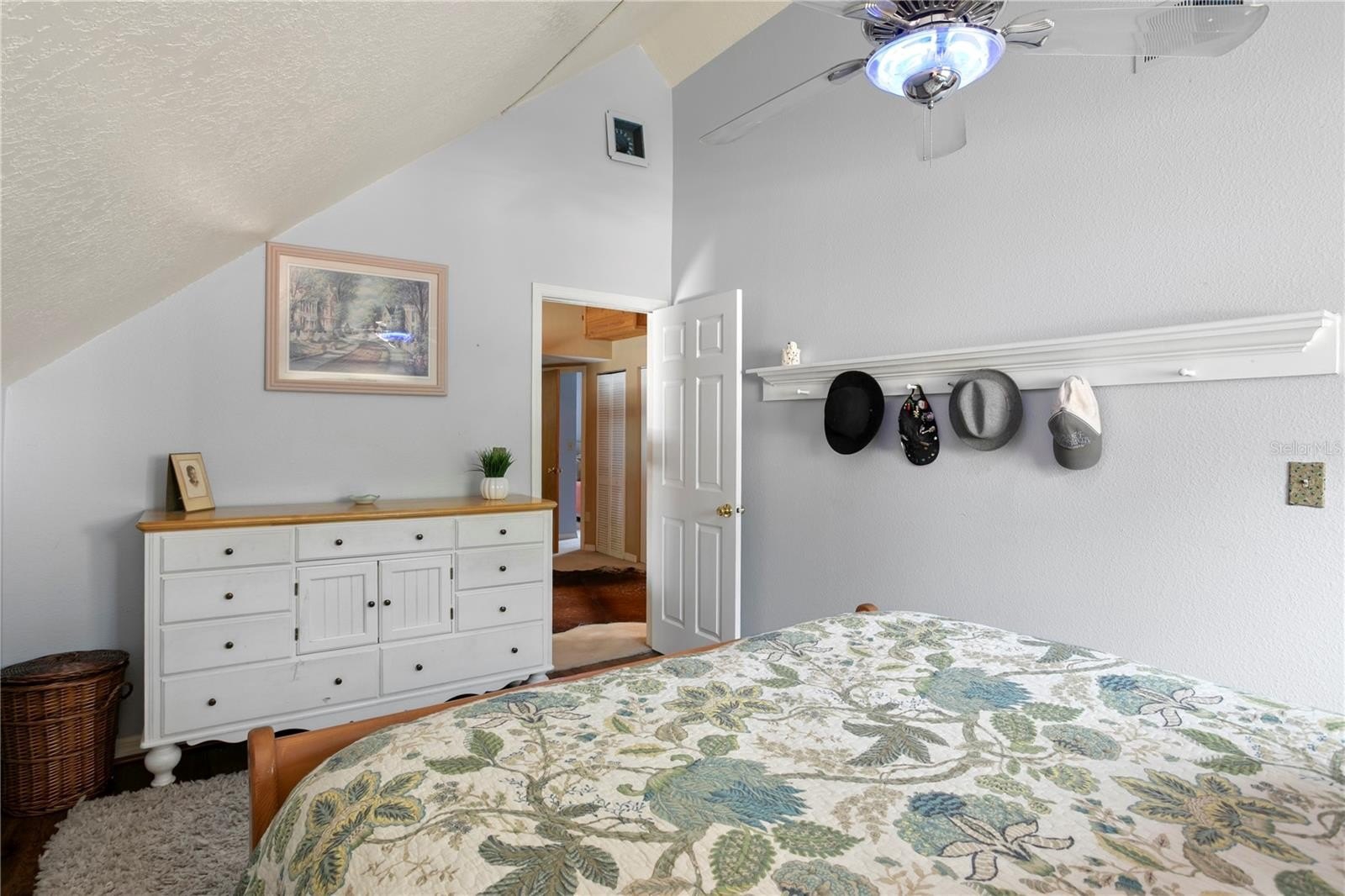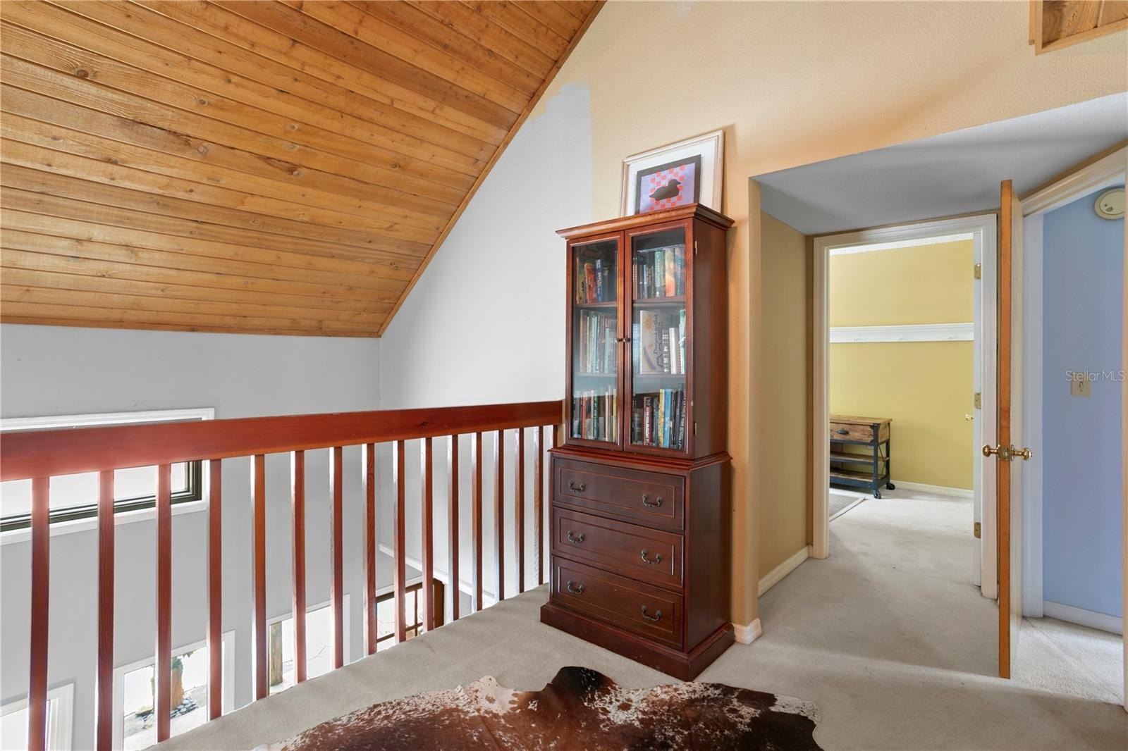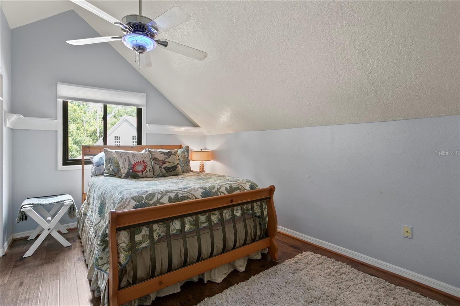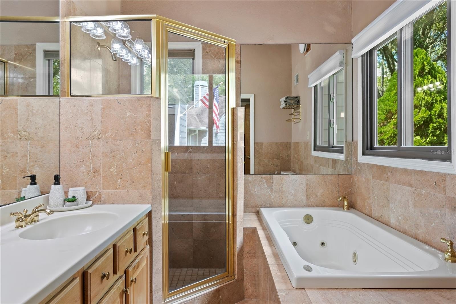 where thoughtful design and warmth unfold. As you step inside, the formal living and dining room offers a spacious feel, the first of two wood-burning fireplaces, a convenient half bath, and French doors that open to the lanai and pool area, creating a seamless indoor-outdoor flow. The layout includes five bedrooms and three and a half baths, with the primary suite privately tucked away on the first floor. This primary bedroom offers high ceilings, a spa-like bath, a walk-in closet with custom built-ins, and a recently updated impact slider for private access to the outdoors. The kitchen is full of charm and function, with Granite natural edge countertops, newer stainless-steel appliances, a wine fridge, and a built-in breakfast nook. A pass-through window connects to the lanai, and just off the kitchen, a second living room with another fireplace and bay window invites you to unwind. Passing through the living room, an impressive private guest suite with its own full bath and separate entrance provides ideal space for guests or games, theater, or music. Maybe a home office. Upstairs, three additional bedrooms and a full bath offers flexible living, work, or hobby space. Outside, enjoy a screen-enclosed, handcrafted, grotto-style pool, handcrafted outdoor kitchen, and both gas and wood-burning fire pits, perfect for entertaining or peaceful evenings at home. The fenced yard offers space for furry friends to roam.