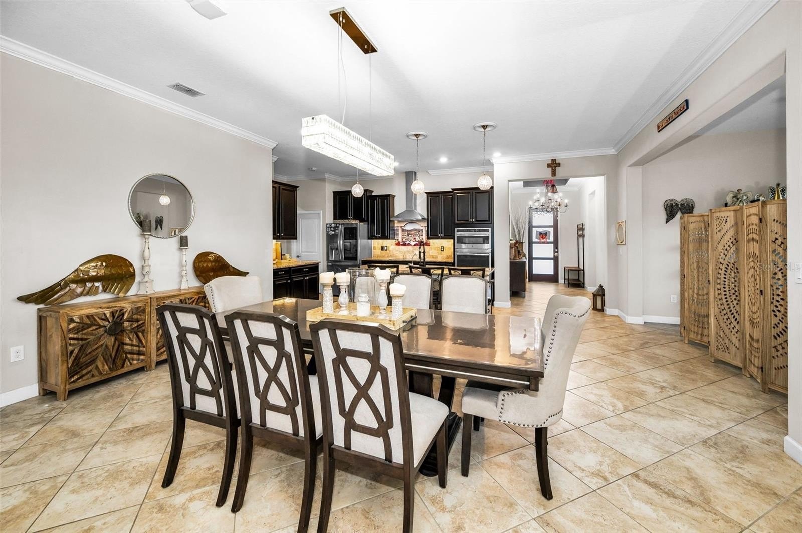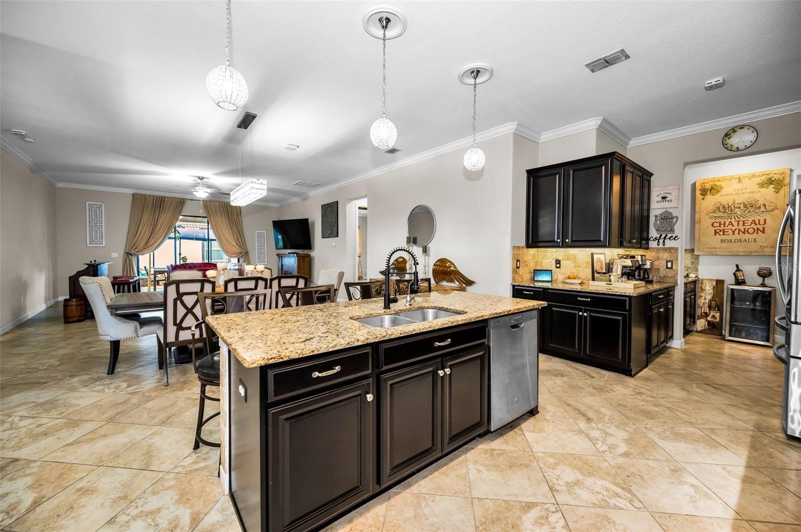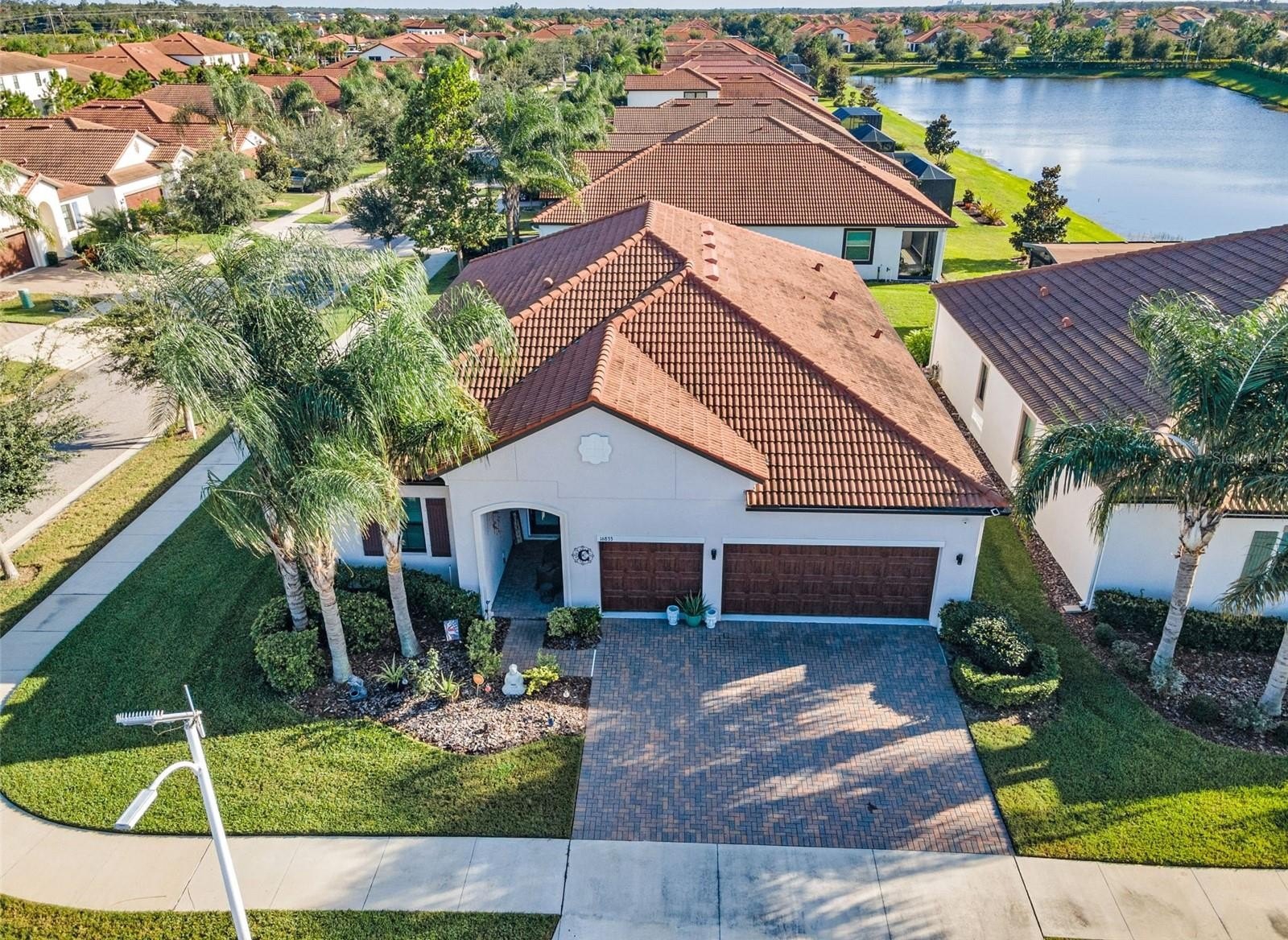 Welcome to your dream home! This stunning 3-bedroom, 3-bath residence offers over 2,600 sq. ft. of thoughtfully designed living space, blending modern construction with timeless details and a peaceful water view. From the moment you step inside, you’ll be greeted by soaring 10-foot ceilings, elegant crown molding, and an abundance of natural light that creates a warm and inviting atmosphere. The open-concept floor plan is ideal for both everyday living and entertaining. At the heart of the home, the gourmet kitchen features a spacious island, upgraded stone tile backsplash, a convenient butler’s pantry, and sleek stainless-steel appliances. Overlooking the dinette and living room, this layout makes hosting family and friends effortless. The living areas flow seamlessly onto the extended, screened-in lanai—an ideal spot to unwind or entertain while enjoying tranquil water views all year long. The master suite is a true retreat, complete with a tray ceiling, luxury vinyl flooring, and a spa-inspired bathroom featuring a walk-in shower, soaking tub, and a generous walk-in closet. Each additional bedroom also includes a walk-in closet, with the front bedroom offering its own private ensuite—perfect for guests. A versatile flex room provides endless possibilities, whether you envision a home office, bar area, or hobby space tailored to your lifestyle. Rounding out this exceptional home is a spacious 3-car garage, providing ample storage and convenience. The Medley Community Amenity Center offers fun for all with a resort style pool with lap pool, fitness center, card room, billiard room, pickle ball and bocce ball courts, as well as its own restaurant which is open for lunch and dinner. Since Medley is within Southshore Bay, you may also enjoy other amenities such as the Metro Lagoon by Crystal Lagoons, cabanas, sand volleyball, and much more. You must see this one to believe all it has to offer! This move-in-ready home is designed for comfort, functionality, and modern living. Don't miss the opportunity to make it yours!