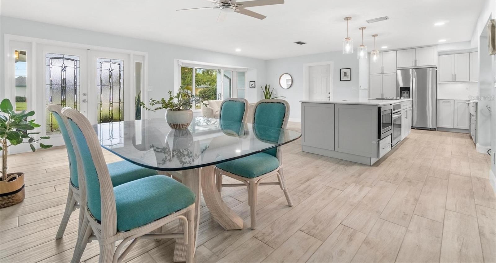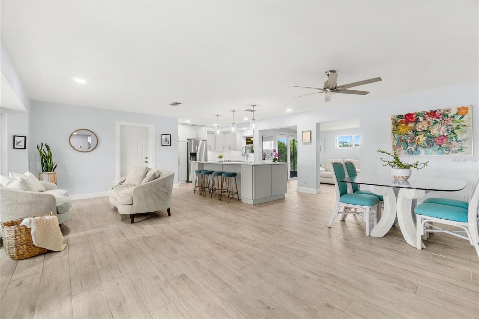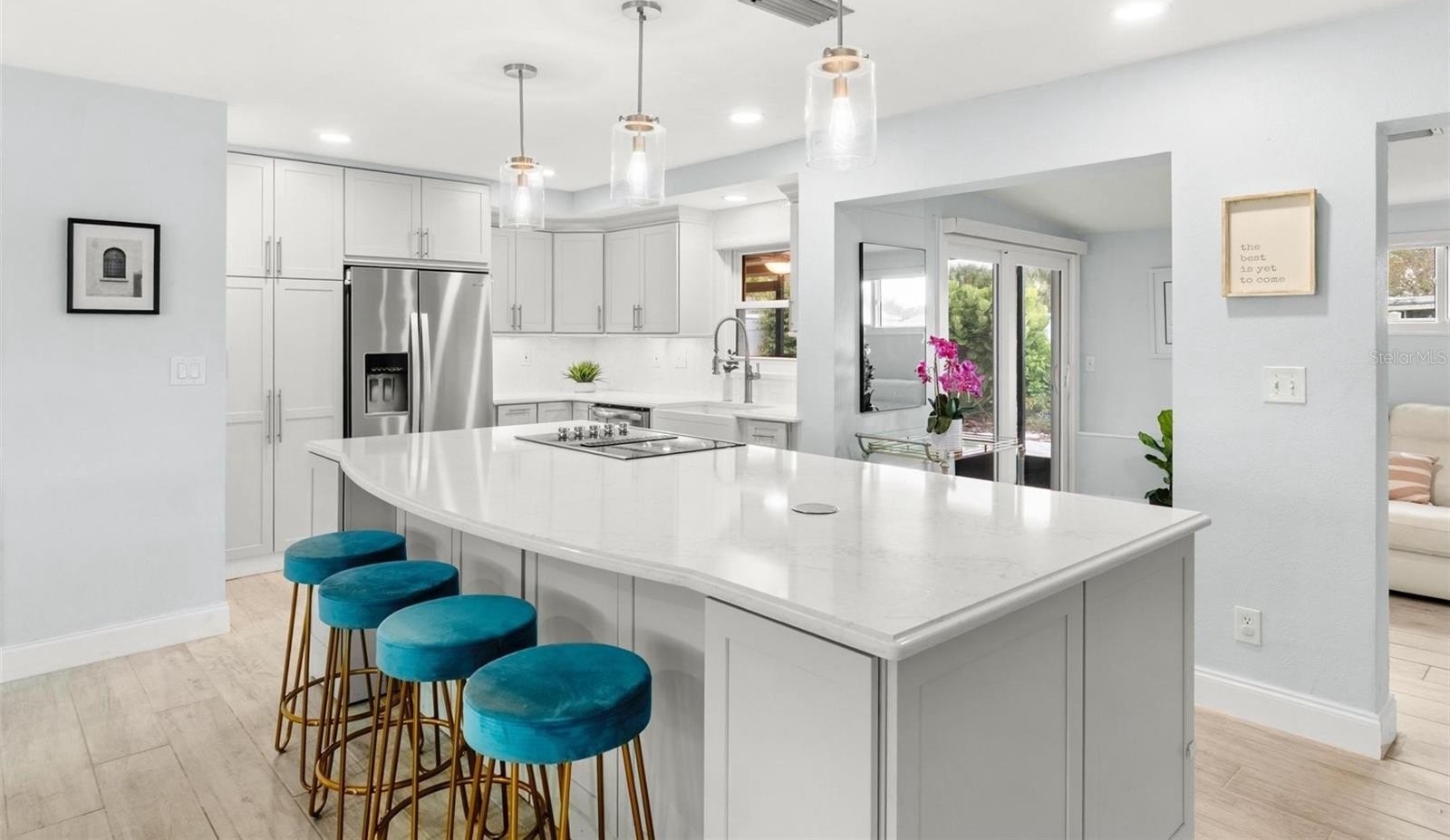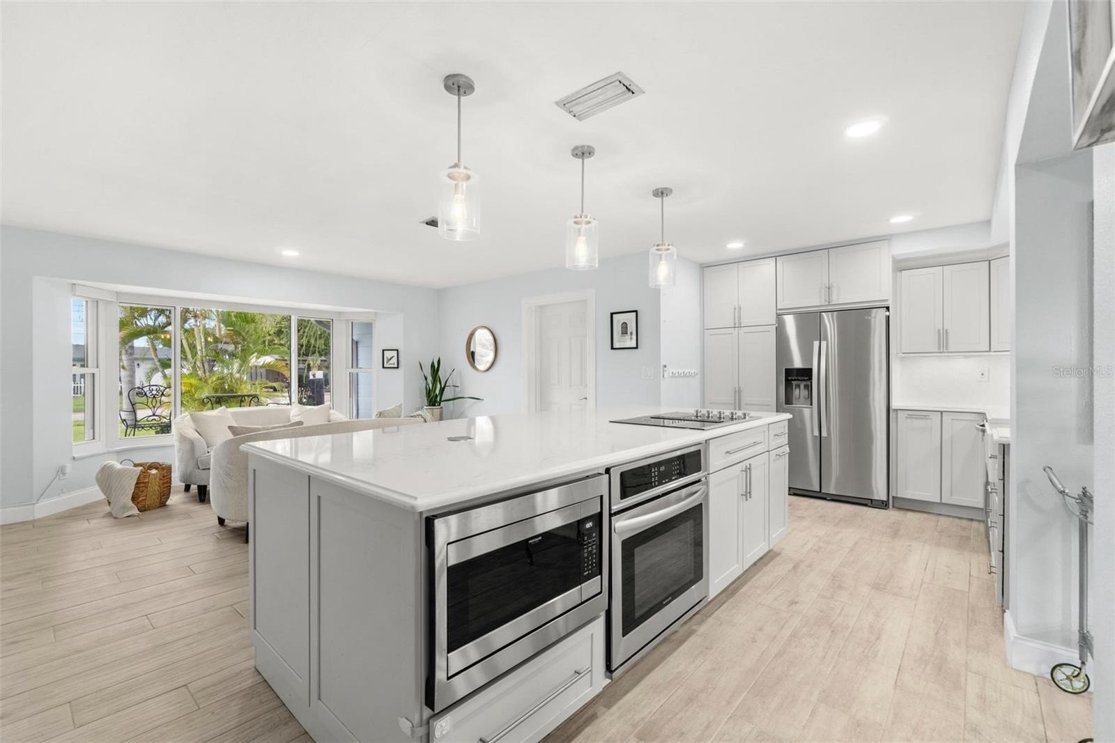 Your next chapter begins here in this beautifully maintained 3-bedroom, 2-bath residence, perfectly situated in the highly sought-after Holiday Park neighborhood. Step inside and immediately feel at ease — natural light fills the open-concept living space, accentuating the soft neutral palette and thoughtful designer updates throughout.At the heart of the home, a stunning 9’x4’ kitchen island serves as the ultimate gathering place — for morning coffee, casual dinners, or evenings spent with friends. Quartz countertops shimmer beneath elegant pendant lighting, while custom all-wood Thomasville cabinetry provides both function and timeless style. Soft-close drawers, a floor-to-ceiling pantry, corner lazy susan, Fireclay farmhouse sink, and detailed crown molding complete this showpiece kitchen. The living area flows seamlessly between lounging and entertaining, and the serene primary suite with ensuite bath offers the perfect retreat at day’s end. A flexible bonus room enhances the layout — ideal as a home office, playroom, or creative studio. Step outside to your private backyard oasis, where lush landscaping surrounds a paved patio — a tranquil setting for relaxing, dining, or hosting gatherings. Perfectly positioned between the award-winning Gulf beaches and vibrant Downtown St. Petersburg, this home offers easy access to parks, restaurants, and Tyrone Square’s shops and conveniences. Recent updates provide lasting peace of mind: hurricane-rated impact windows (2024), new garage door (2024), new HVAC system (2025), and updated electrical panel (2020).