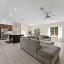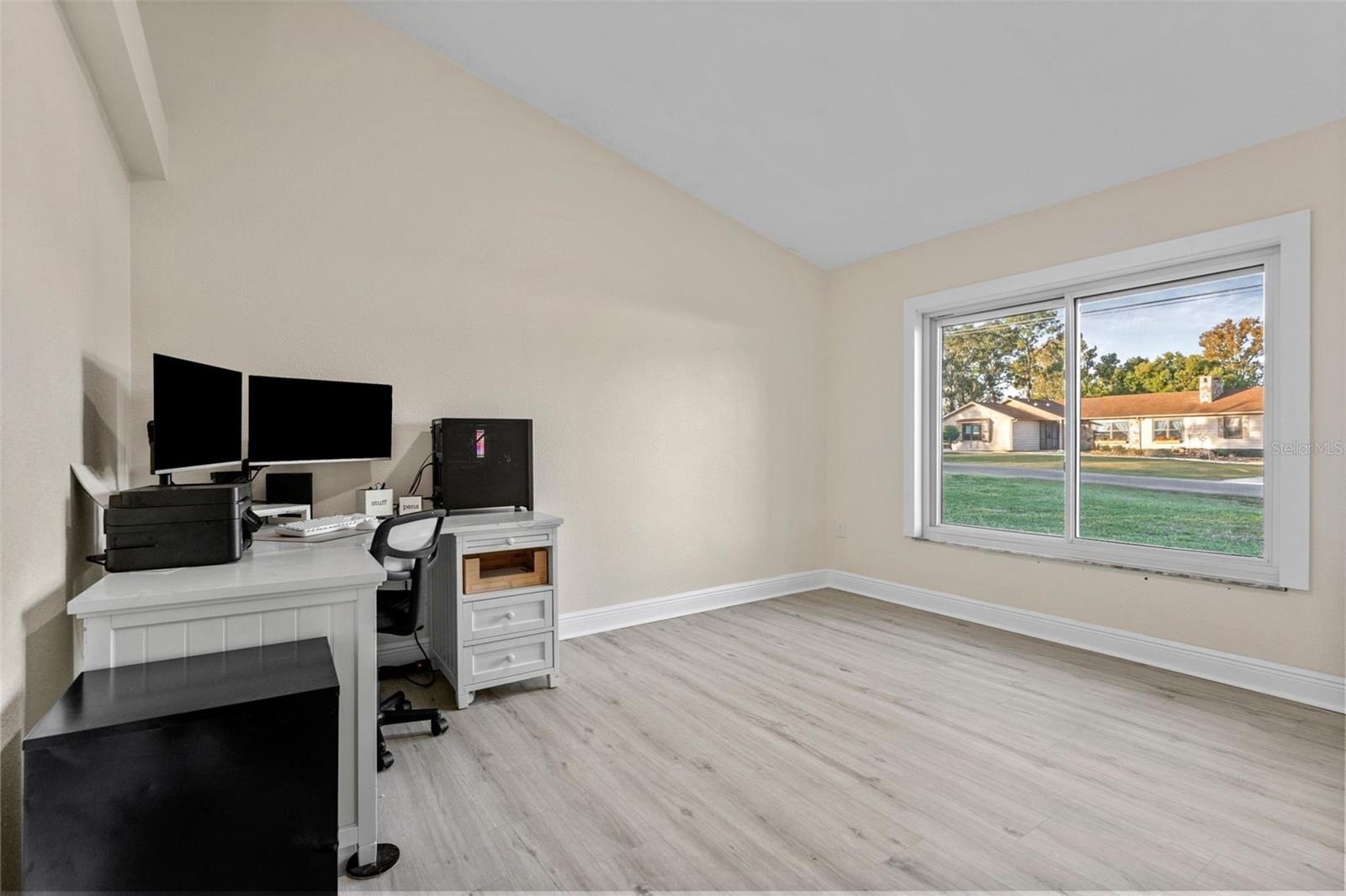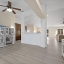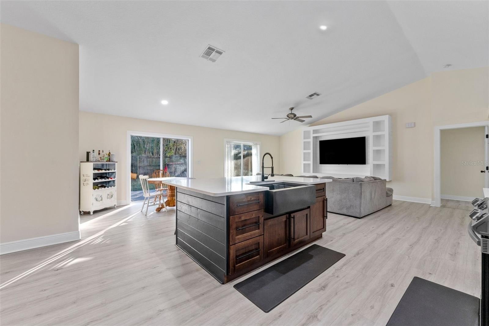 Open-concept living with vaulted ceilings, luxury vinyl plank flooring, and a built-in entertainment wall that anchors the spacious family room.