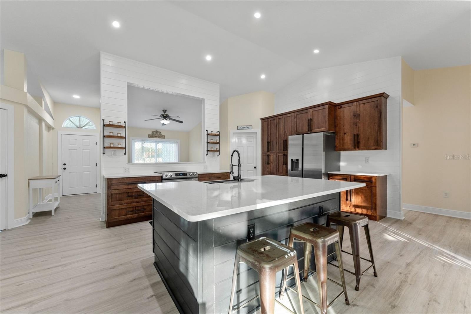 This home offers custom upgrades galore, featuring a thoughtfully redesigned kitchen and bathrooms that showcase craftsmanship and quality at every turn.Gorgeous chef’s kitchen with custom solid-wood cabinetry, quartz countertops, shiplap accents, open shelving, and a massive island perfect for entertaining.