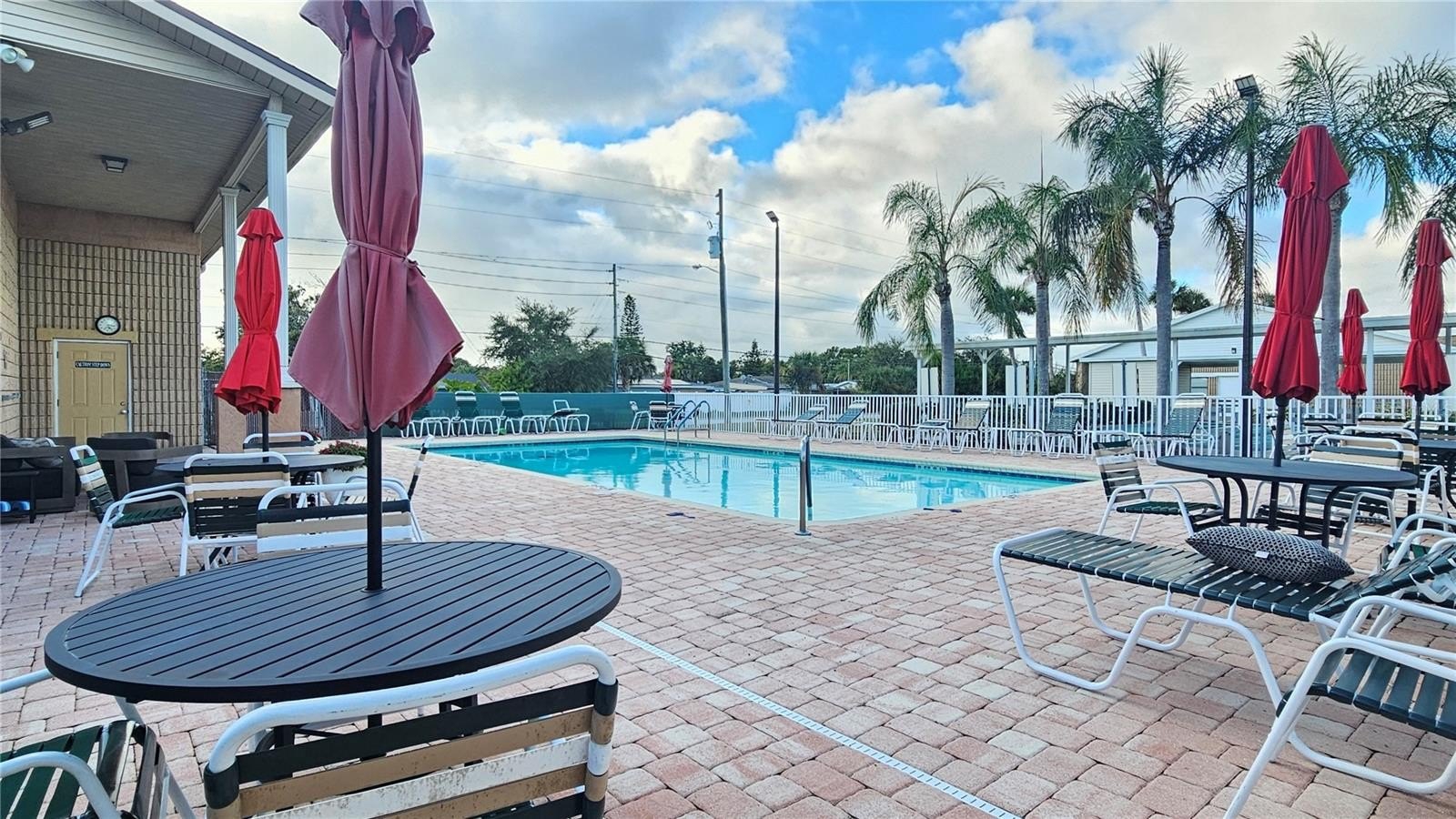 Lot rent includes: lawn care, trash and recycling, heated pool, BBQ area, fire pit, shuffleboard court, RV parking, and clubhouse with kitchen and library.