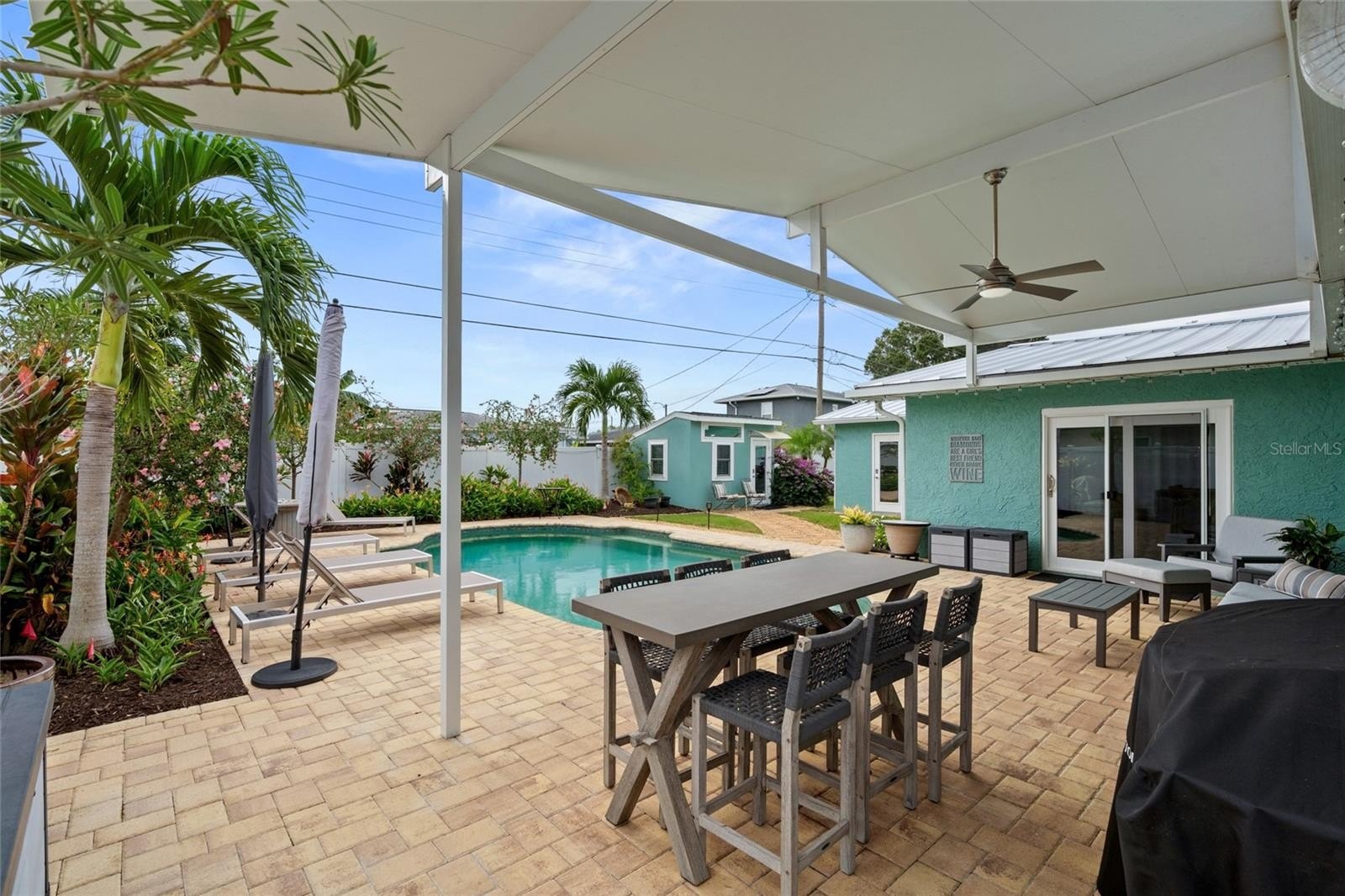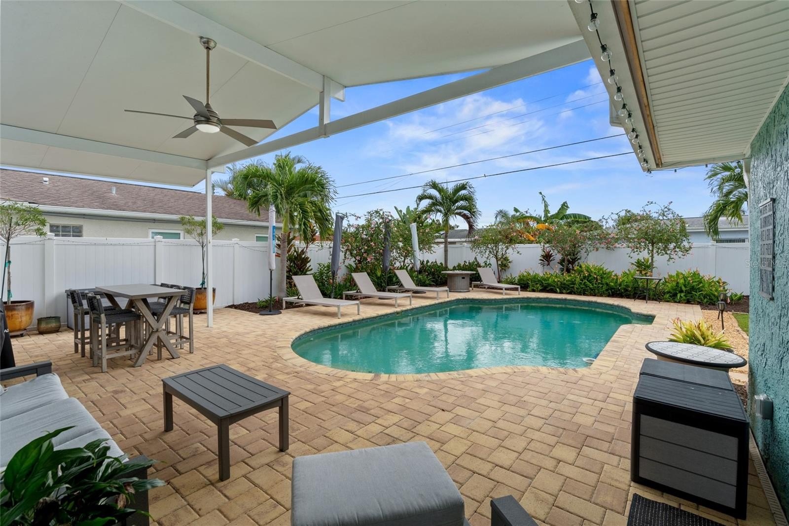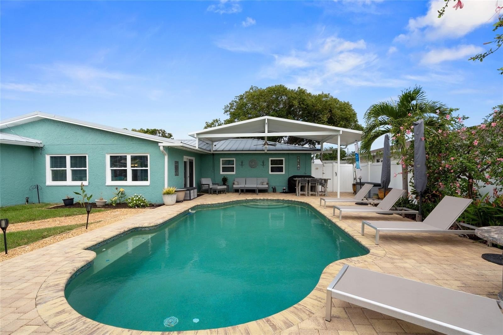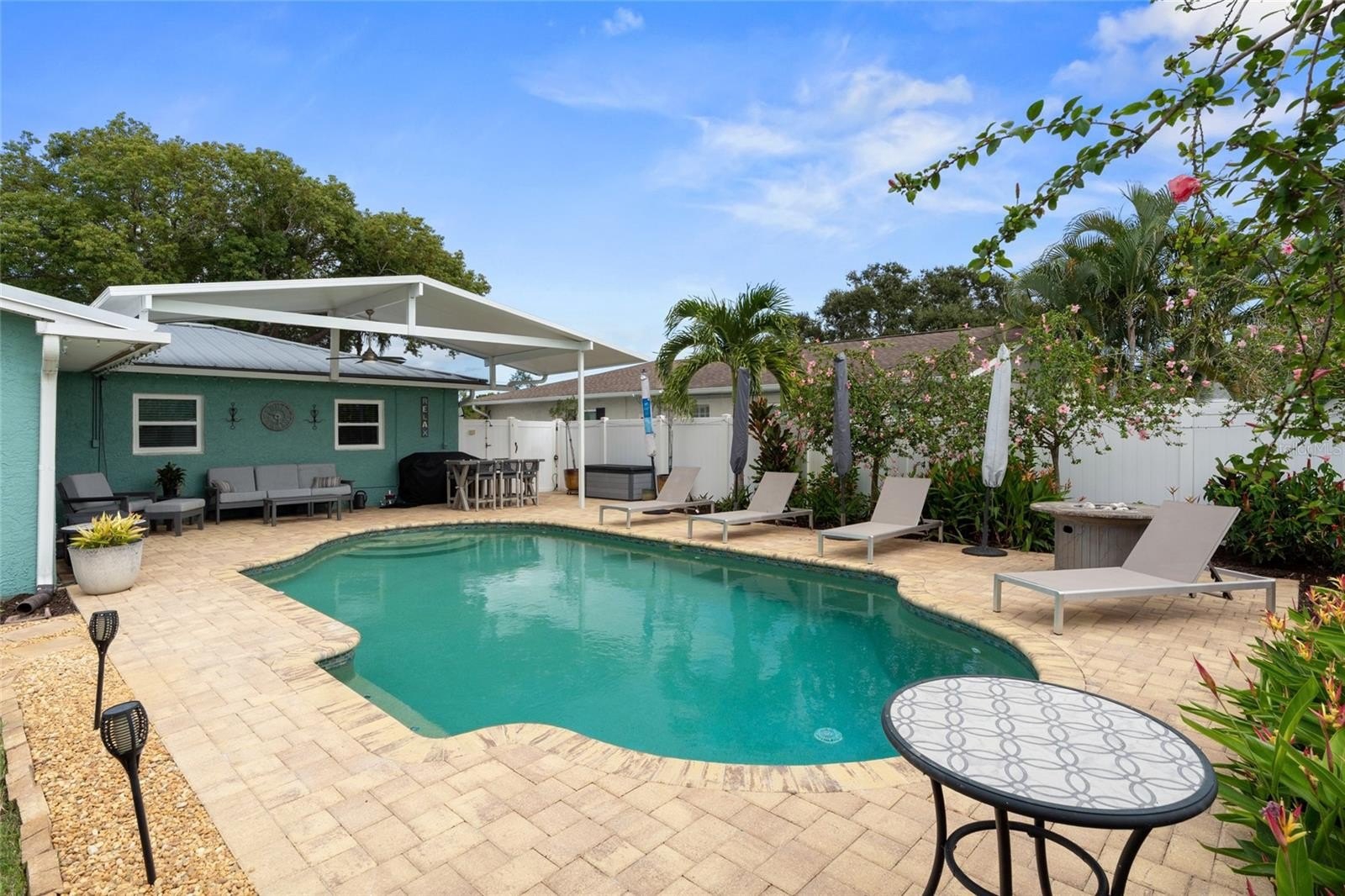 Welcome to your gorgeous three bedroom two and a half bath pool home, located just minutes from downtown St. Petersburg and the Gulf Beaches. This property has been meticulously maintained, located on a quiet street and features so many upgrades, it's hard to list them all! The open floor plan is wonderful for entertaining, with a chef's kitchen and an oversized granite breakfast island a perfect place for a buffet. The split-level floor plan, with its newly finished owner's bath, provides a tranquil oasis away from the other bedrooms and living areas. The owner's bath also includes a soaking tub, an oversized shower with a rain shower head and a walk-in closet. Impact windows and sun tunnels bring plenty of natural light into the house, particularly in the family room, which receives the morning sun a wonderful place to enjoy a cup of coffee to start the day. The custom pool was refinished to emulate the color of the water in St. John, Virgin Islands. Don't forget about the covered patio with beautiful pavers that surround the entire pool area. The backyard was designed and landscaped to create a resort-like feel around the pool. In addition to a gorgeous backyard, there is a detached flex suite with a split AC system, ideal for working from home or for playtime. Other special features include Impact windows and doors, new metal roof, security system, water softener, irrigation well pump, and a private pool bath entrance. All of this is just minutes from the best restaurants, world-class beaches and museums. Come and enjoy Florida living at its finest!