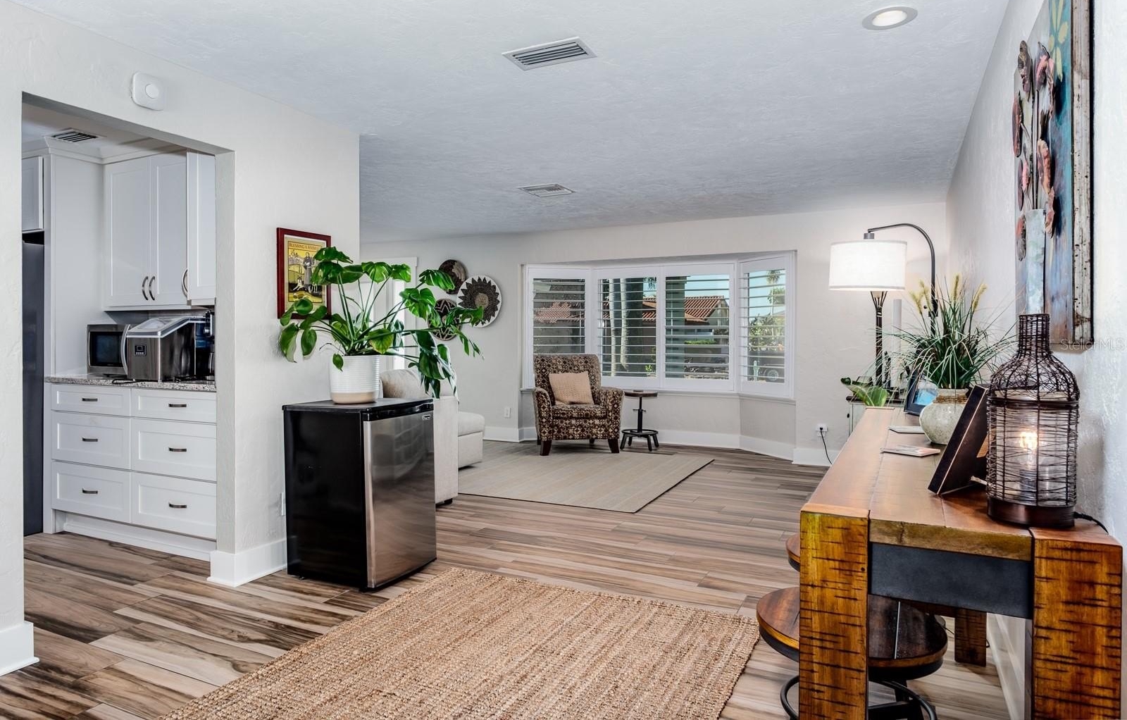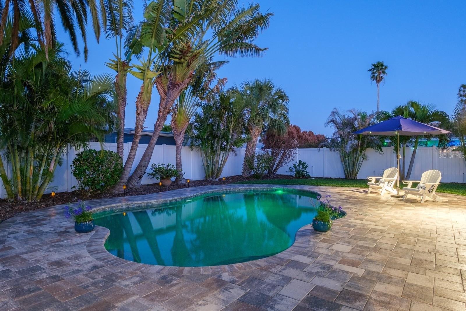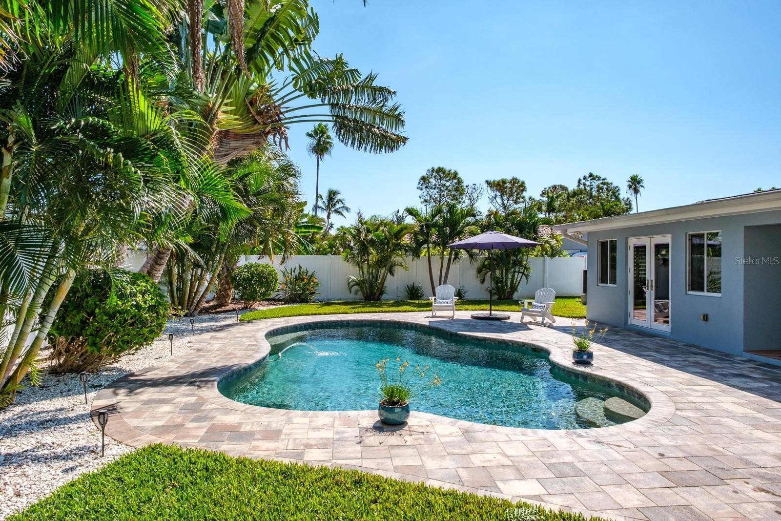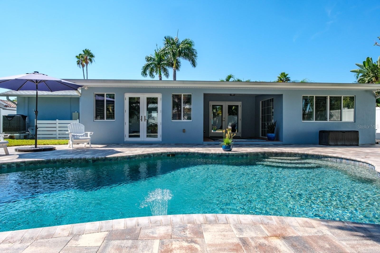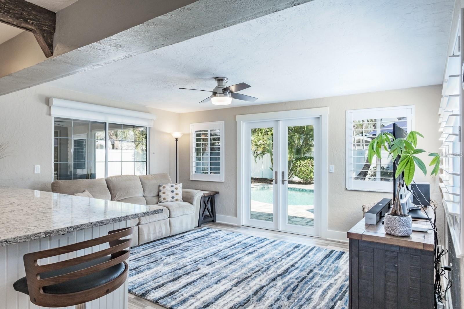 Welcome to the secluded Island of Vina Del Mar! This 2BR/2BA coastal-inspired home in the coveted Vina Del Mar neighborhood offers light-filled, open-concept living with views of the landscaped backyard and saltwater pool. The updated kitchen features custom quartz countertops, all-wood cabinetry & pantry with soft-close drawers, and a striking 100-year-old cypress beam with matching accent trim. The split floor plan includes a spacious primary suite with an en suite bath, a walk-in closet with custom shelving, and a versatile office/den/nursery space with pool access. The guest suite offers a built-in closet and adjacent bath, with a custom pocket door for added privacy. Two distinct living areas provide flexibility—one for larger gatherings, the other is open to the kitchen with direct pool access. The covered lanai offers shade while overlooking the private backyard, with an adjacent lounge area ideal for cooling off indoors. Meticulously upgraded and kept, the home features a new roof (2025), pool pump (2024), water purification & filtration system (2022), water heater (2020), Air Knight purification system (2017), custom Pebble-finish saltwater pool (2017), wood plank-style porcelain flooring, plantation shutters, Nest smart thermostat & smoke/CO detectors, updated electrical panel, newer windows and doors, fresh paint, and more. The two-car garage provides additional storage, while underground power lines preserve unobstructed views. Nearby Vina Del Mar Park offers a playground, dog park, pickleball, tennis, and basketball courts. Cruise down to the beach, restaurants, shops and entertainment in famous Pass-A-Grille or even a short drive to the vibrant Downtown St Pete for nightlife and the St Pete Pier. Don’t miss your chance to live the Salt Life!