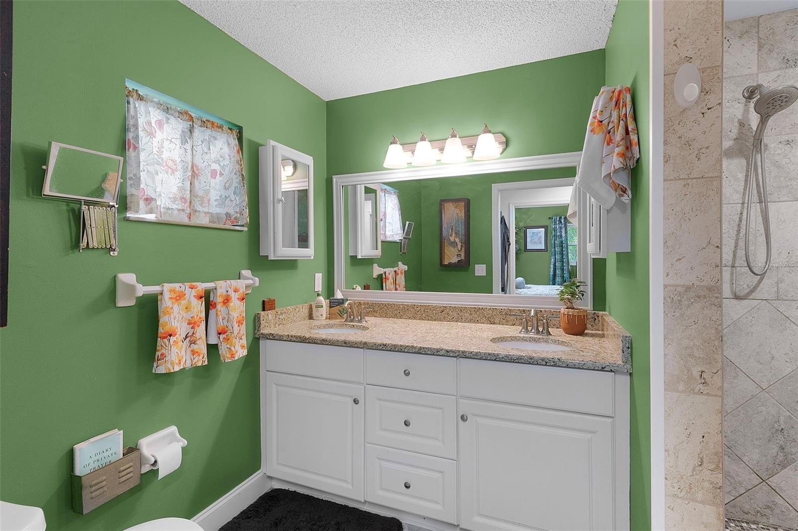 The interior features an updated kitchen and bathrooms with granite countertops, double sinks, and a walk-in tile shower in the primary suite. Energy-efficient double-pane windows fill the home with natural light, and ample storage ensures convenience and functionality throughout.