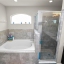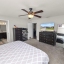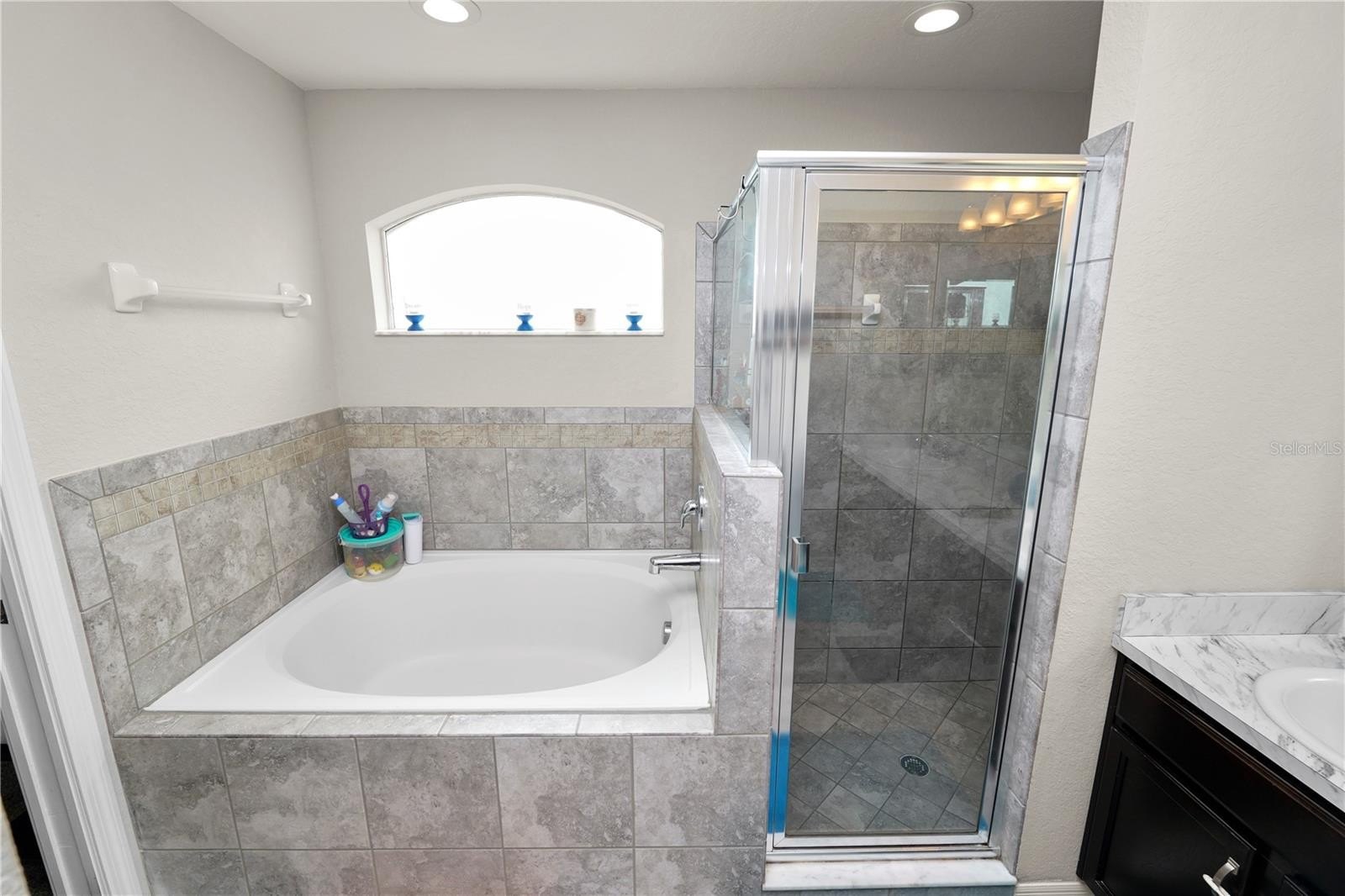 The primary suite creates a quiet retreat with plush carpet, a large walk-in closet, and an elegant en suite bath featuring dual sinks, abundant counter space, a soaking tub, and a separate tiled shower with a glass door. Each guest bedroom provides ample room, ceiling fans, and generous closets, while the guest bath includes a single vanity and a tub/shower combination.