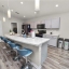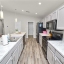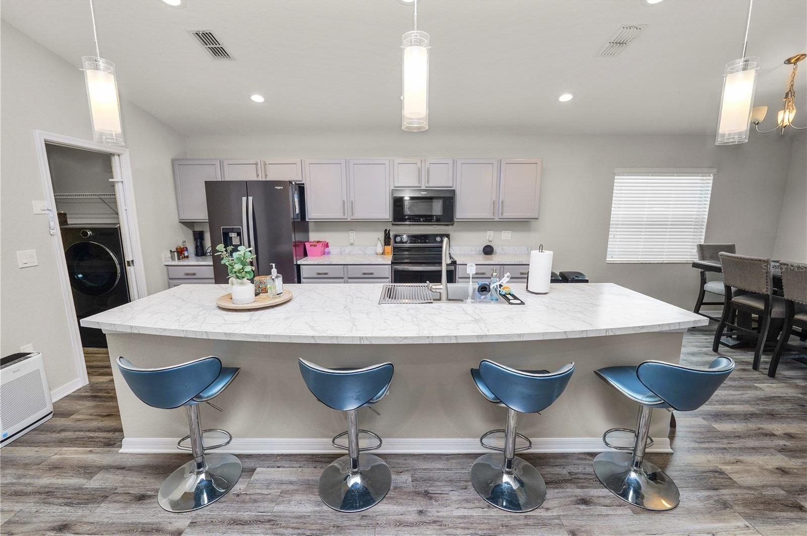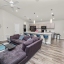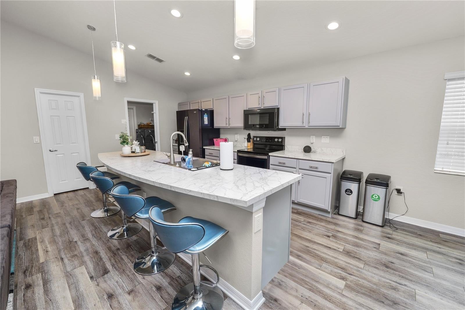 Step onto the charming front porch and into a bright, open floor plan where high ceilings and natural light enhance the spacious design. The living area flows effortlessly into the kitchen and dining spaces, making it ideal for everyday living and entertaining. The kitchen features hard countertops, stainless steel appliances, an island with sink and seating, and an eating nook with views of the backyard patio—perfect for casual meals or morning coffee.