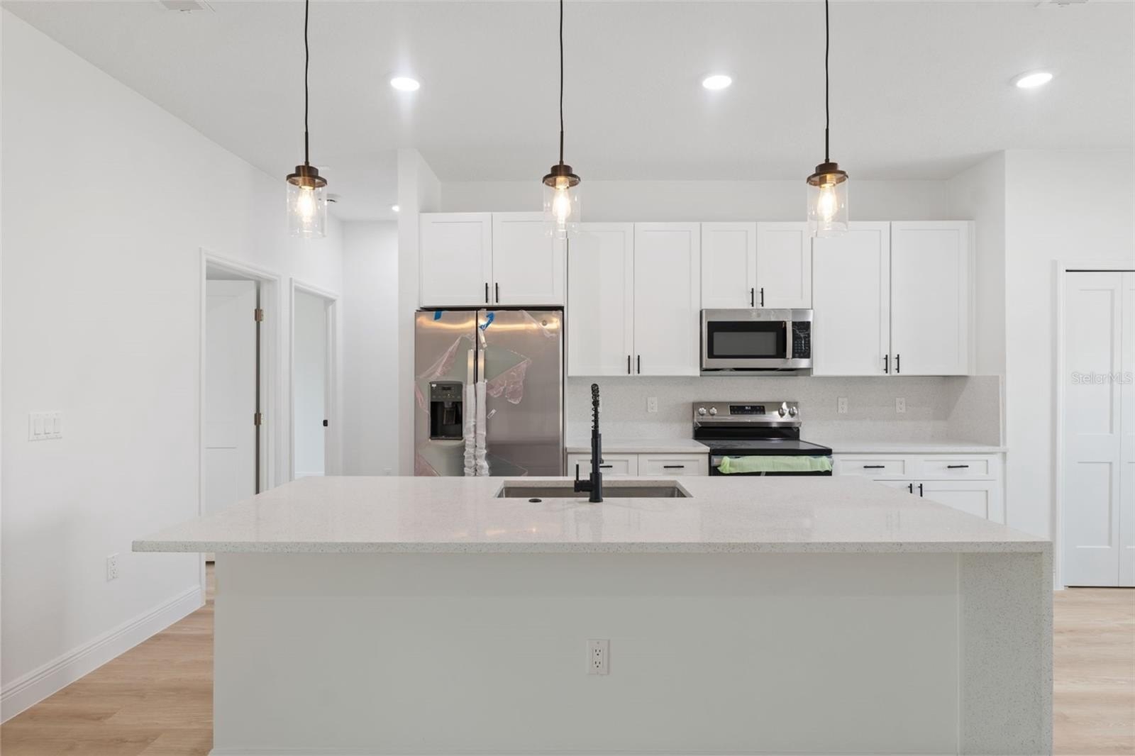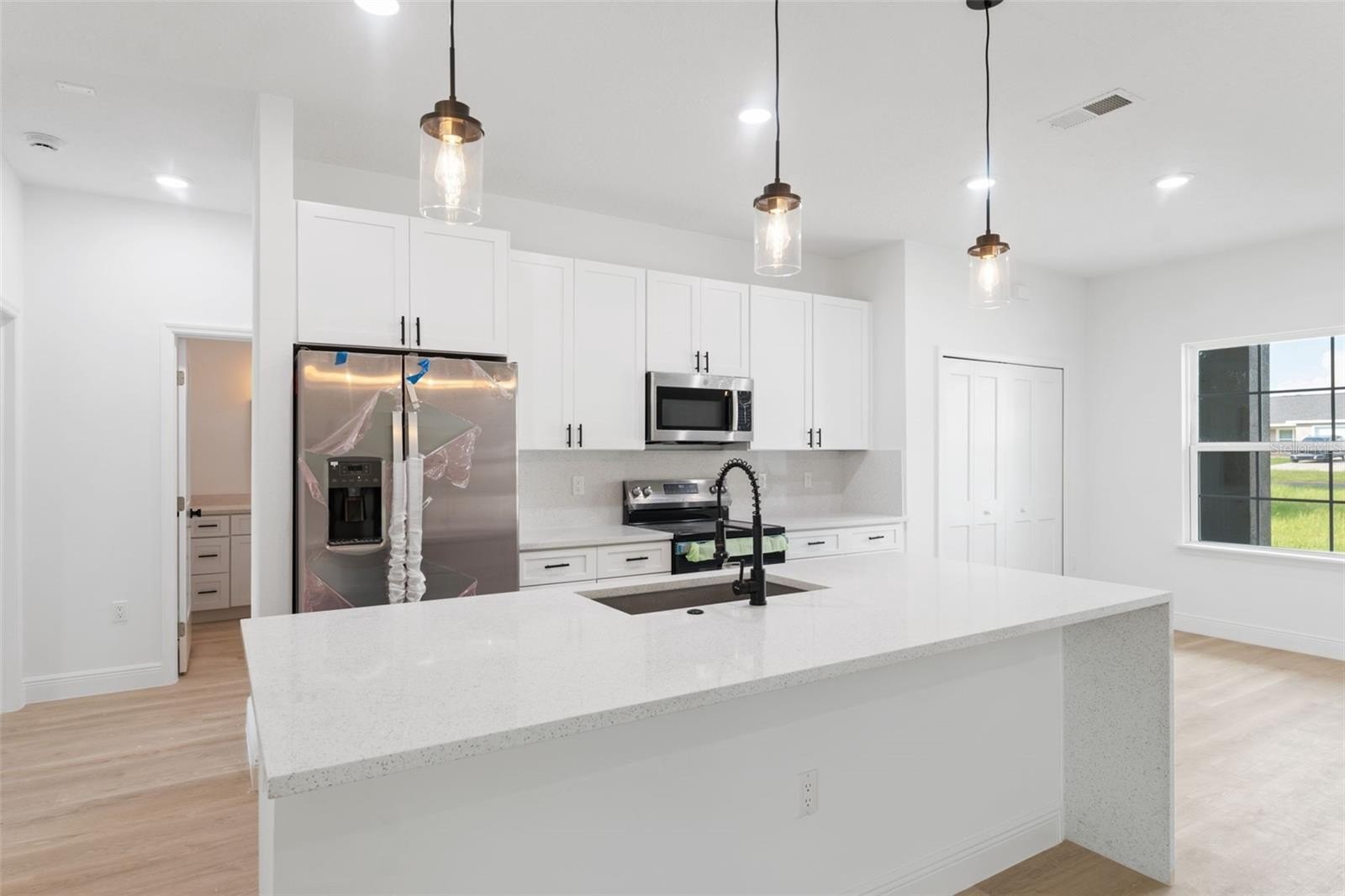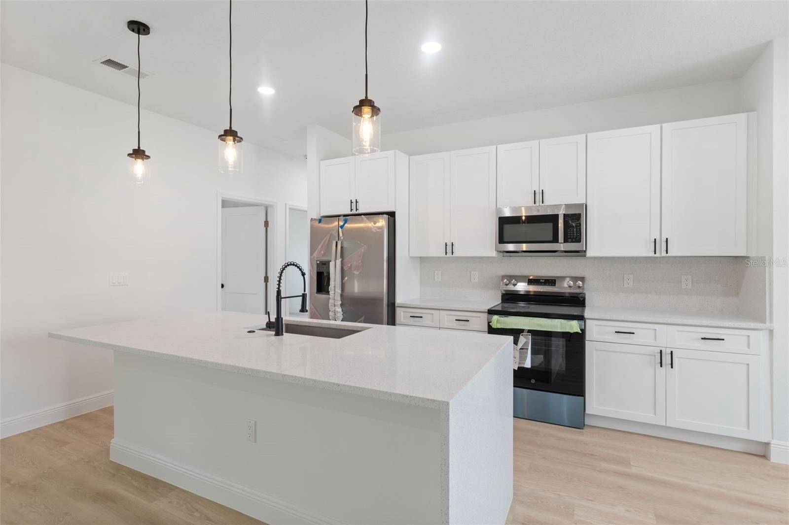 The bright and airy living room and dining room are ideal for entertaining or relaxing with loved ones. The heart of the home is the gorgeous kitchen, featuring solid wood cabinets, stone countertops, and modern appliances, all included. Whether you're cooking for guests or enjoying a quiet meal, this space blends function with style.
