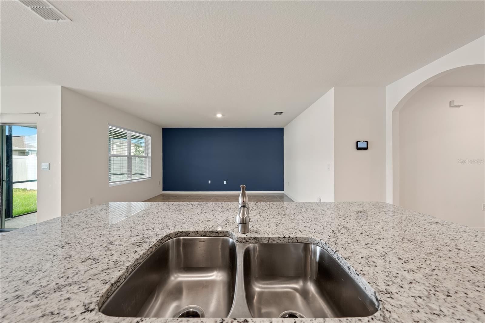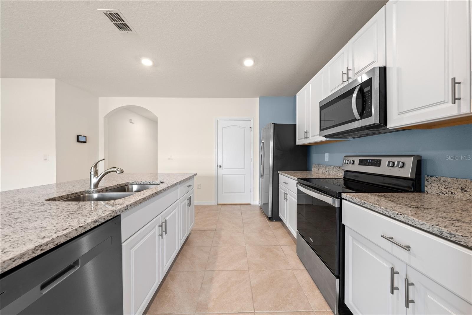 At the heart of the home is a stunning kitchen equipped with stainless steel appliances, granite countertops, a spacious walk-in pantry, and a large center island with a breakfast bar — ideal for casual dining and entertaining alike. Natural light pours through energy-efficient double-pane windows, highlighting a fresh color scheme and unique accent walls throughout.