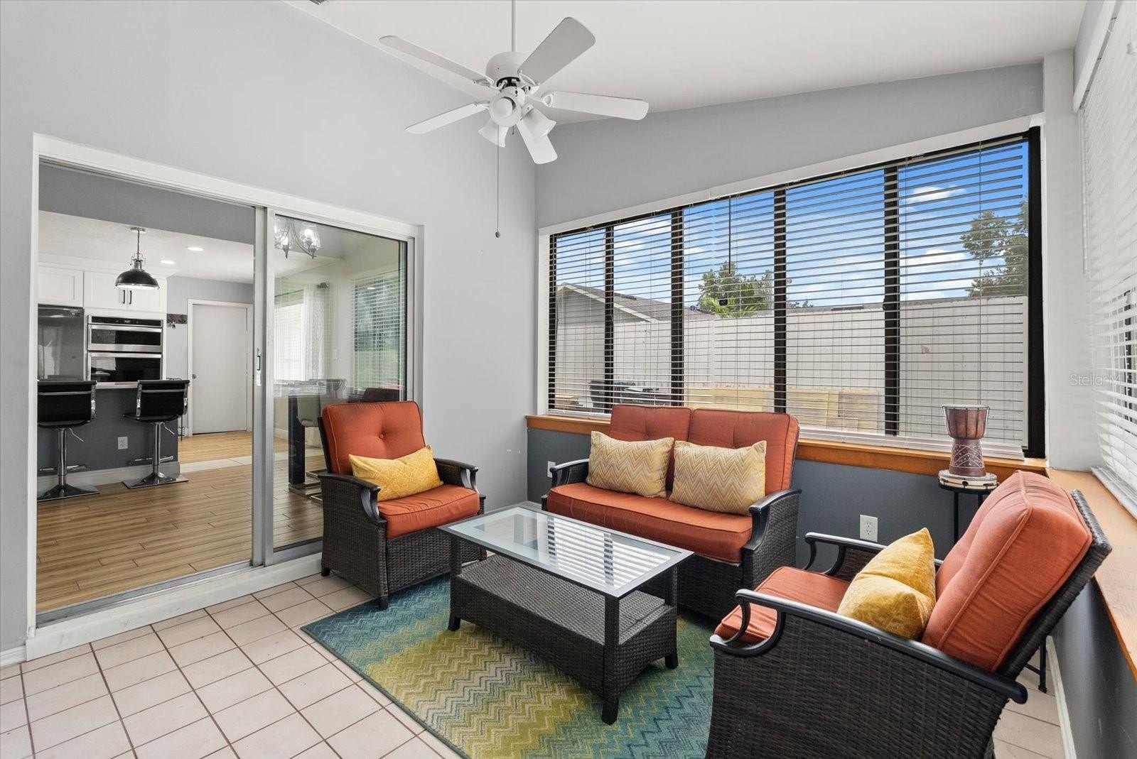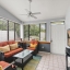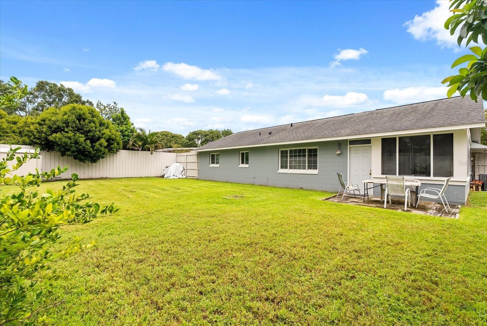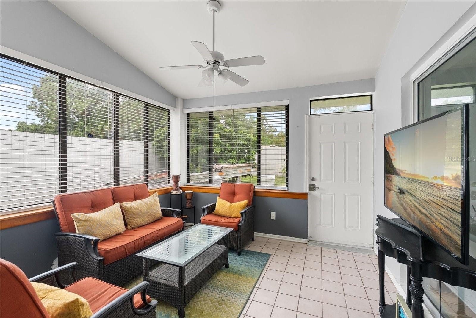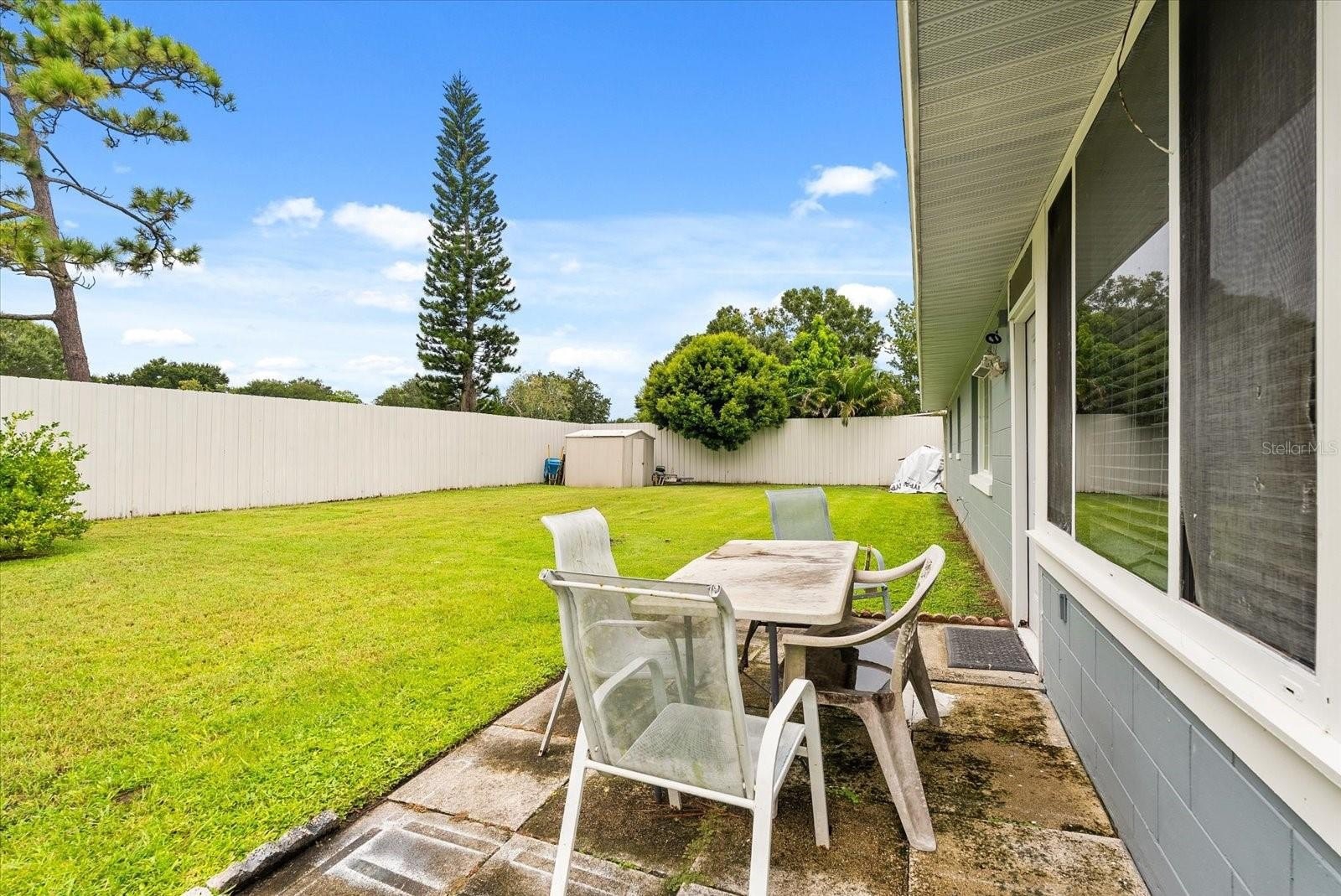 Vaulted ceilings and tile floors create an open, airy flow throughout the living spaces, while the large enclosed porch provides flexibility as a sunroom, playroom, or even a fourth bedroom. Outside, the large fenced backyard offers room to garden, play, or relax under the shade of citrus trees, with a storage shed to keep everything organized.