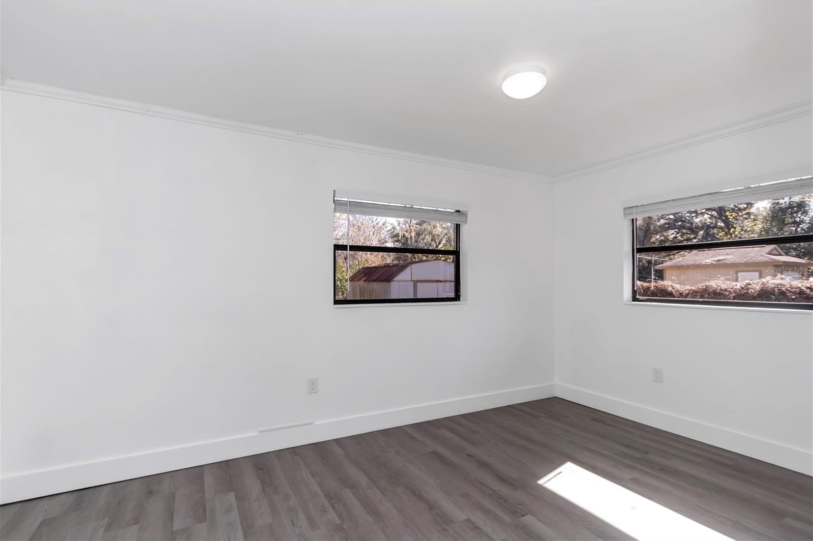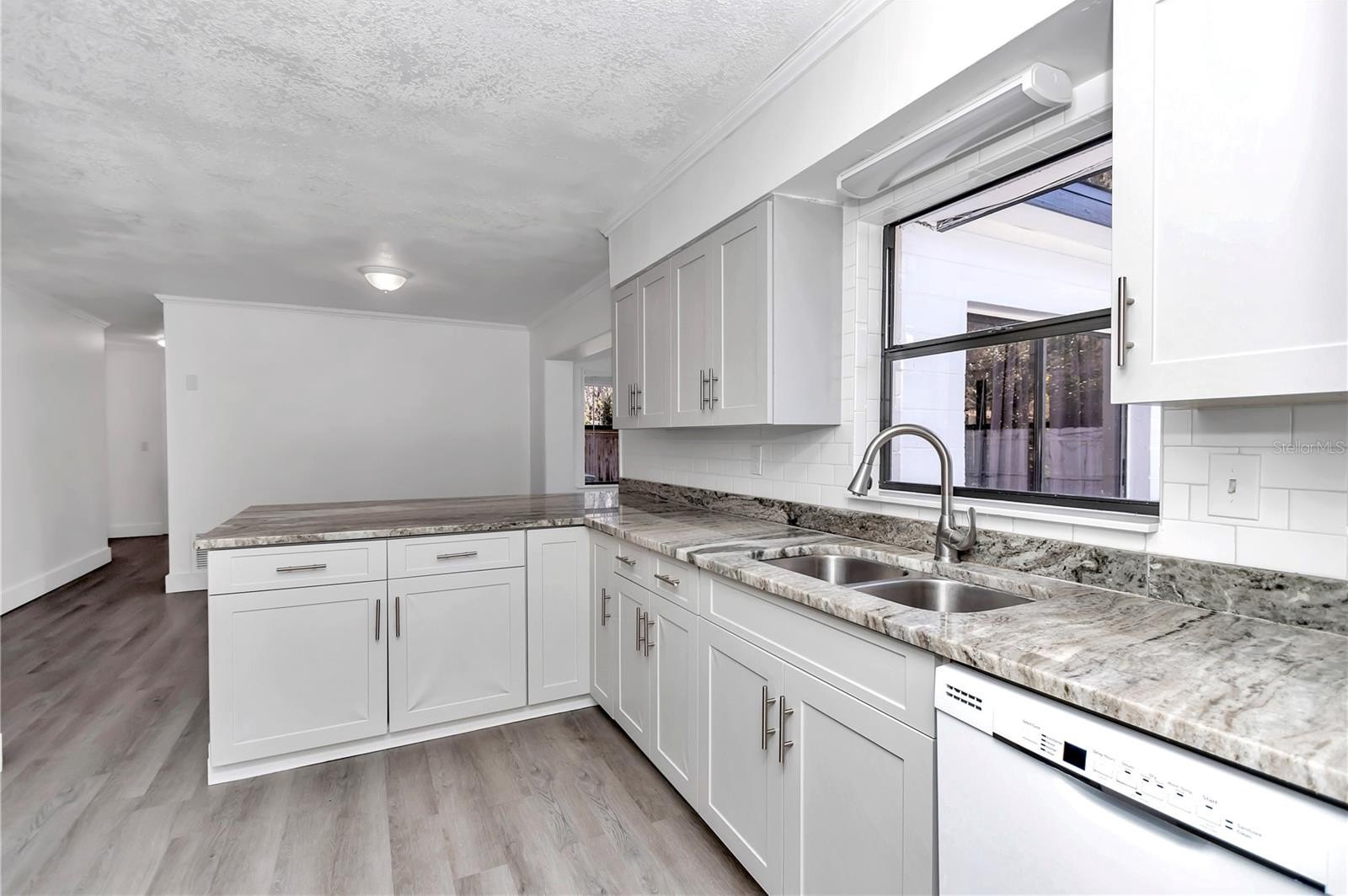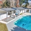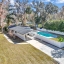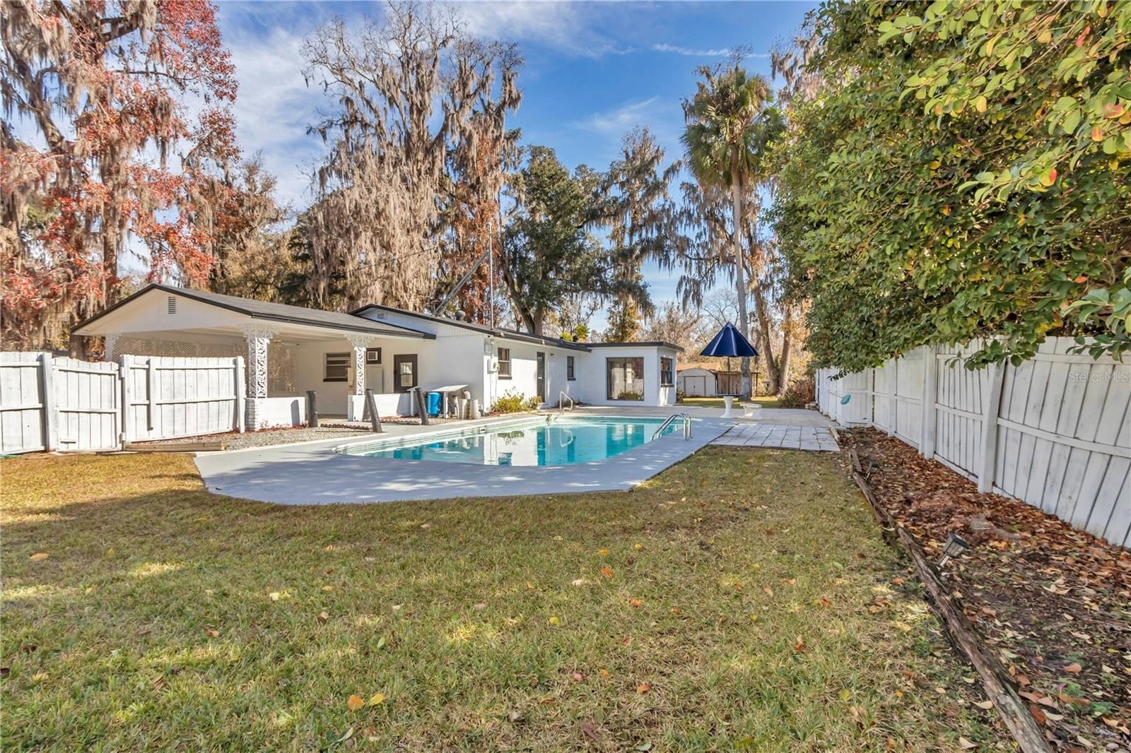Incredible curb appeal on oversized ( 1/2 an acre), corner lot with no HOA, in-ground pool, private backyard and storage shed! Covered front porch leads to Modern, renovated home with whole home luxury vinyl plank. Spacious living room overlooks kitchen with Peninsula Island with upgraded granite countertops, brand new cabinets with nickel handles. New stainless steel refrigerator and stove. The kitchen overlooks the breakfast area leading to oversized covered floor room with beautiful views of the large inground pool with oversized sun patio. This is a true three bedroom three full bath home featuring split bedroom plan. Primary bedroom is to the right of the home and is oversized with glass door surround shower. Leading back across the home into the spacious laundry room and mudroom! Across the home is the second bedroom with en suite bathroom with glass door modern finishes. The third bedroom is basically two rooms in one with sitting area. Your guest can use the bathroom off the hallway with glass sliding door and modern finishes, including new cabinetry and oversized granite vanity. 2021 roof, Hvac 2018 and 2022 hot water heater. 2025 pool pump Stepping outside of the Florida room outside the double sliding glass door to your backyard oasis that has privacy fence and has a storage shed as well. 2 car carport great for parking or covered shade for pool! All super close to Grand Oaks marketplace, the theater and downtown!