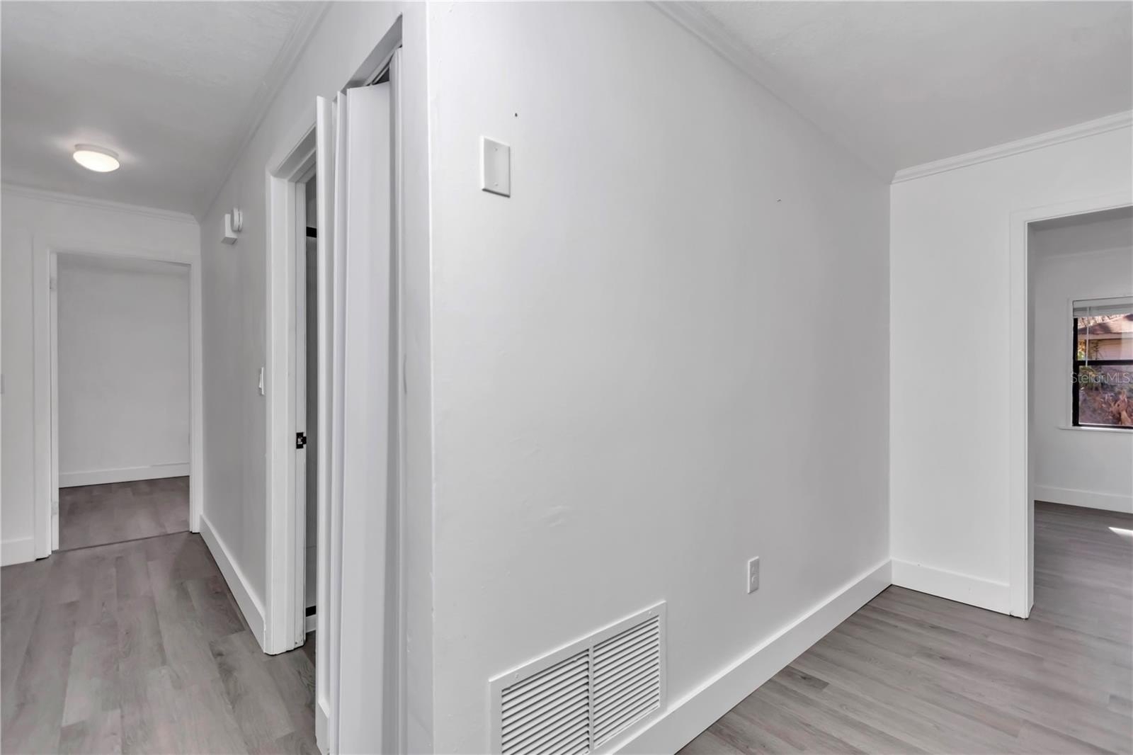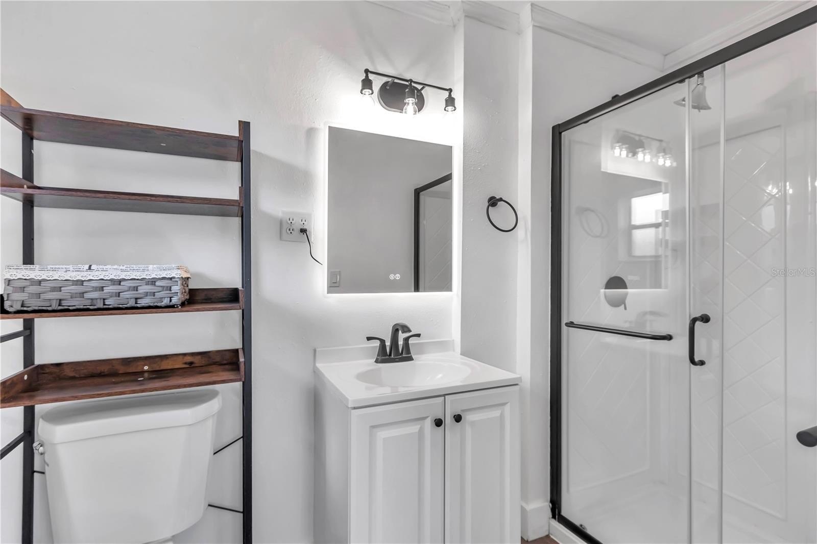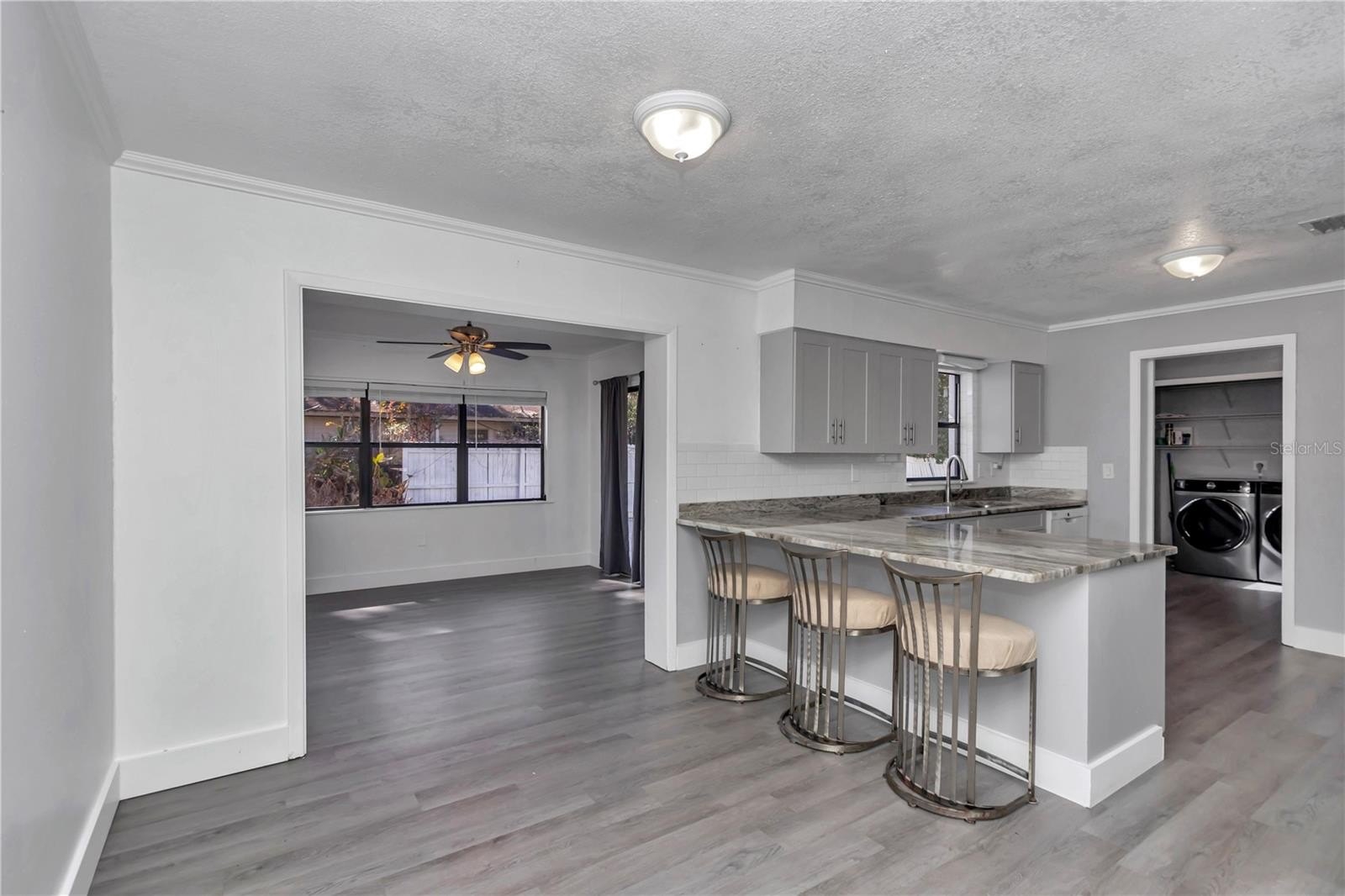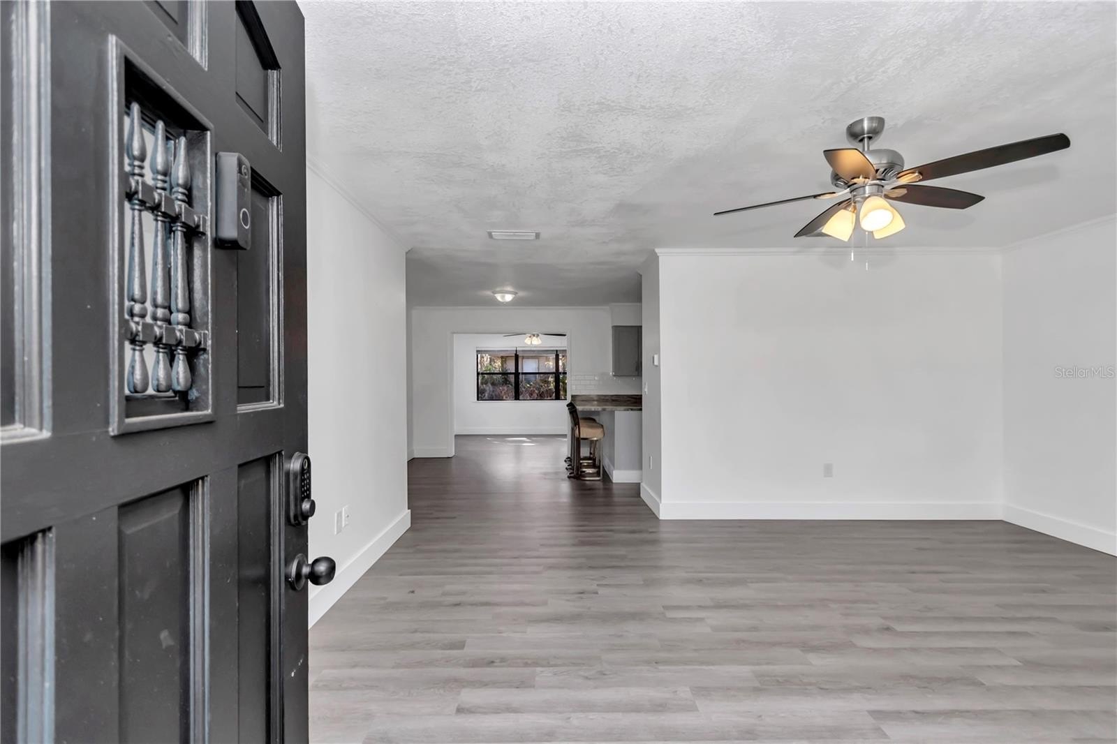Incredible curb appeal on oversized ( 1/2 an acre), corner lot with no HOA, in-ground pool, private backyard and storage shed! Covered front porch leads to Modern, renovated home with whole home luxury vinyl plank. Spacious living room overlooks kitchen with Peninsula Island with upgraded granite countertops, brand new cabinets with nickel handles. New stainless steel refrigerator and stove. The kitchen overlooks the breakfast area leading to oversized covered floor room with beautiful views of the large inground pool with oversized sun patio. This is a true three bedroom three full bath home featuring split bedroom plan. Primary bedroom is to the right of the home and is oversized with glass door surround shower. Leading back across the home into the spacious laundry room and mudroom! Across the home is the second bedroom with en suite bathroom with glass door modern finishes. The third bedroom is basically two rooms in one with sitting area. Your guest can use the bathroom off the hallway with glass sliding door and modern finishes, including new cabinetry and oversized granite vanity. 2021 roof, Hvac 2018 and 2022 hot water heater. 2025 pool pump Stepping outside of the Florida room outside the double sliding glass door to your backyard oasis that has privacy fence and has a storage shed as well. 2 car carport great for parking or covered shade for pool! All super close to Grand Oaks marketplace, the theater and downtown!