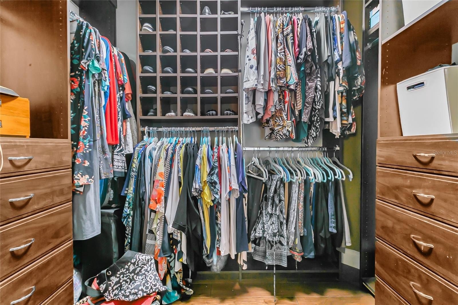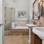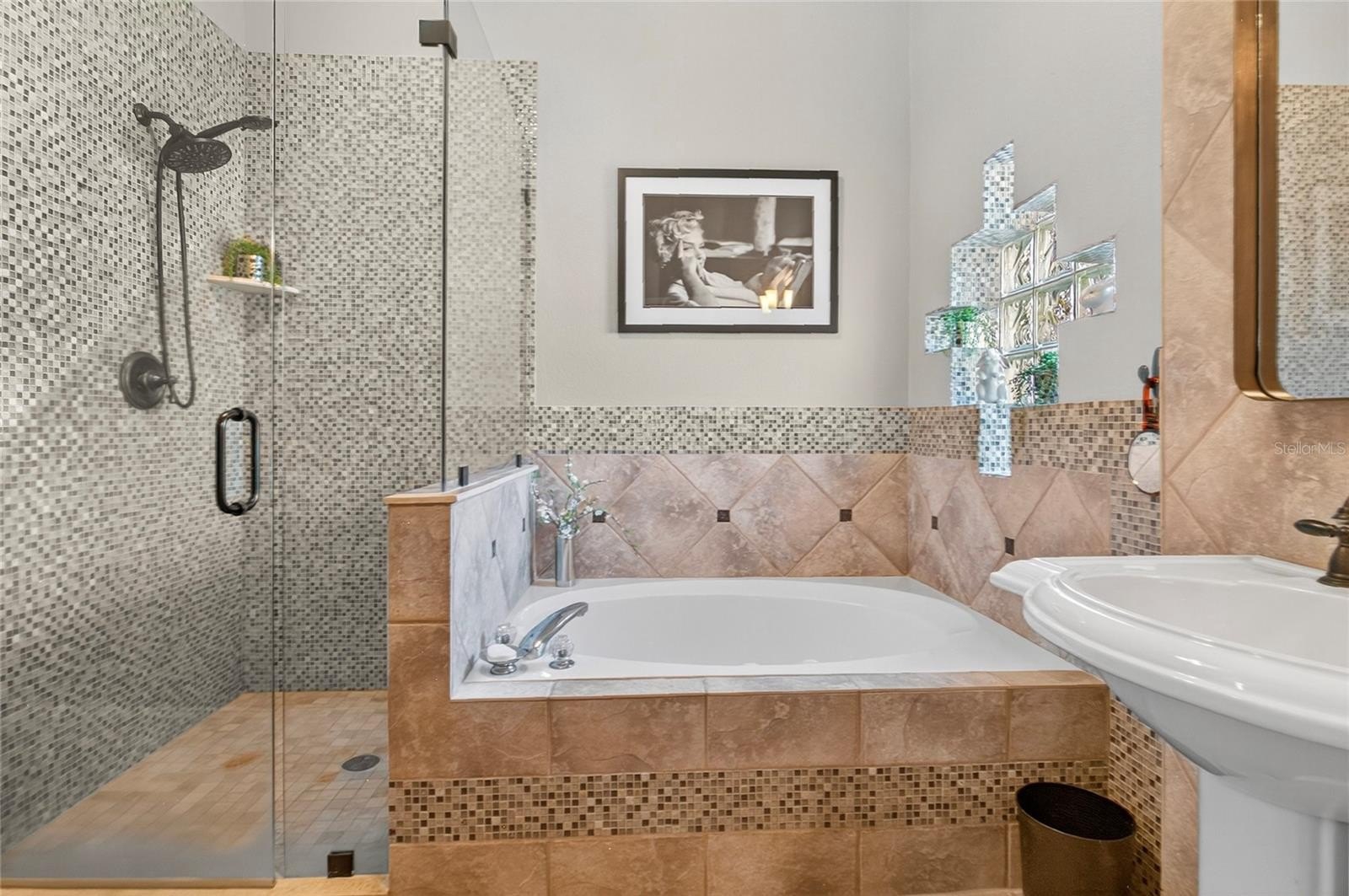 Retreat to the luxurious owner’s suite featuring California closets, dual Kohler sinks, a whirlpool soaking tub, and a frameless glass shower accented with designer glass tile and porcelain finishes.