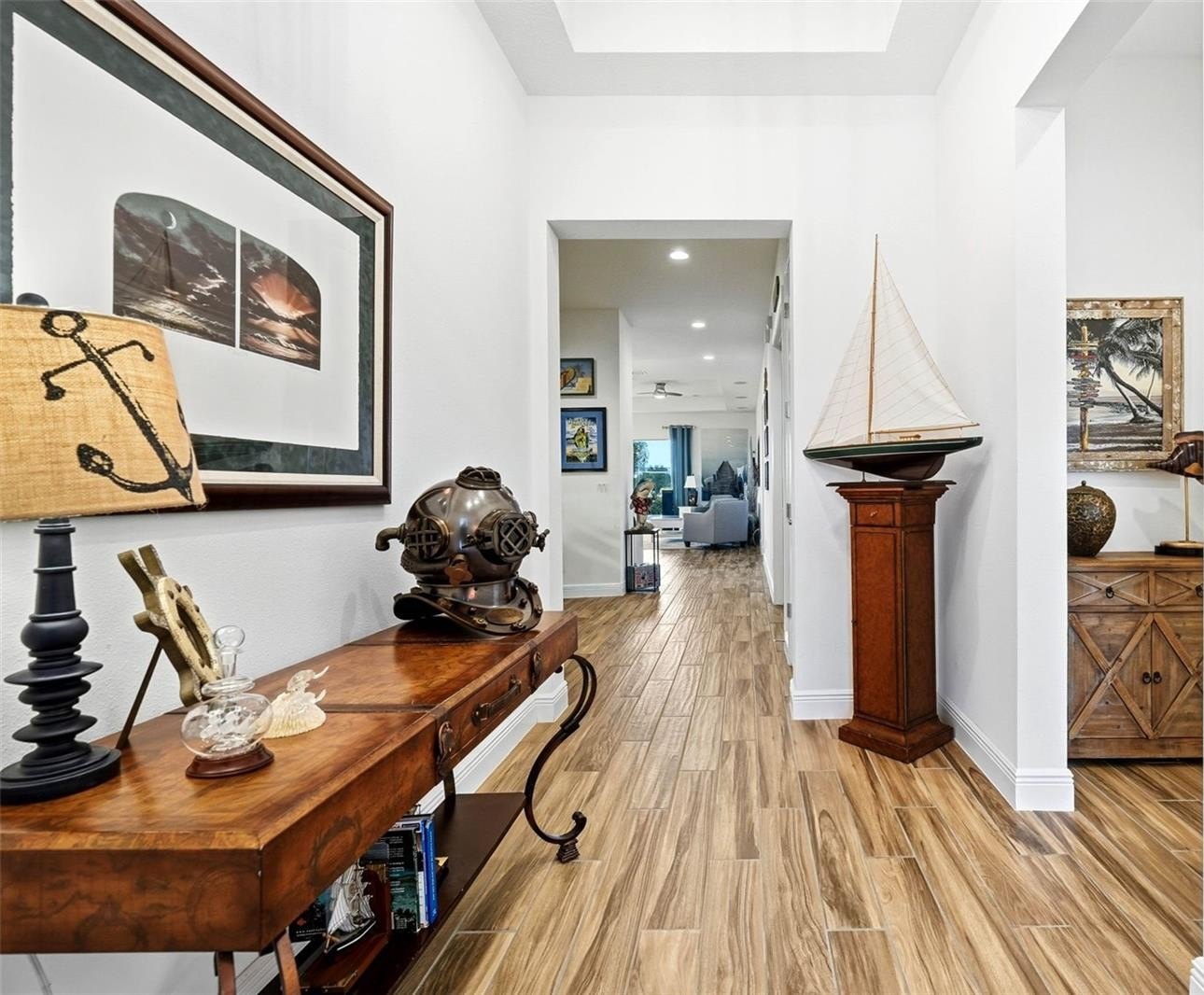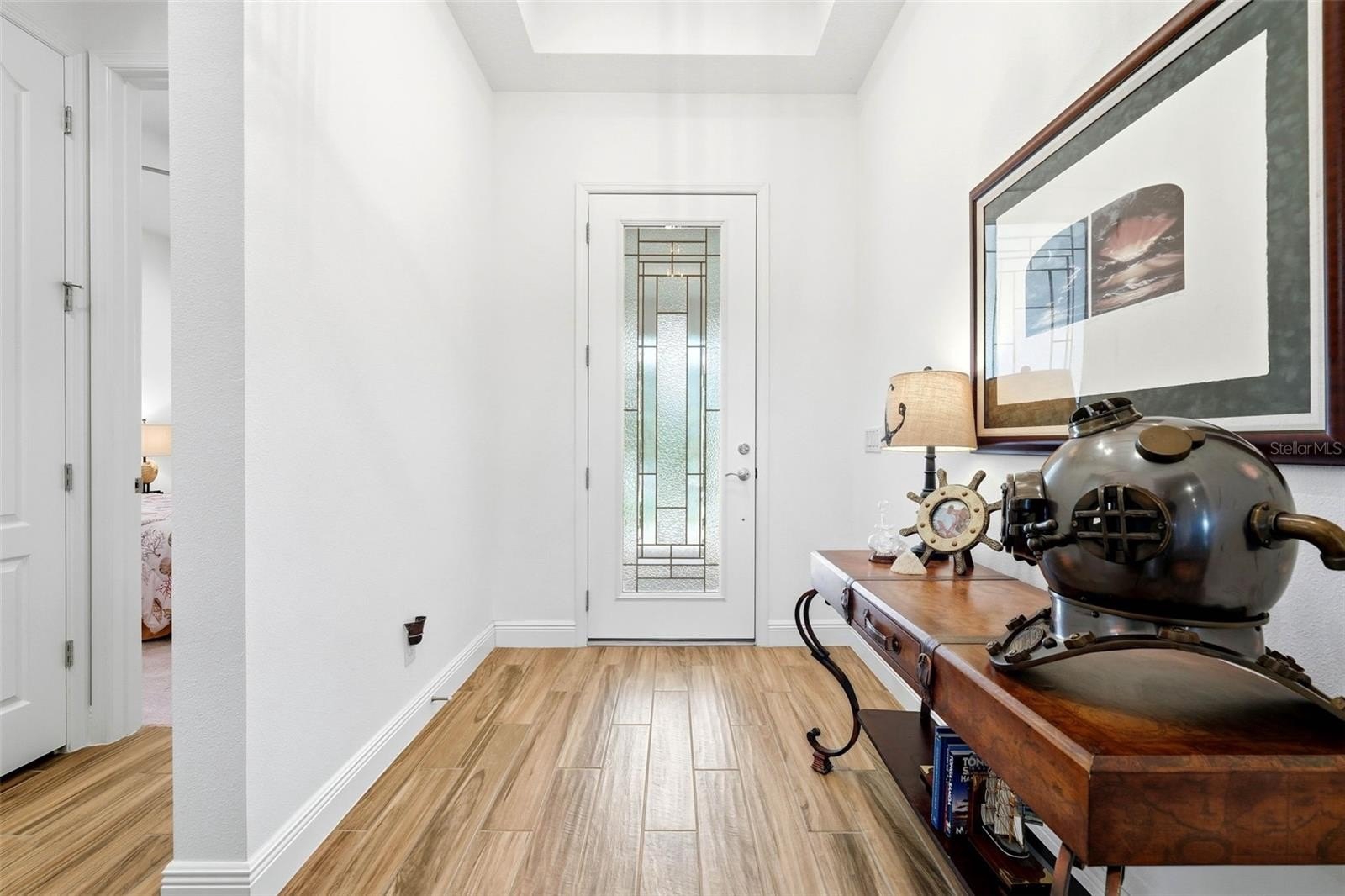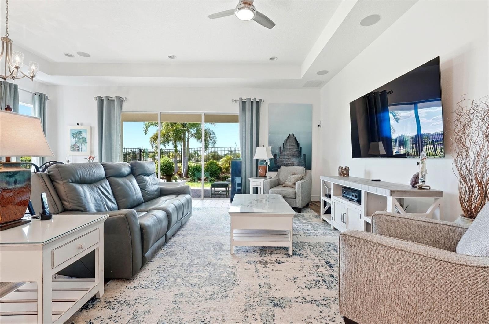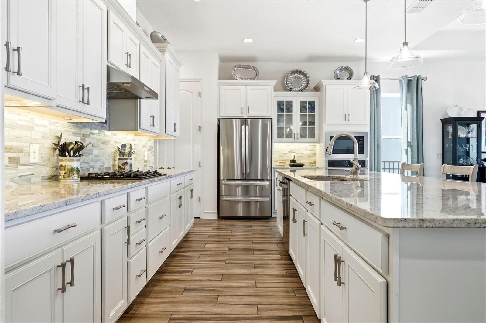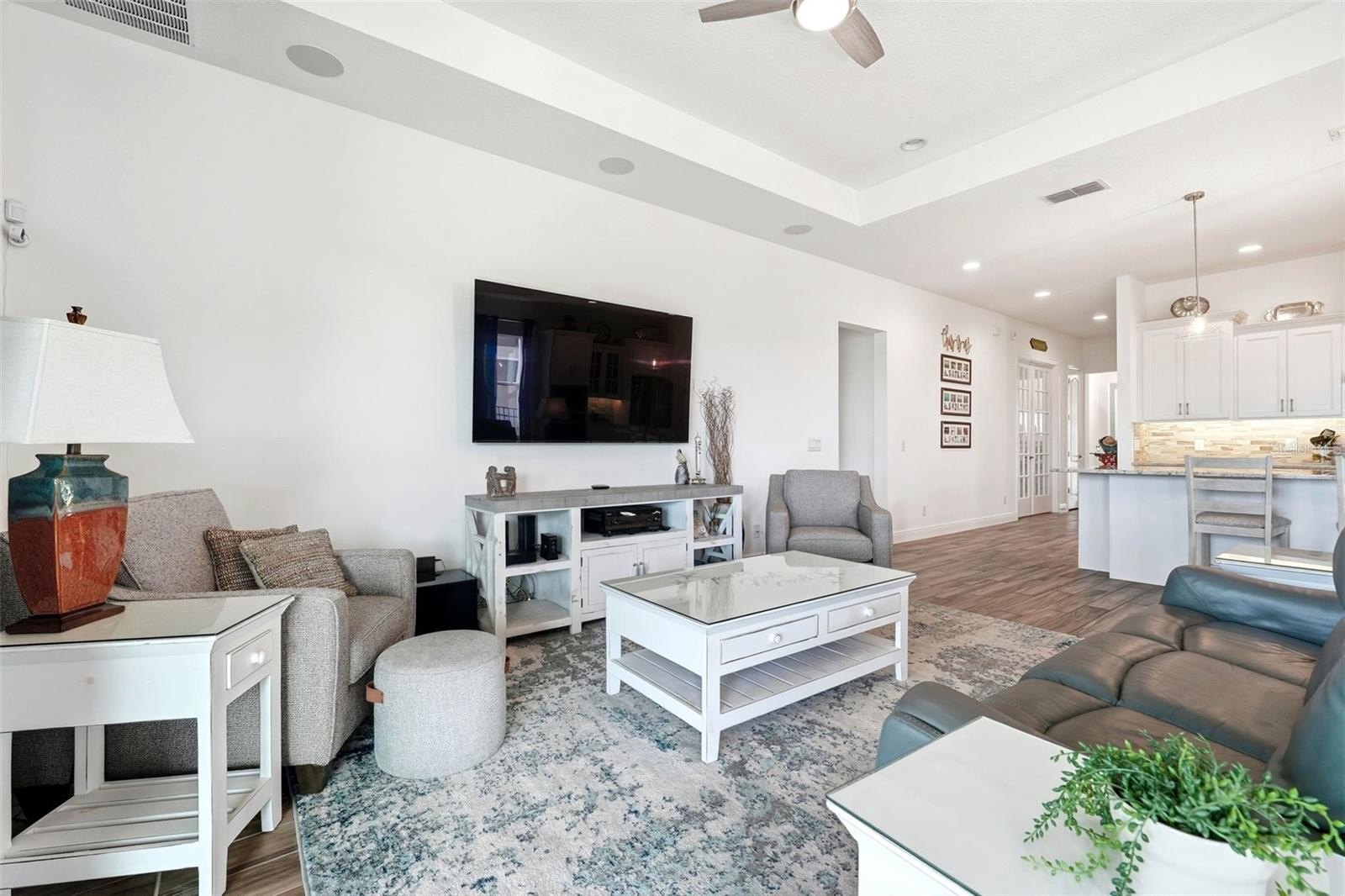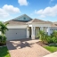 Welcome to resort-style living in the Four Seasons 55+ guard-gated community. This upgraded St. Lucia model blends coastal elegance with the Parrot-Head lifestyle in the open living space. Features include wood-look tile, 8’ doors, tray ceilings, designer lighting and fans. Split-bedroom plan ensures guest privacy. Expanded, builder-upgraded great room with dry bar is ideal for entertaining. Gourmet kitchen offers granite island, soft-close cabinets, GE Profile appliances, gas cooktop, vent hood, and LG refrigerator. Primary suite features golf course views, tray ceiling, and spa-style bath with dual-head shower, double vanity, and walk-in closet. Enjoy morning rocket launches from the front porch and amazing sunsets from the back covered lanai and fenced yard. HOA covers lawn care and irrigation. Amenities: clubhouses, pools, spa, tennis, pickleball, fitness center, and full-time activities director. Easy access to Disney World, Celebration, Universal, shopping, dining, and major routes to Orlando and Tampa airports, and both coasts.