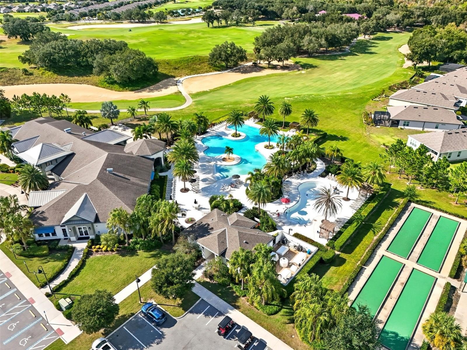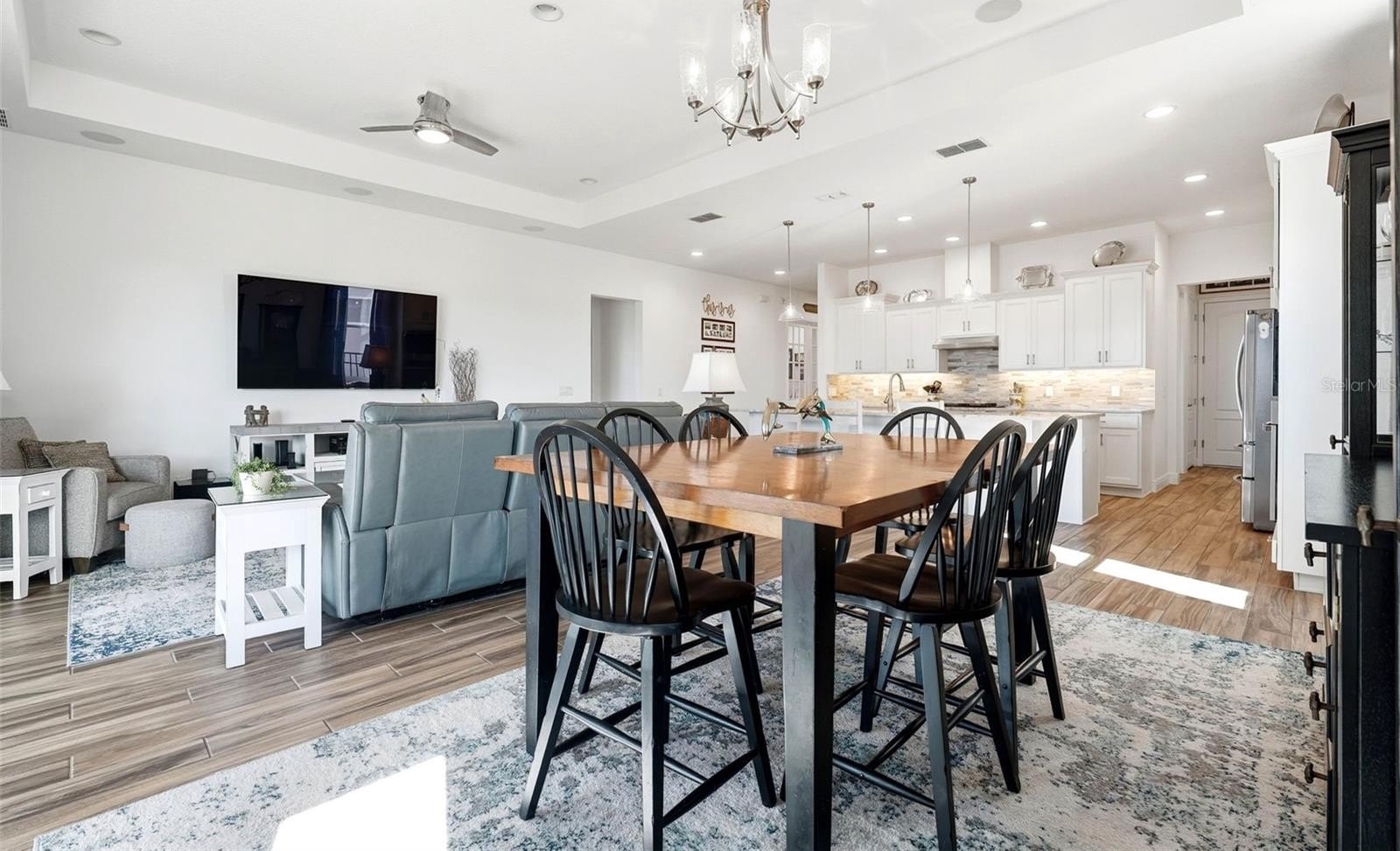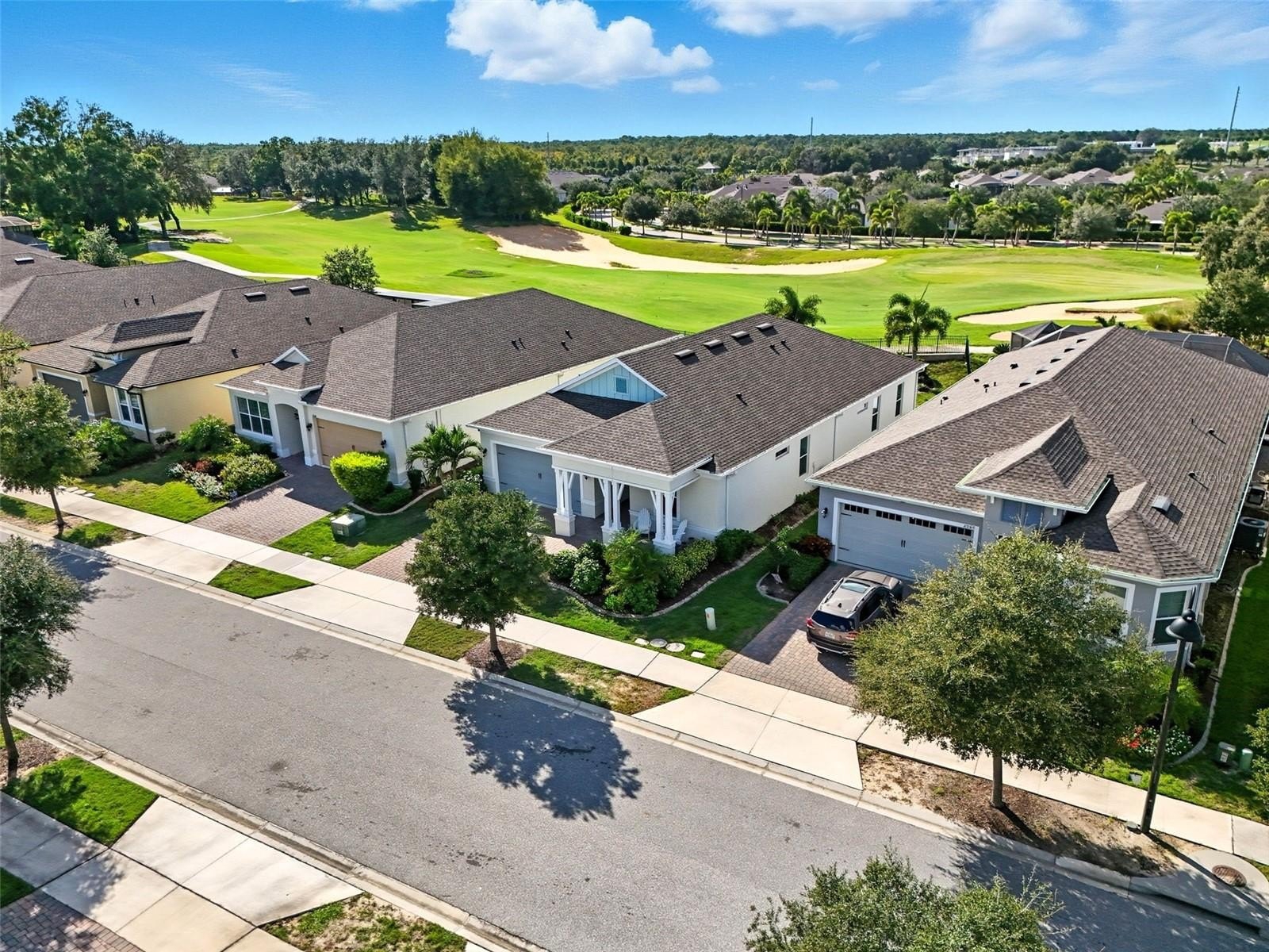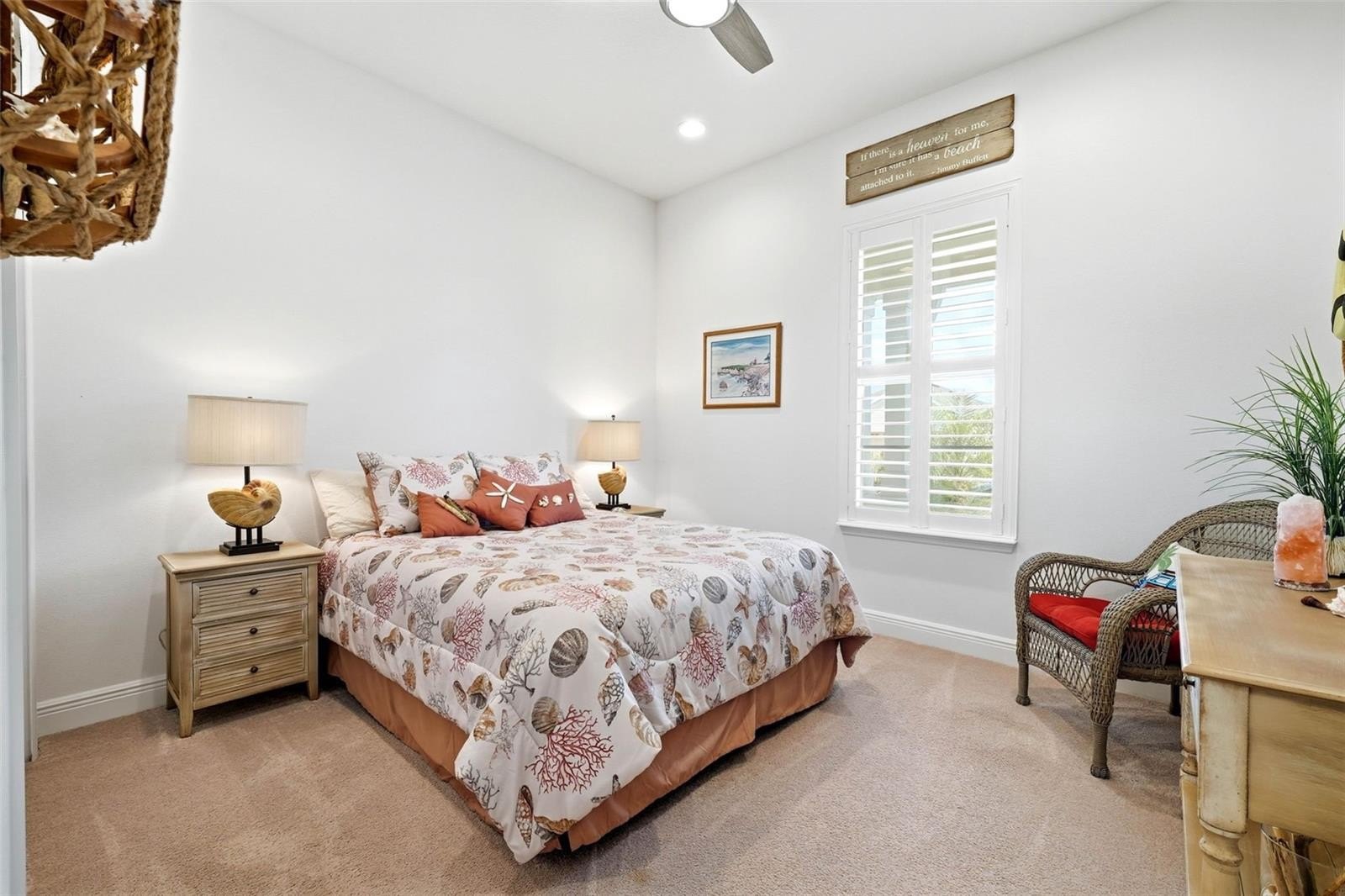 Welcome to resort-style living in the Four Seasons 55+ guard-gated community. This upgraded St. Lucia model blends coastal elegance with the Parrot-Head lifestyle in the open living space. Features include wood-look tile, 8’ doors, tray ceilings, designer lighting and fans. Split-bedroom plan ensures guest privacy. Expanded, builder-upgraded great room with dry bar is ideal for entertaining. Gourmet kitchen offers granite island, soft-close cabinets, GE Profile appliances, gas cooktop, vent hood, and LG refrigerator. Primary suite features golf course views, tray ceiling, and spa-style bath with dual-head shower, double vanity, and walk-in closet. Enjoy morning rocket launches from the front porch and amazing sunsets from the back covered lanai and fenced yard. HOA covers lawn care and irrigation. Amenities: clubhouses, pools, spa, tennis, pickleball, fitness center, and full-time activities director. Easy access to Disney World, Celebration, Universal, shopping, dining, and major routes to Orlando and Tampa airports, and both coasts.
