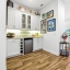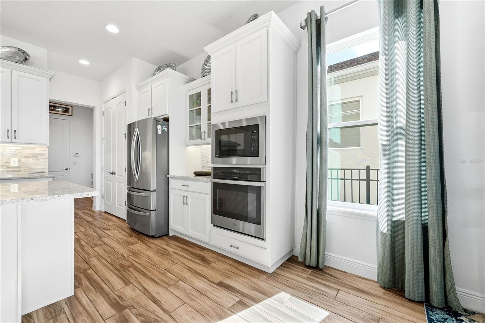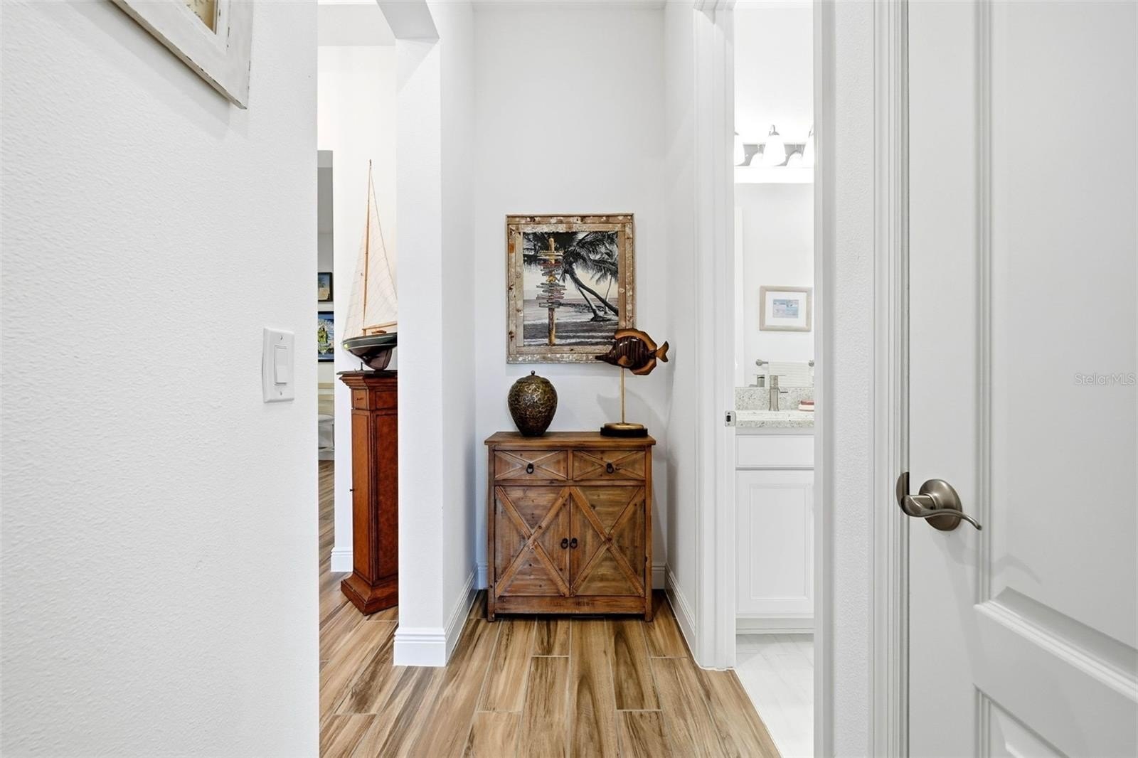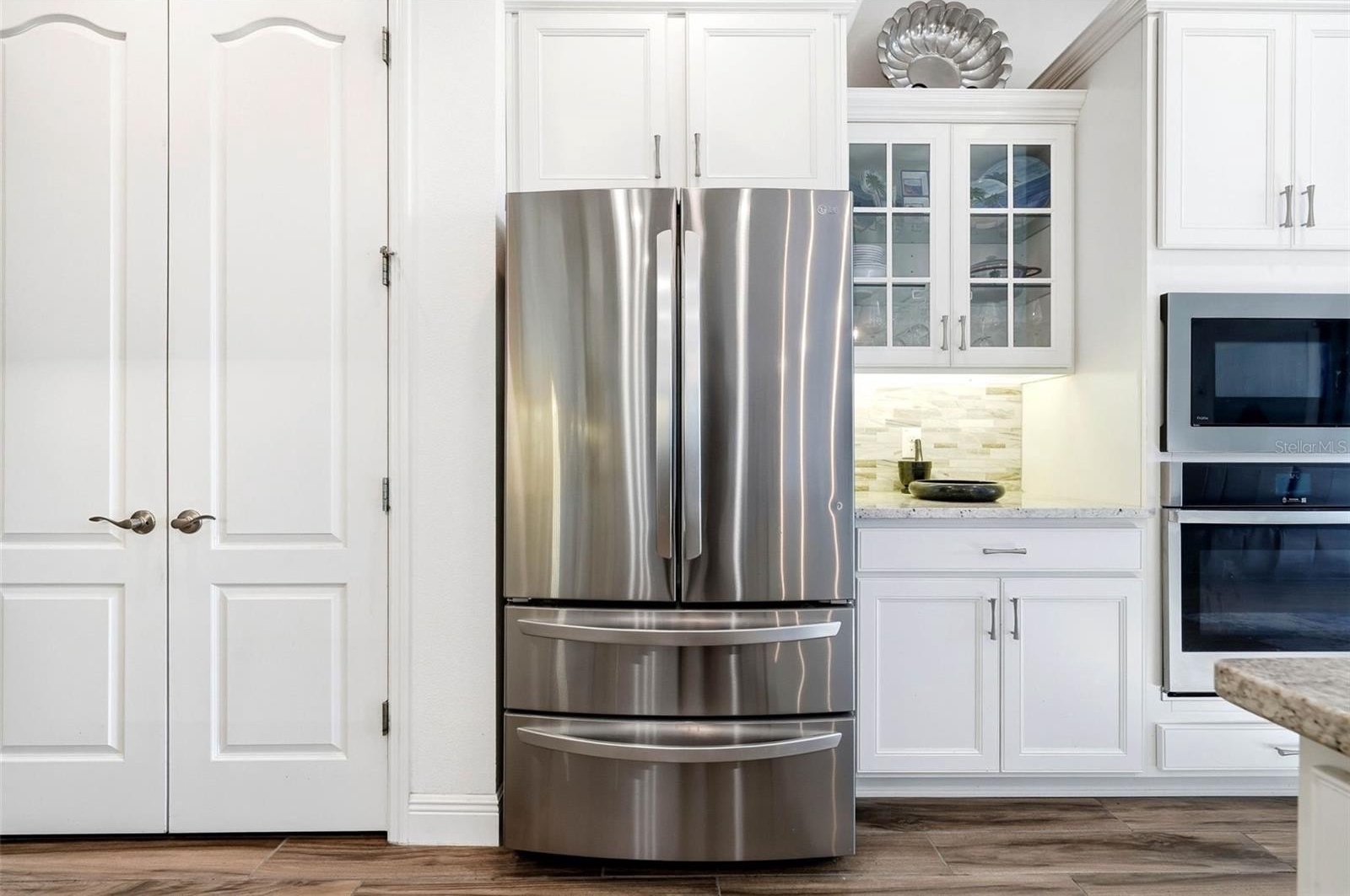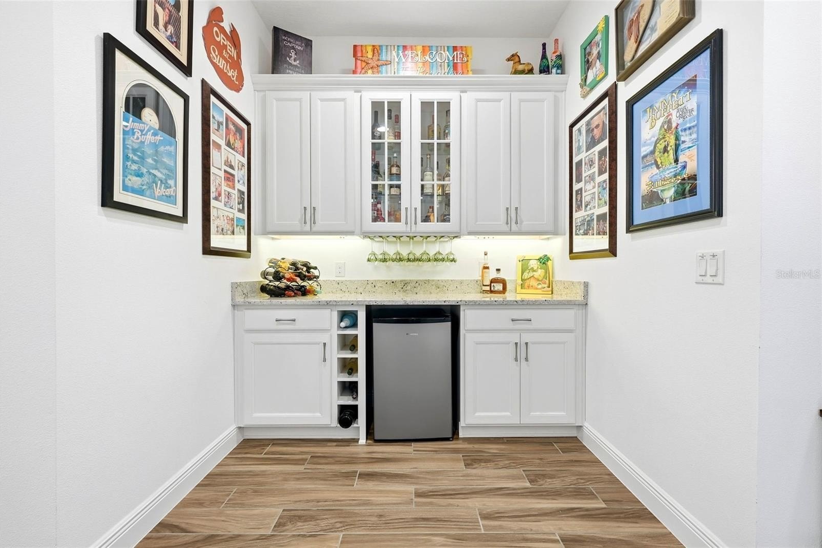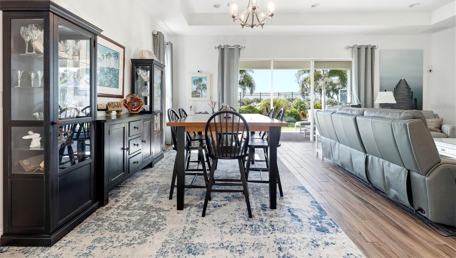 Welcome to resort-style living in the Four Seasons 55+ guard-gated community. This upgraded St. Lucia model blends coastal elegance with the Parrot-Head lifestyle in the open living space. Features include wood-look tile, 8’ doors, tray ceilings, designer lighting and fans. Split-bedroom plan ensures guest privacy. Expanded, builder-upgraded great room with dry bar is ideal for entertaining. Gourmet kitchen offers granite island, soft-close cabinets, GE Profile appliances, gas cooktop, vent hood, and LG refrigerator. Primary suite features golf course views, tray ceiling, and spa-style bath with dual-head shower, double vanity, and walk-in closet. Enjoy morning rocket launches from the front porch and amazing sunsets from the back covered lanai and fenced yard. HOA covers lawn care and irrigation. Amenities: clubhouses, pools, spa, tennis, pickleball, fitness center, and full-time activities director. Easy access to Disney World, Celebration, Universal, shopping, dining, and major routes to Orlando and Tampa airports, and both coasts.