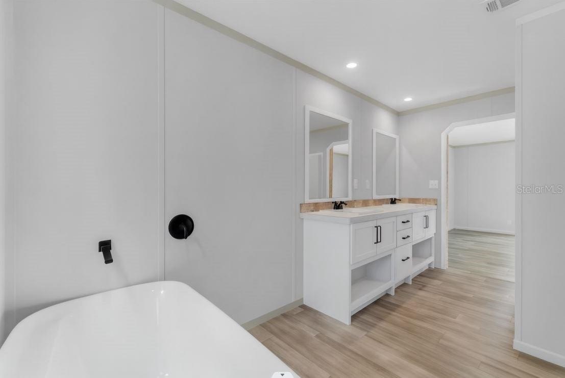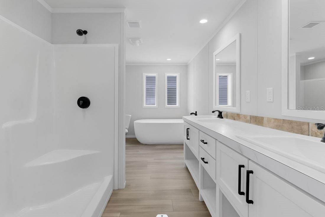 Own your own land with city sewer and city water! Experience the perfect blend of modern living and natural beauty with this BRAND-NEW manufactured home, situated on a lot that you own! Offering 3 bedrooms, 2 bathrooms, and over 1,400 square feet of thoughtfully designed living space. From the moment you arrive, you'll be charmed by the recessed dormer over the front door with vertical vinyl accent, and vinyl door and window trim. Step inside and immediately appreciate the high-quality finishes and attention to detail, from the 4-panel board and batten accent wall or the luxury linoleum flooring throughout, to the open- concept layout that effortlessly connects the living, dining, and kitchen areas-ideal for entertaining. The chef-inspired kitchen is a true highlight, featuring brand-new stainless steel appliances, a sleek chimney range hood, stainless steel sink with a gooseneck faucet, 42" shaker-style cabinets, and canopy-style pendant lighting hanging over the center with a breakfast bar. The primary bedroom offers a serene retreat, complete with a large walk-in closet and a luxurious en-suite bathroom featuring a free-standing soaking garden tub, separate 60" shower, and dual vanities with cubby holes and a bank of drawers-perfect for keeping all your essentials organized. Two additional bedrooms provide comfortable space for family or guests, while the second full bathroom includes a single vanity and a tub/shower combo, perfect for letting guests soak the day away! Additional upgrades include a