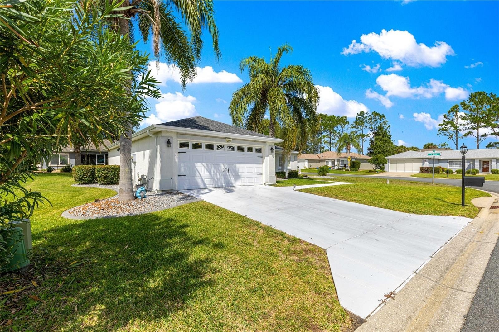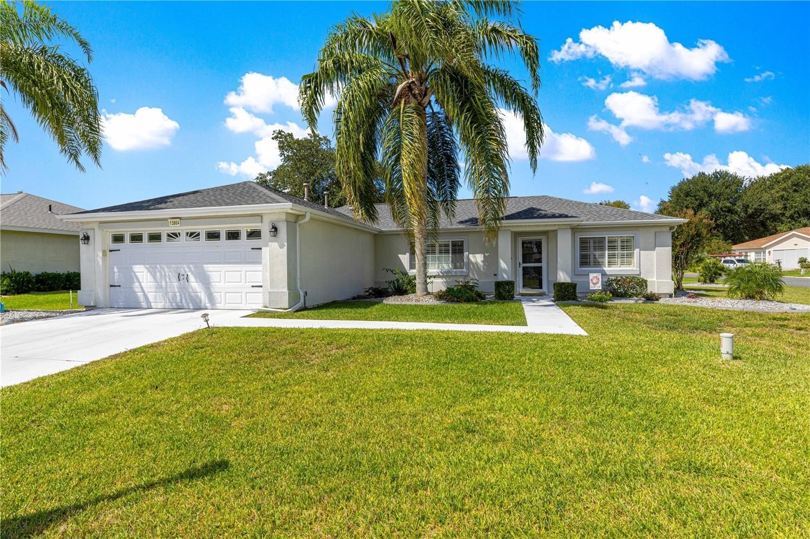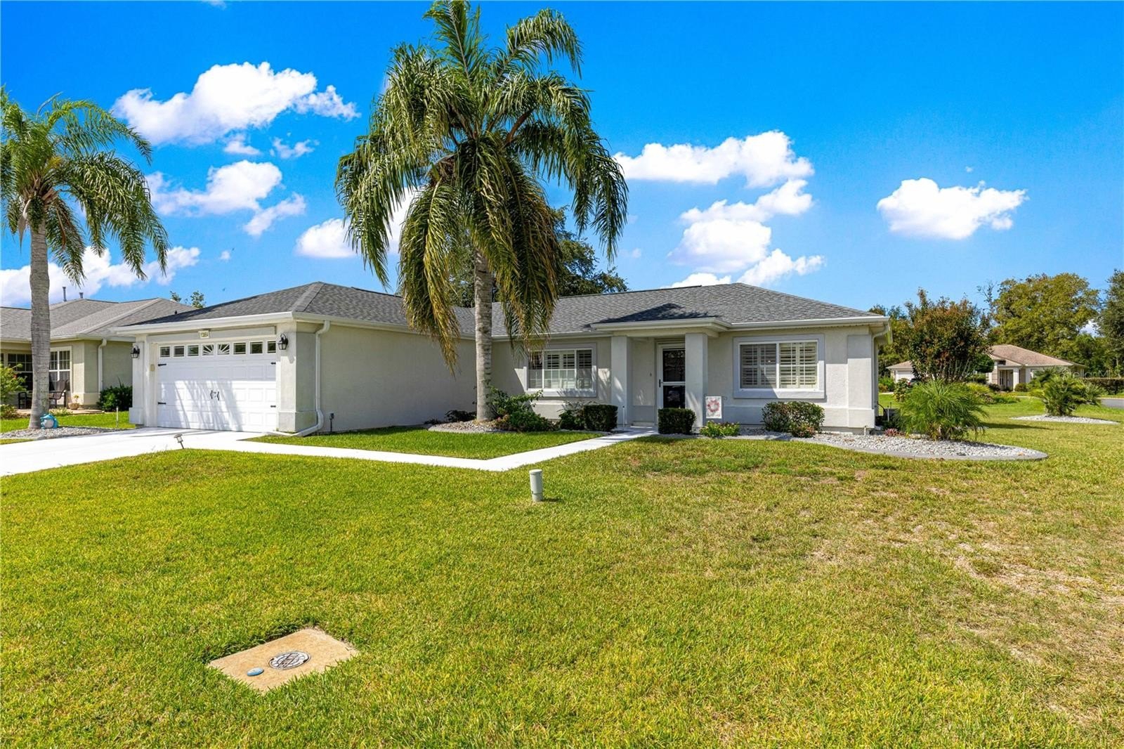 Welcome to this beautifully maintained and thoughtfully updated 2 bedroom, 2 bath Chesapeake floor plan. Located in the highly desirable 55+ Del Webb Spruce Creek Golf & Country Club. This stucco home offers 1,555 sq. ft. of living space, including the light filled Florida room, perfect for relaxing or entertaining. From the moment you arrive, you’ll notice the outstanding curb appeal, complete with a painted driveway and walkway, updated landscaping with concrete curbing, and a corner lot setting. Inside, the open floor plan is enhanced by a vaulted ceiling, recessed lighting, fresh interior paint, and a split floor plan. Interior highlights include Luxury vinyl plank flooring throughout (guest bedroom carpeted for comfort), newly purchased stainless steel appliances, plus washer and dryer (2025). White cabinetry with pull-outs, tiled back splash, and large farm style sink in the kitchen. Updated bathrooms, including an en-suite with a beautiful walk-in shower and new fixtures. Plantation shutters, updated lighting, and ceiling fans throughout, The primary suite features a bow window for added space, plus a large walk-in closet with custom organizers. Enjoy seamless entertaining with the open Florida room, kitchen pass-through, and a private outdoor patio-perfect for morning coffee, grilling out, or evening gatherings. Major updates for peace of mind are roofing re-shingled (2022) HVAC (2013), and new gutters with leaf guards (2025) for low-maintenance living. This home combines modern updates with a highly functional layout, all within a vibrant community offering golf, recreation, and endless amenities.