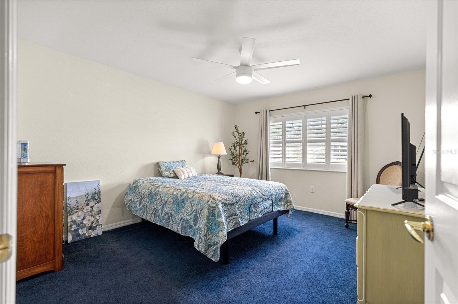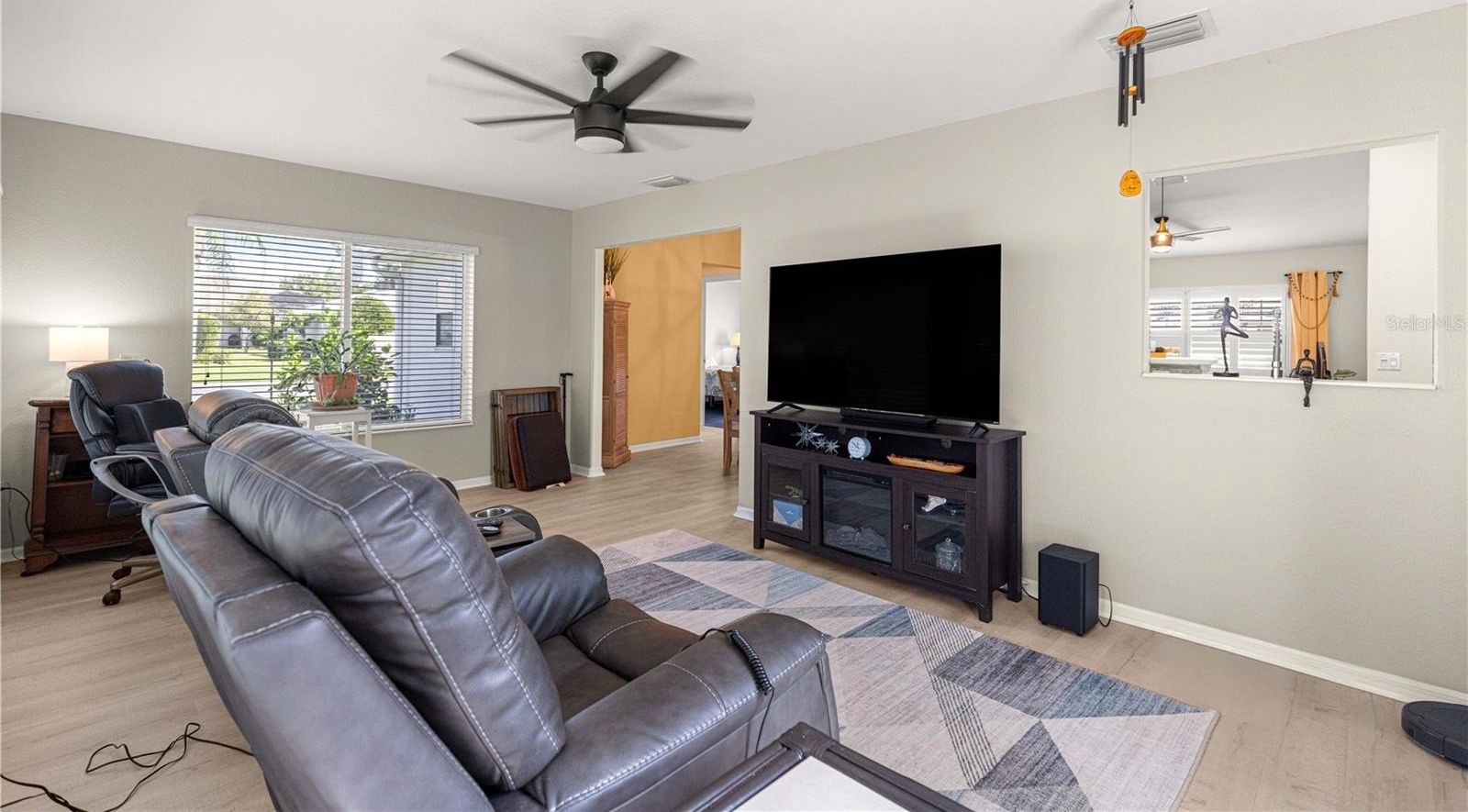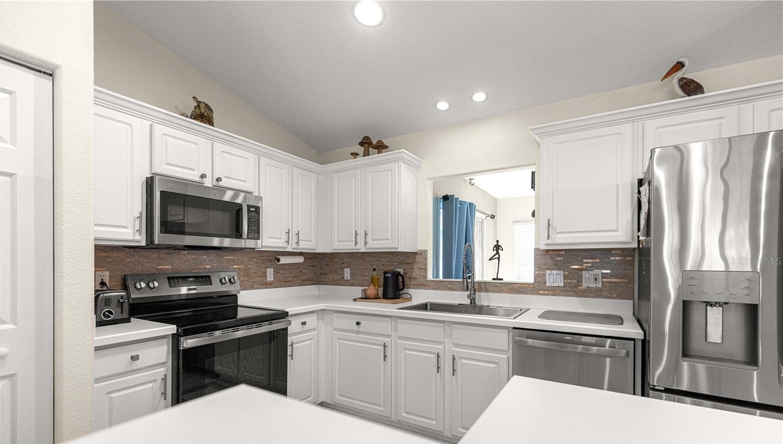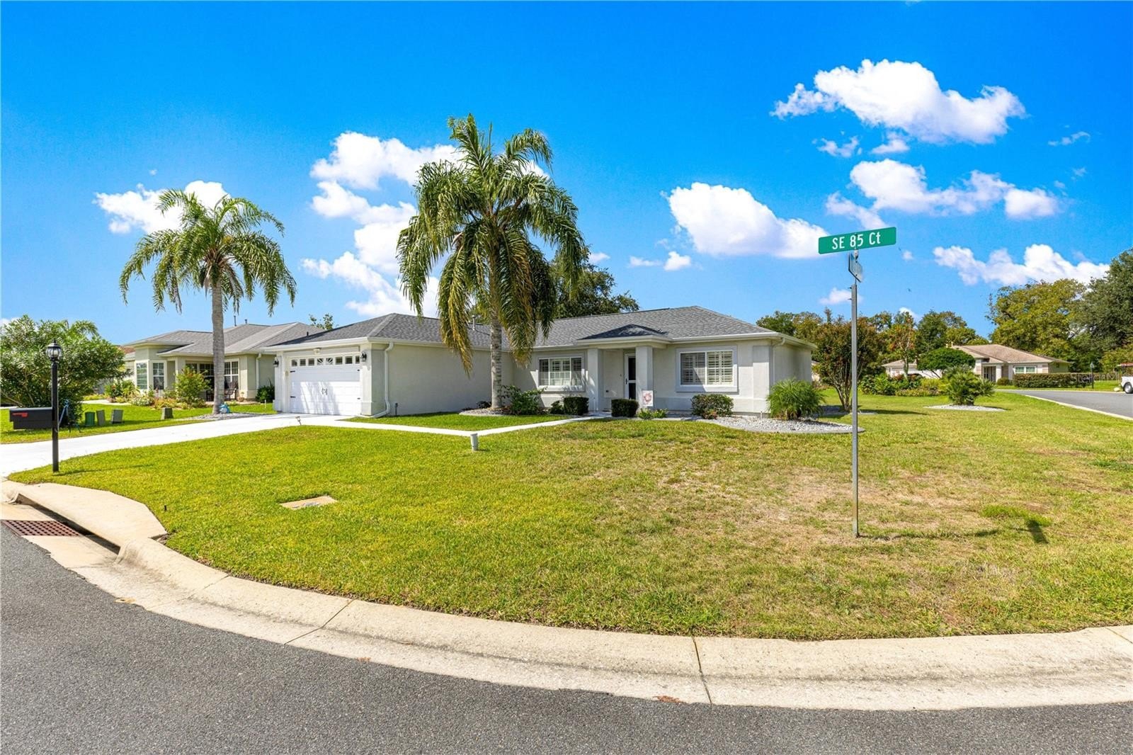 Welcome to this beautifully maintained and thoughtfully updated 2 bedroom, 2 bath Chesapeake floor plan. Located in the highly desirable 55+ Del Webb Spruce Creek Golf & Country Club. This stucco home offers 1,555 sq. ft. of living space, including the light filled Florida room, perfect for relaxing or entertaining. From the moment you arrive, you’ll notice the outstanding curb appeal, complete with a painted driveway and walkway, updated landscaping with concrete curbing, and a corner lot setting. Inside, the open floor plan is enhanced by a vaulted ceiling, recessed lighting, fresh interior paint, and a split floor plan. Interior highlights include Luxury vinyl plank flooring throughout (guest bedroom carpeted for comfort), newly purchased stainless steel appliances, plus washer and dryer (2025). White cabinetry with pull-outs, tiled back splash, and large farm style sink in the kitchen. Updated bathrooms, including an en-suite with a beautiful walk-in shower and new fixtures. Plantation shutters, updated lighting, and ceiling fans throughout, The primary suite features a bow window for added space, plus a large walk-in closet with custom organizers. Enjoy seamless entertaining with the open Florida room, kitchen pass-through, and a private outdoor patio-perfect for morning coffee, grilling out, or evening gatherings. Major updates for peace of mind are roofing re-shingled (2022) HVAC (2013), and new gutters with leaf guards (2025) for low-maintenance living. This home combines modern updates with a highly functional layout, all within a vibrant community offering golf, recreation, and endless amenities.