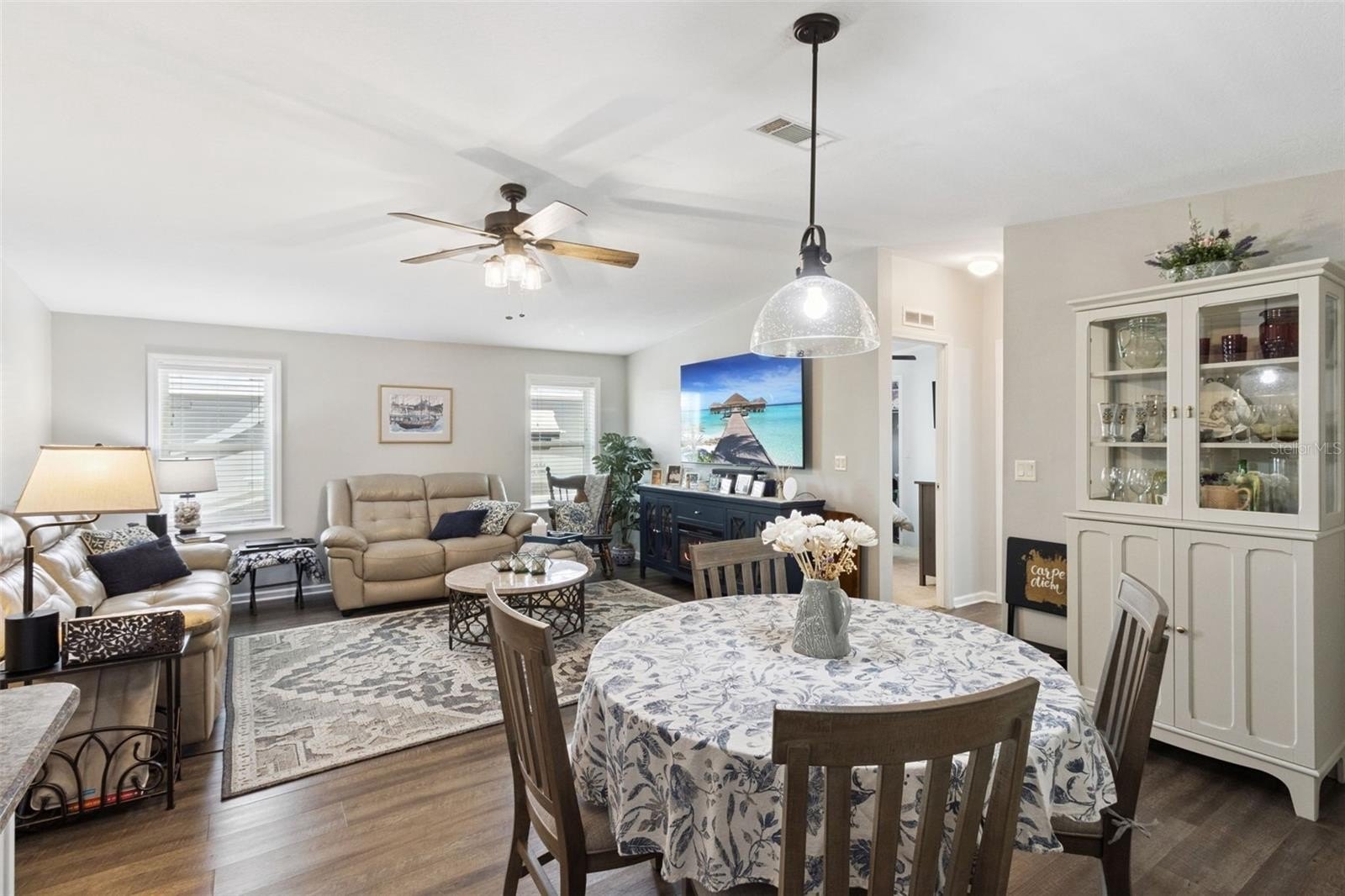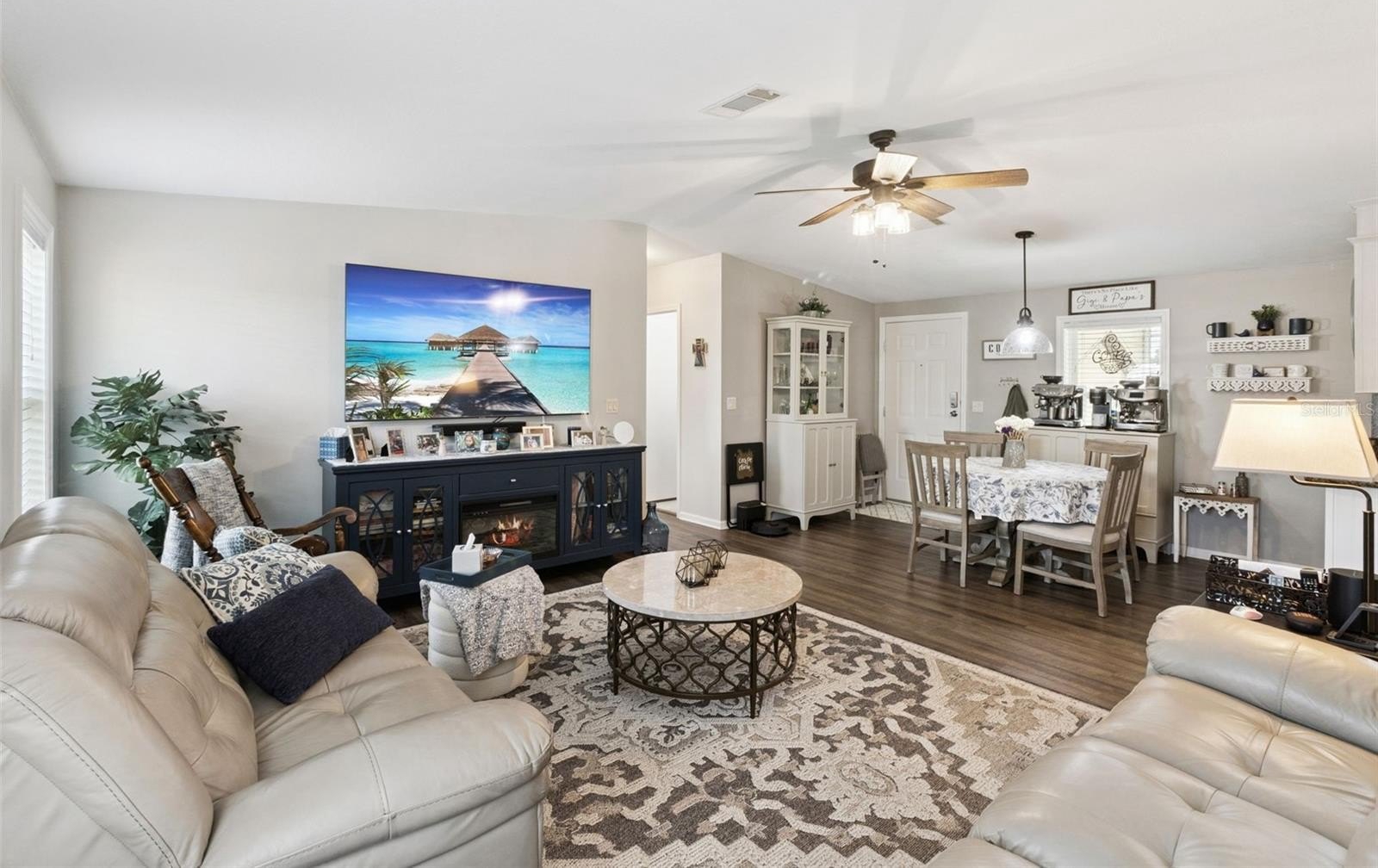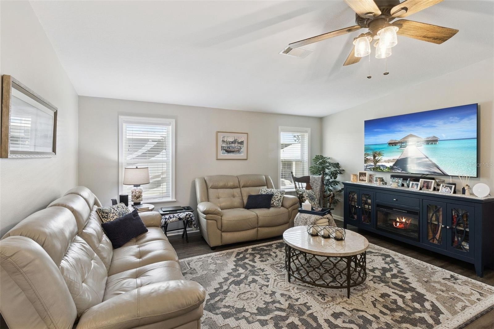 Throughout the home, the elegance continues with ceramic tile in the kitchen and bathrooms, complemented by stylish luxury vinyl flooring in the living and dining areas, as well as in the guest closets. Modern lighting and ceiling fans throughout enhance the inviting atmosphere.