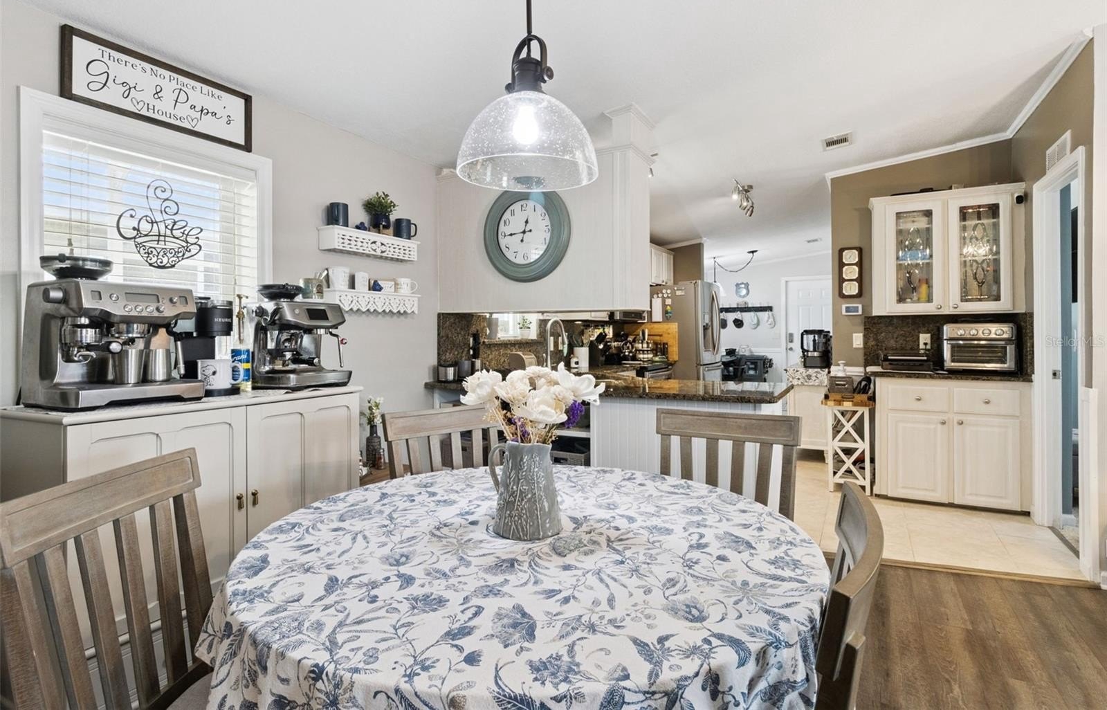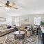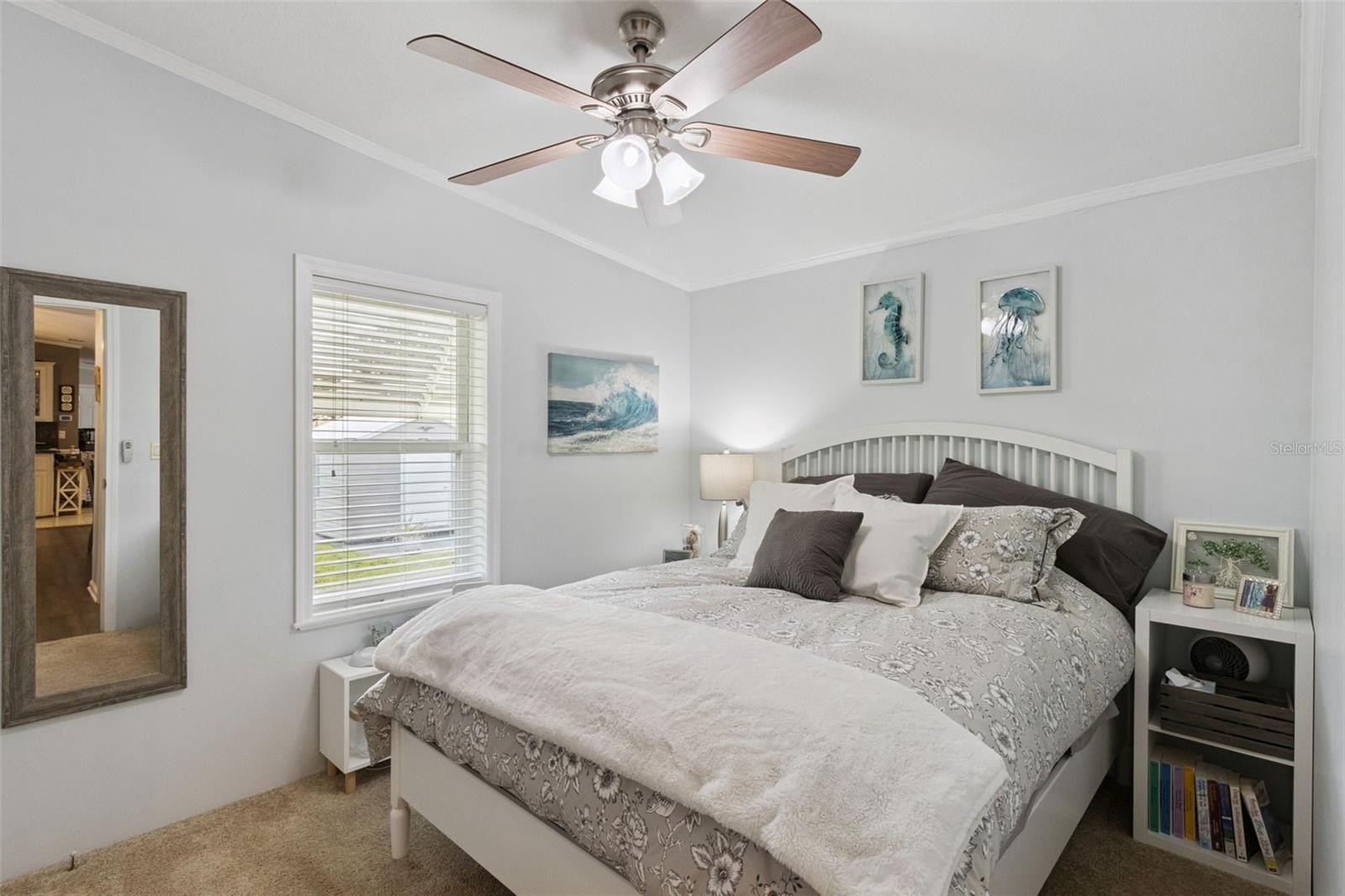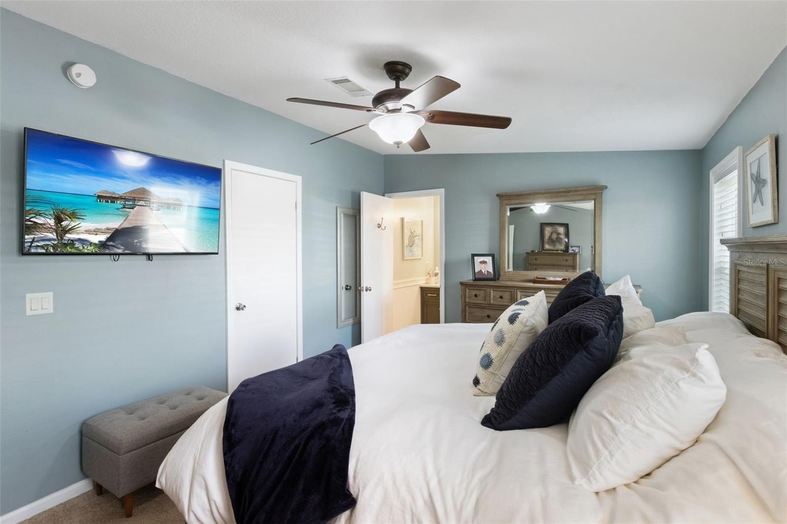 Throughout the home, the elegance continues with ceramic tile in the kitchen and bathrooms, complemented by stylish luxury vinyl flooring in the living and dining areas, as well as in the guest closets. Modern lighting and ceiling fans throughout enhance the inviting atmosphere.