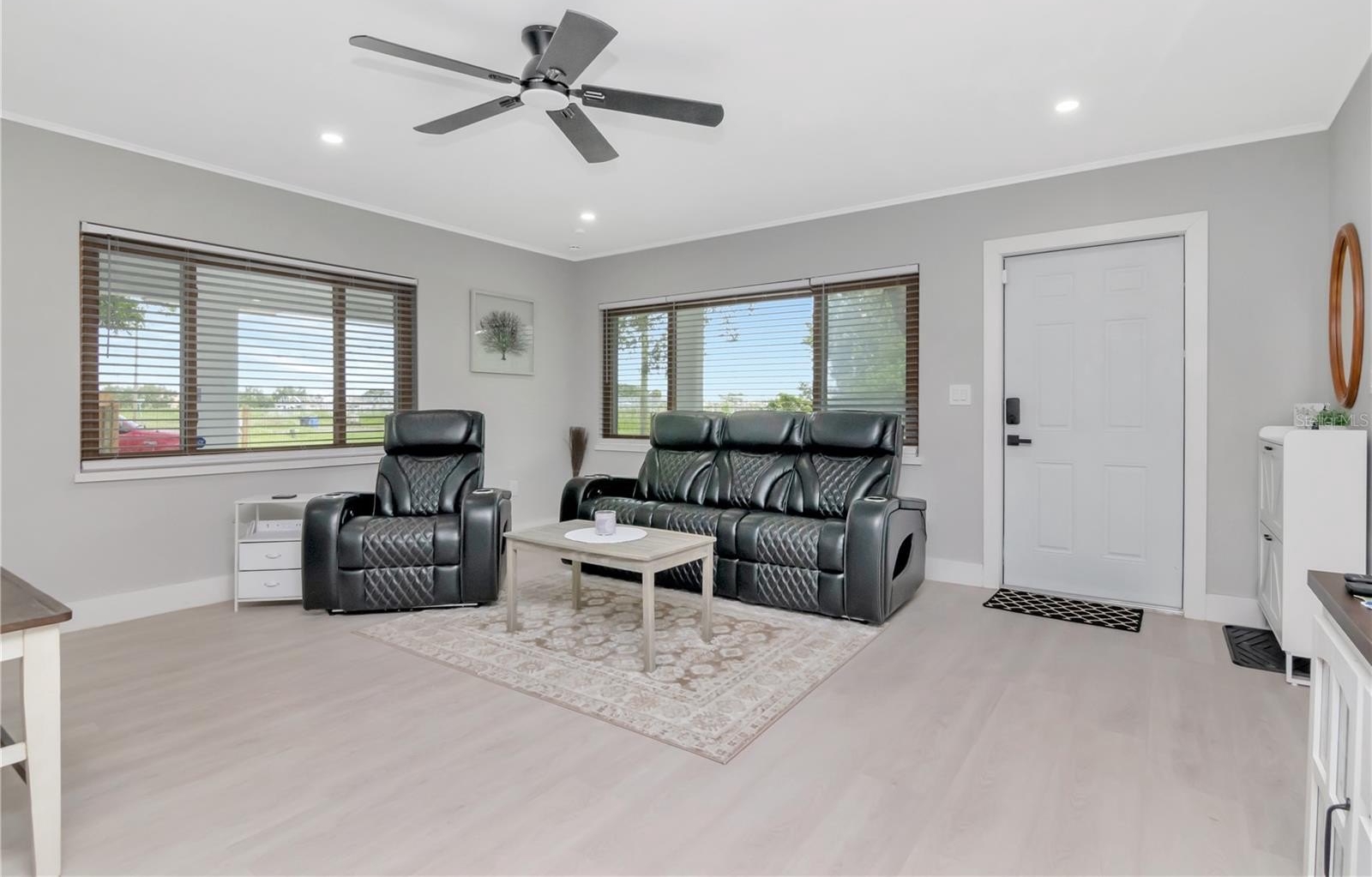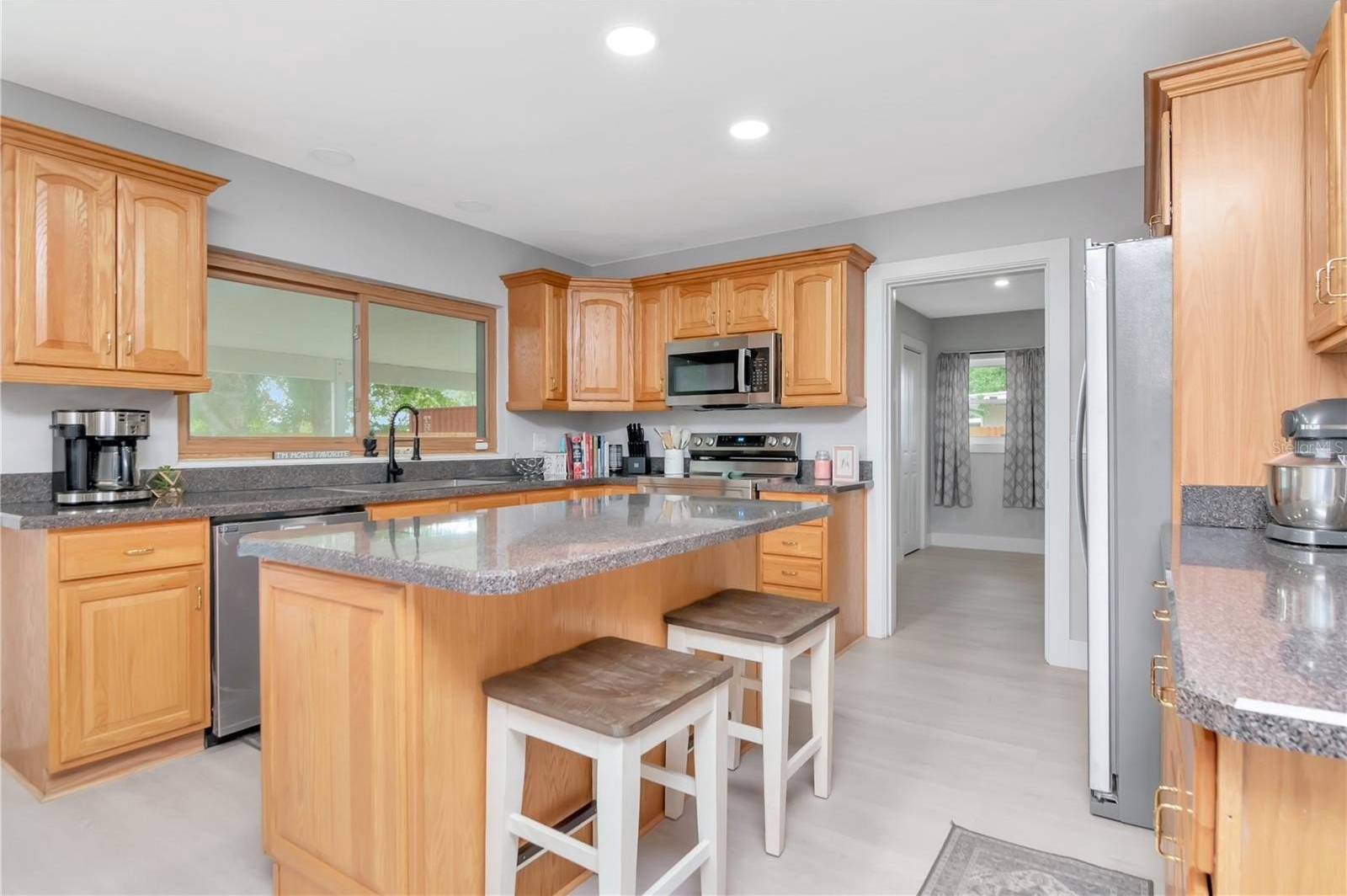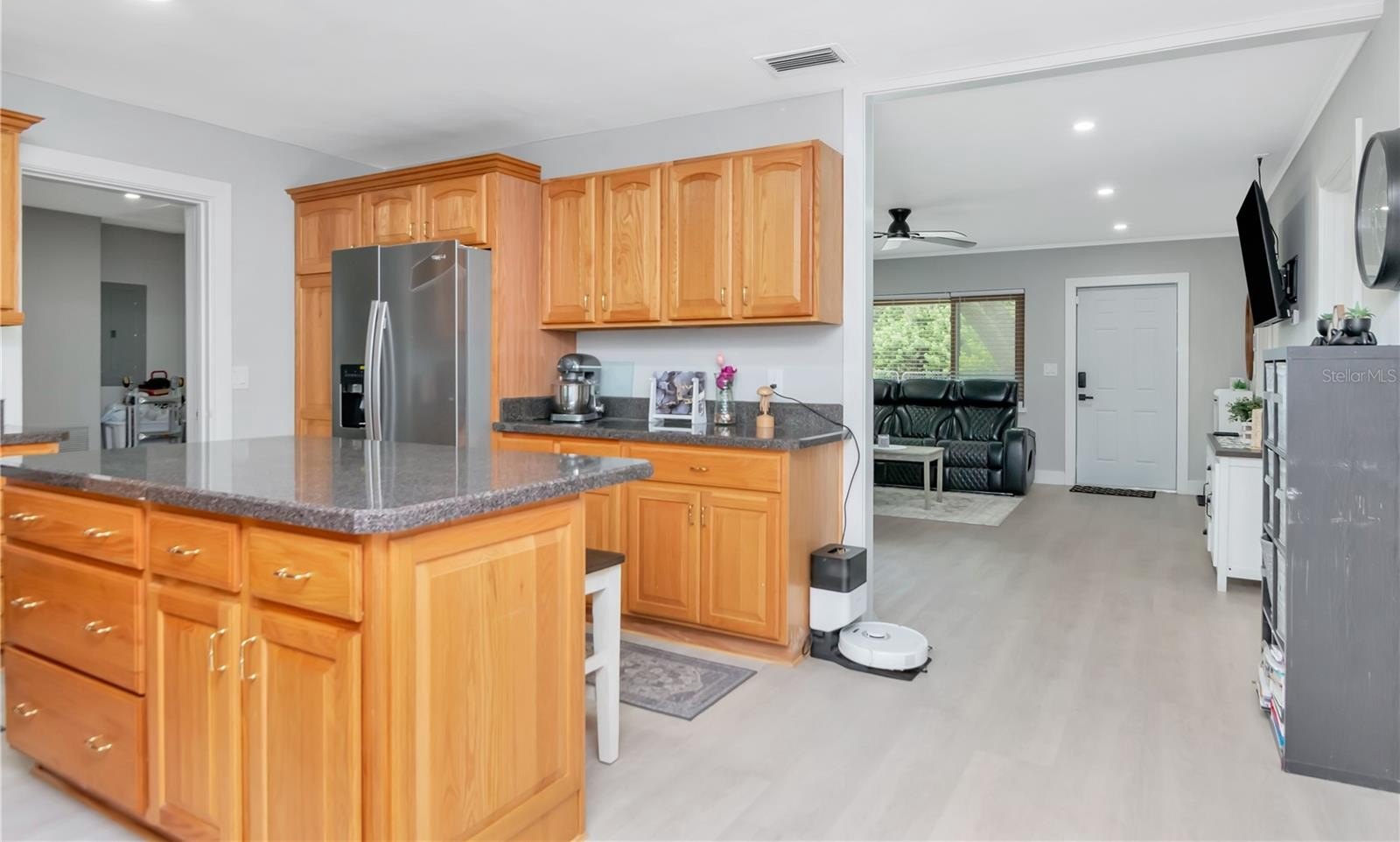 The heart of the home is the well-appointed kitchen, boasting granite countertops, rich wood cabinetry, and a new appliance package—perfect for cooking and entertaining. The open-concept living area provides ample space for relaxing or hosting guests.