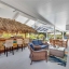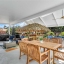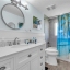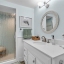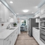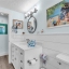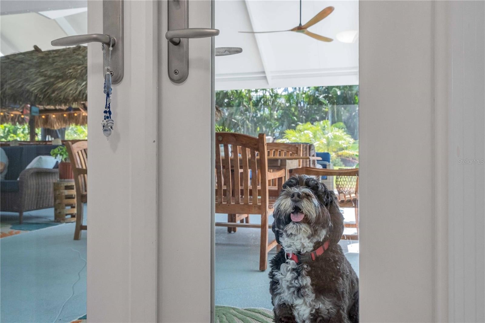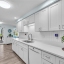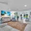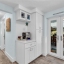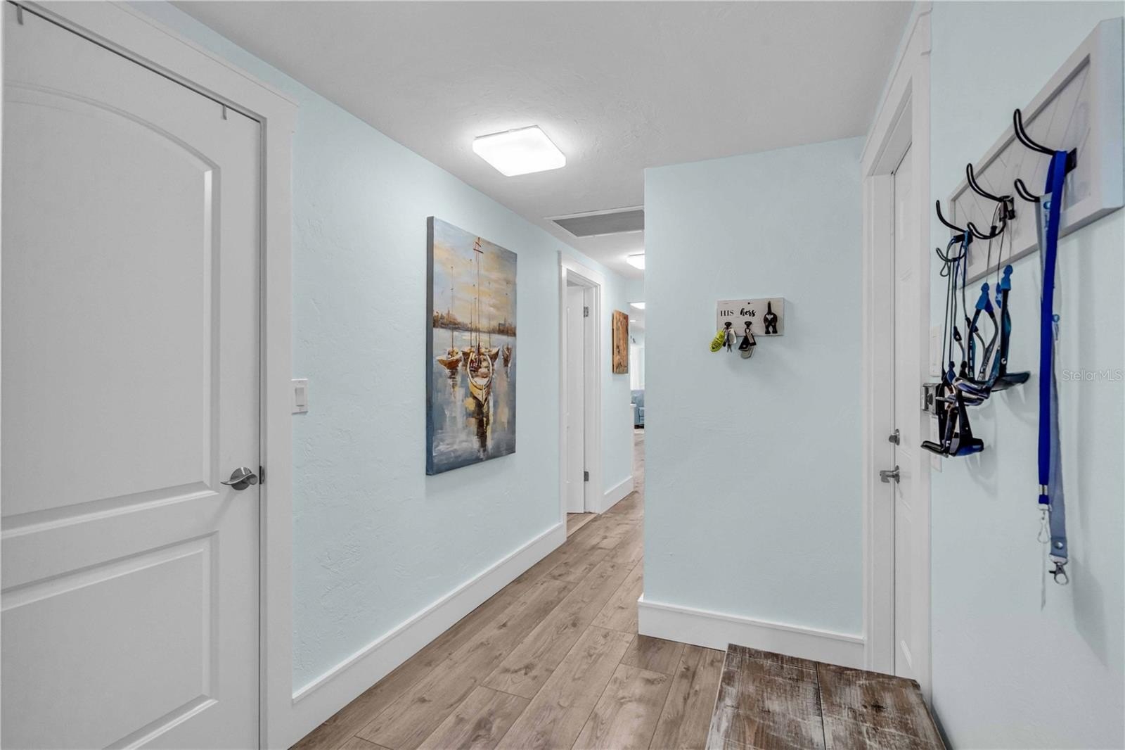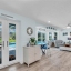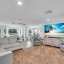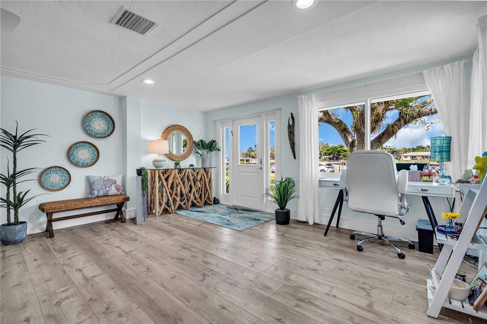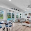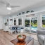 Inside, the home continues to impress with clean coastal finishes and modern functionality. The kitchen is bright and welcoming, with white cabinetry, quartz countertops, stainless steel appliances, and convenient slide-out pantry drawers. A built-in banquette offers the perfect casual dining spot, in addition to a more formal dining area. Both bathrooms are updated with quartz countertops and coastal-inspired cabinetry, including charming manatee cabinet knobs that add a playful touch. Storage is abundant throughout thanks to custom California Closets, and peace of mind comes easy with all-new plumbing (2023), a new roof (2022), and impact-resistant windows and sliding glass doors that let the natural light pour in.