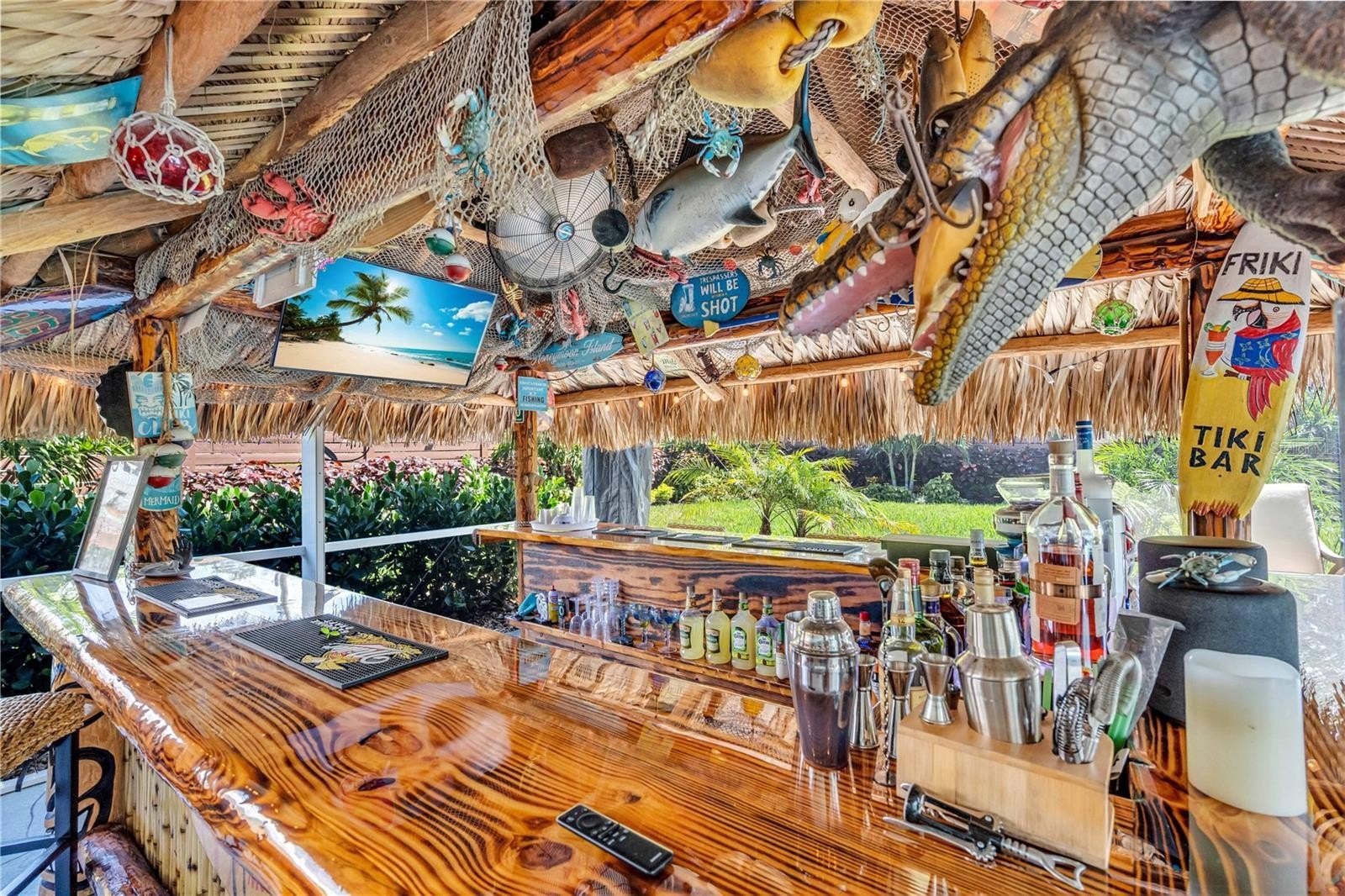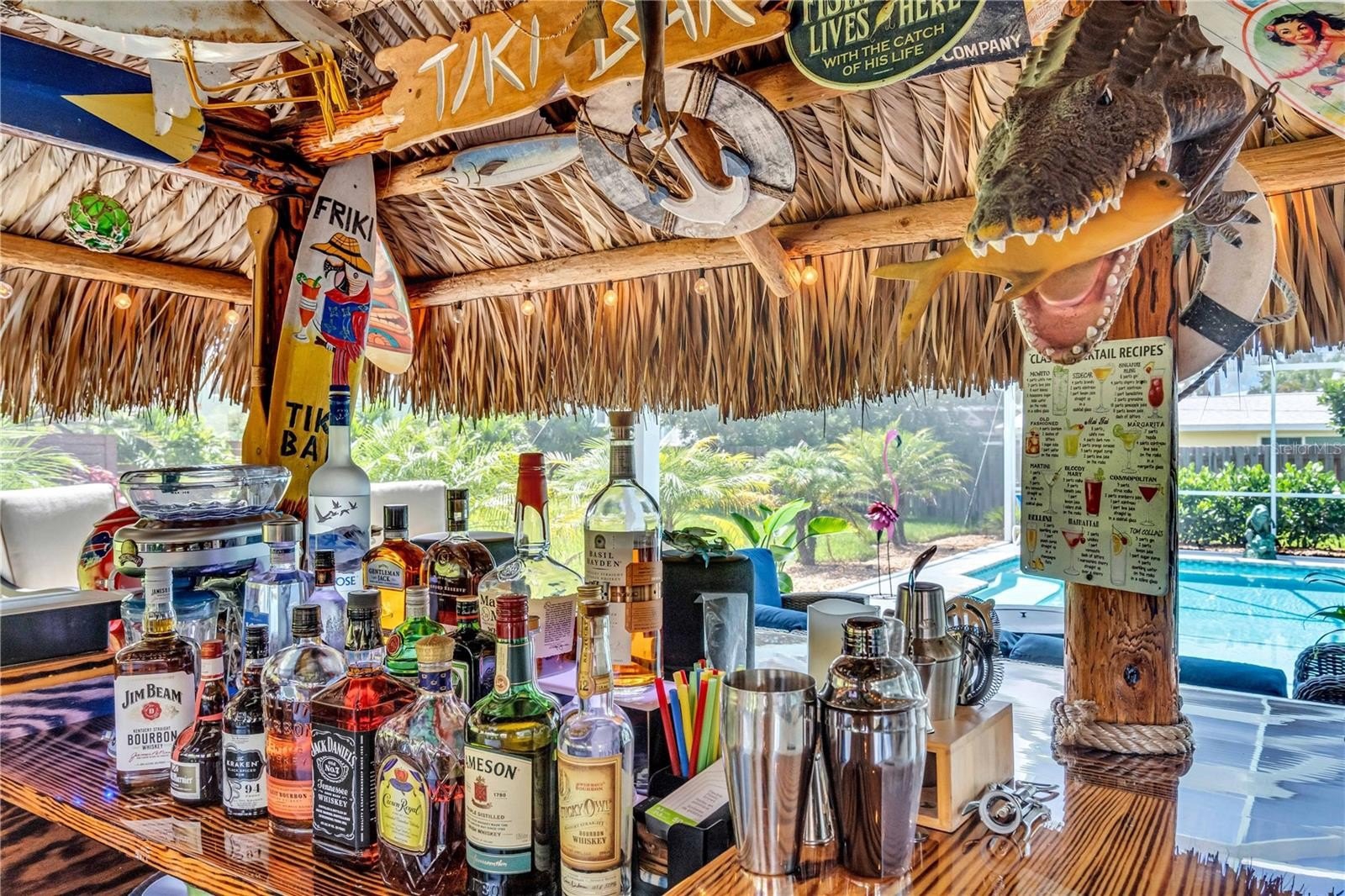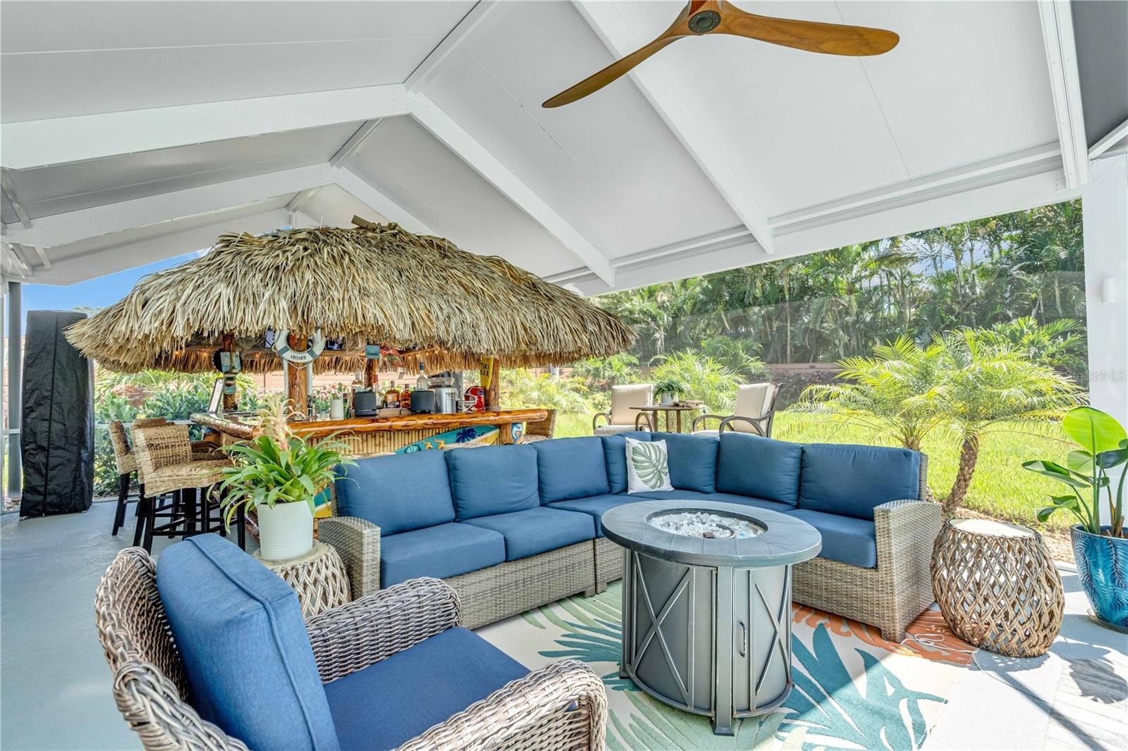Welcome to your personal tropical retreat in the heart of Palma Sola Park—one of Bradenton’s most beloved waterfront communities. This beautifully updated 2-bedroom, 2-bath, 2-car garage coastal home blends laid-back luxury with thoughtful upgrades and a lifestyle that’s truly unmatched. From the moment you arrive, you’ll be drawn to the newly completed pool and patio deck (2024), designed as a true outdoor oasis. The pool features brand-new coping, tile, and all-new equipment, including a salt cell, heat and cool pump, filter, and skimmer—all installed in 2023. The highlight of the backyard is the incredible custom-built Tiki Bar (2023), crafted with real palm fronds and designed to entertain. Seating up to 12 guests comfortably, the bar is fully equipped with electric, air cooling, and a mounted TV, creating a year-round resort-style experience right in your own backyard.