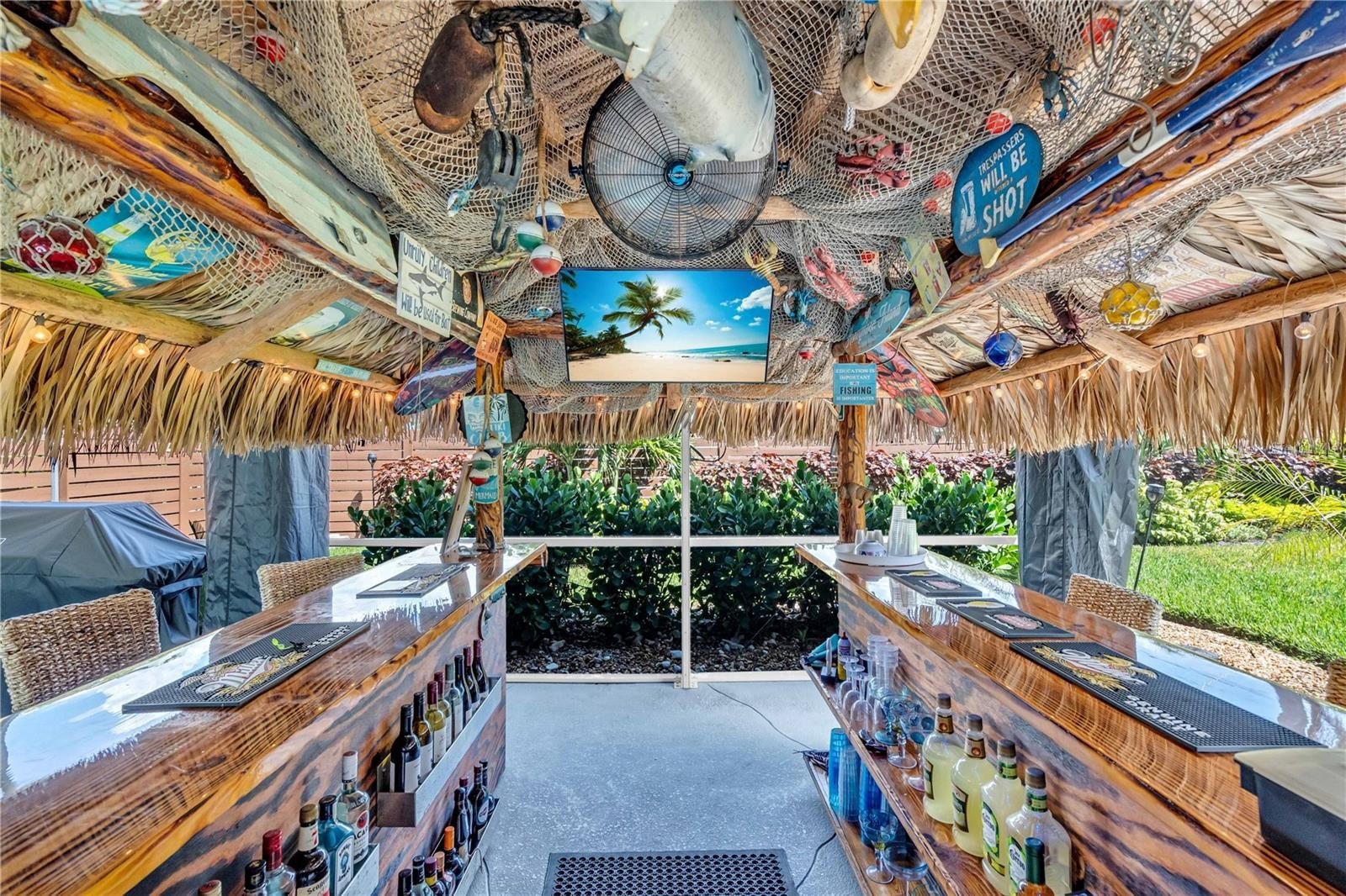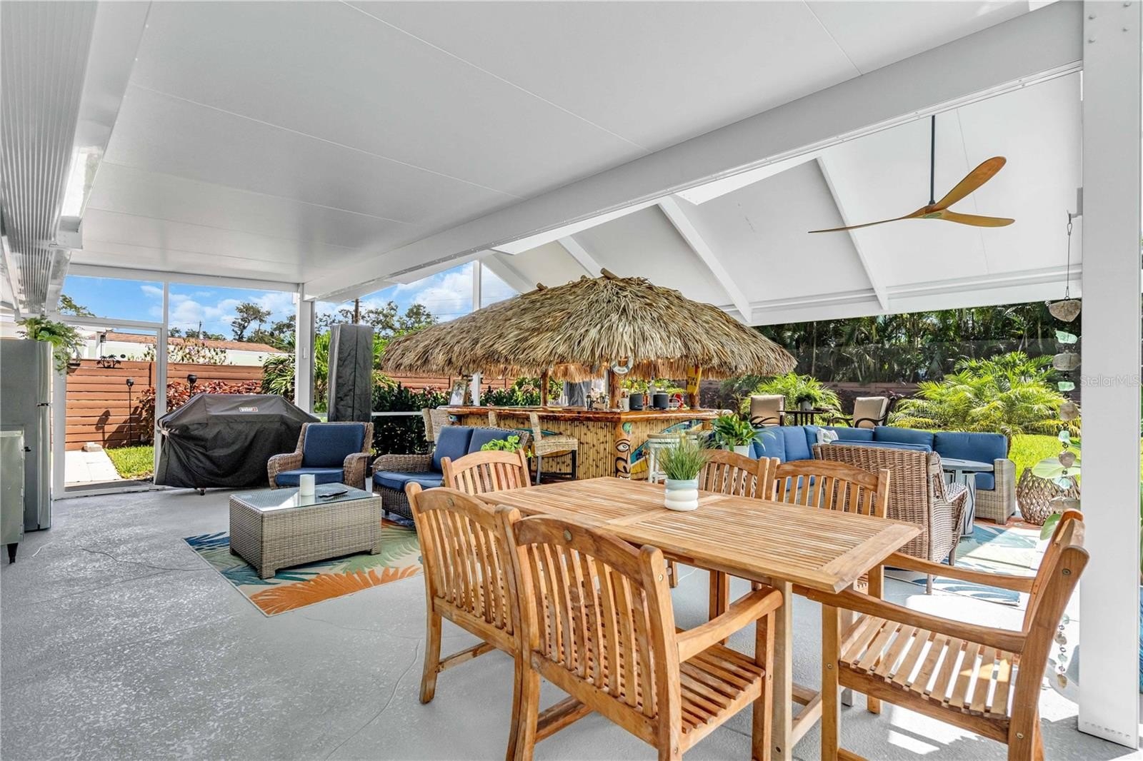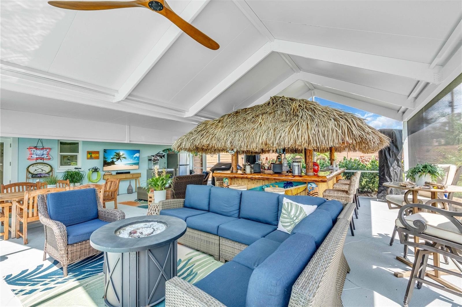 Welcome to your personal tropical retreat in the heart of Palma Sola Park—one of Bradenton’s most beloved waterfront communities. This beautifully updated 2-bedroom, 2-bath, 2-car garage coastal home blends laid-back luxury with thoughtful upgrades and a lifestyle that’s truly unmatched. From the moment you arrive, you’ll be drawn to the newly completed pool and patio deck (2024), designed as a true outdoor oasis. The pool features brand-new coping, tile, and all-new equipment, including a salt cell, heat and cool pump, filter, and skimmer—all installed in 2023. The highlight of the backyard is the incredible custom-built Tiki Bar (2023), crafted with real palm fronds and designed to entertain. Seating up to 12 guests comfortably, the bar is fully equipped with electric, air cooling, and a mounted TV, creating a year-round resort-style experience right in your own backyard.