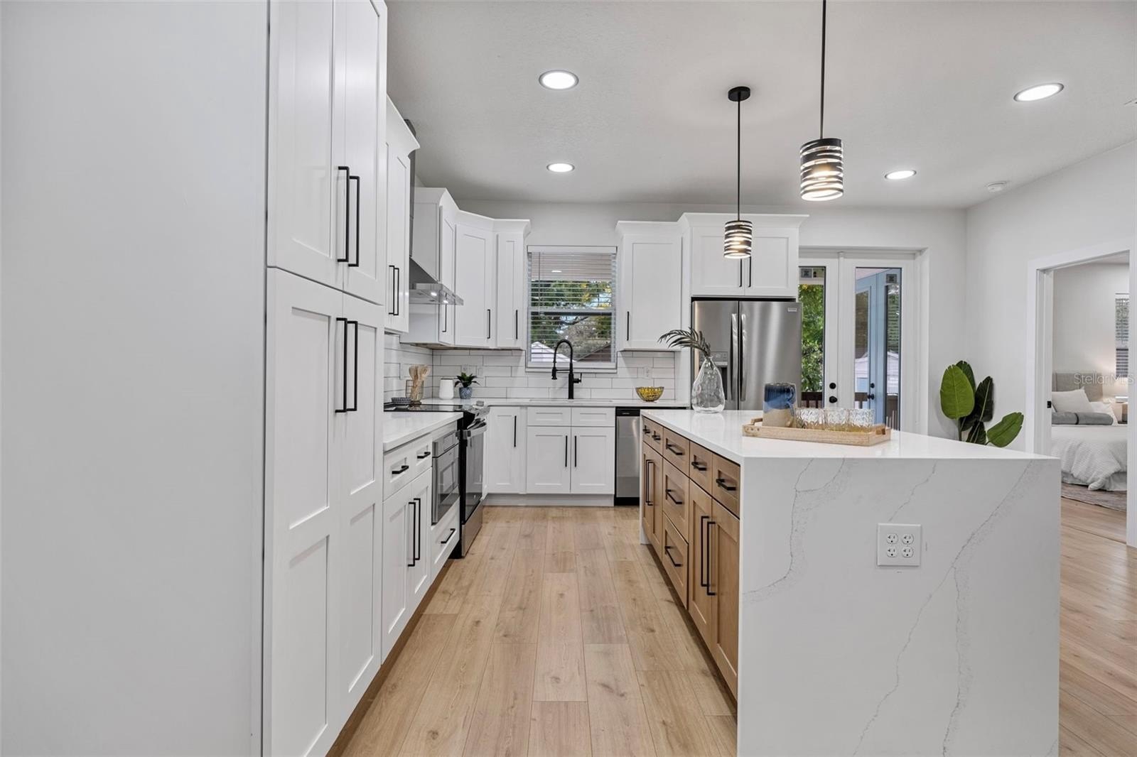 The gourmet kitchen features quartz countertops, stainless steel appliances, custom cabinetry, and a large center island ideal for entertaining. The spacious living and dining areas flow seamlessly together, creating a warm and inviting atmosphere. The owner’s suite includes a walk-in closet and a spa-inspired bathroom with dual vanities, a soaking tub, and a glass-enclosed shower.