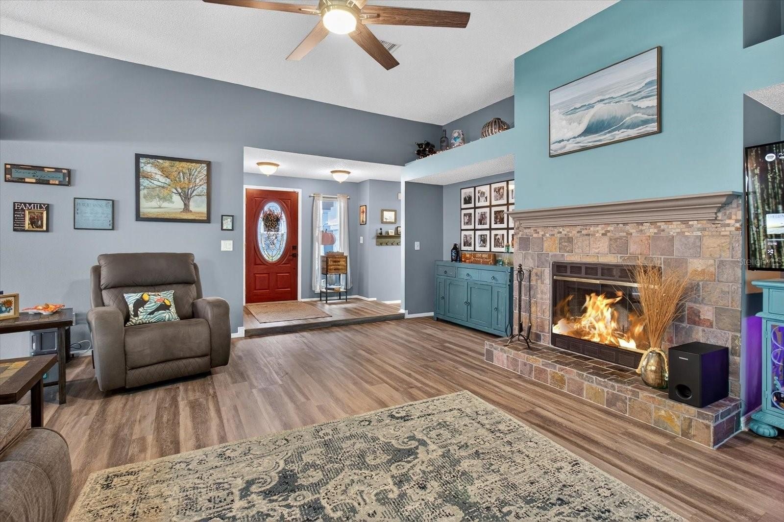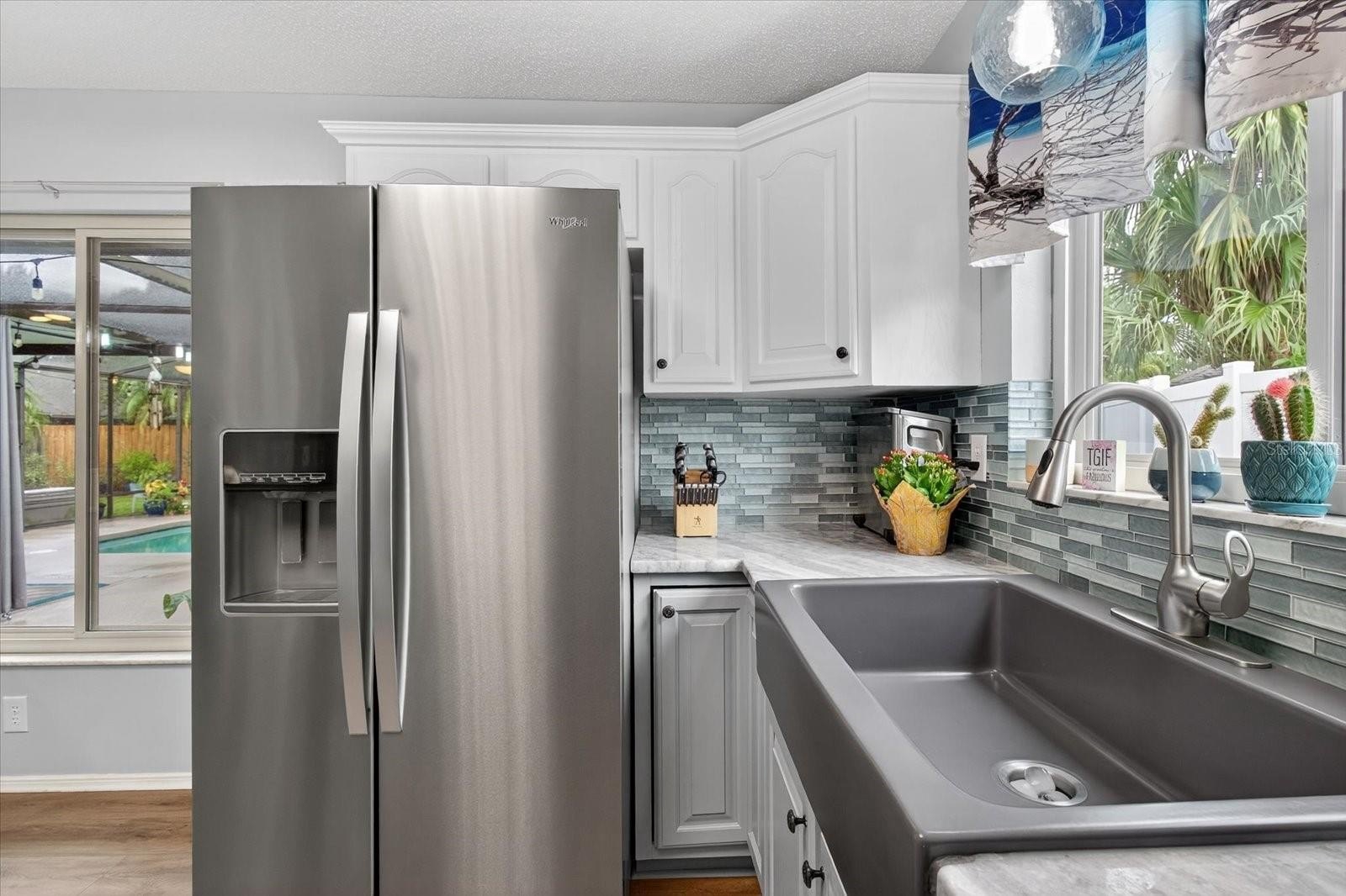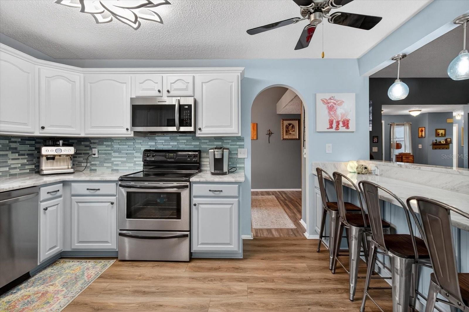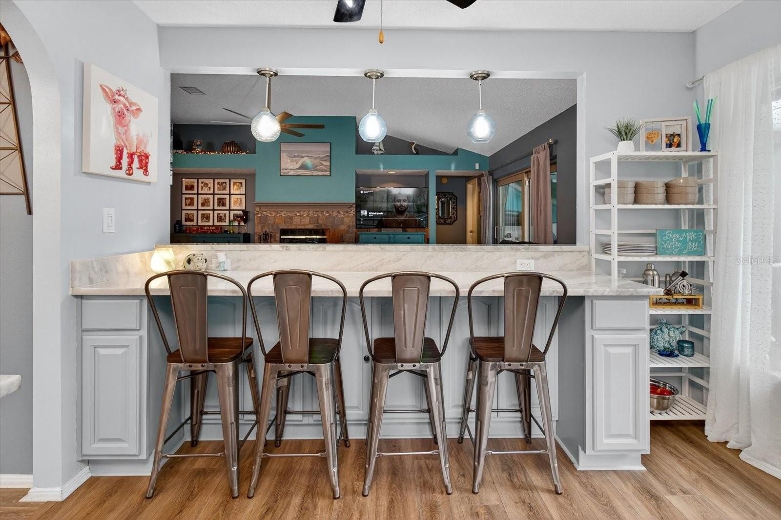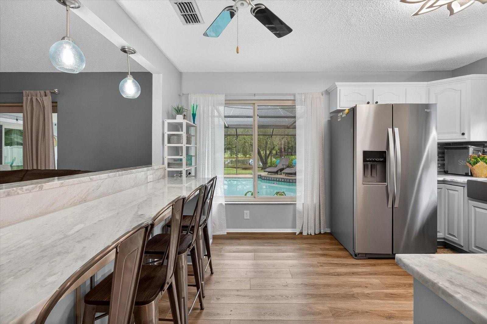 Step inside to find a spacious living room with a cozy fireplace, ideal for family gatherings or quiet evenings at home. The kitchen has been tastefully updated with brand-new marble countertops, a stylish tile backsplash, modern appliances, and a breakfast bar that overlooks the living room—perfect for casual dining and entertaining. The primary bedroom offers a private ensuite, walk-in closet, and sliders leading directly to the backyard and pool area, creating the perfect indoor-outdoor retreat. The guest bathroom features new shower tile, adding a fresh and modern touch.