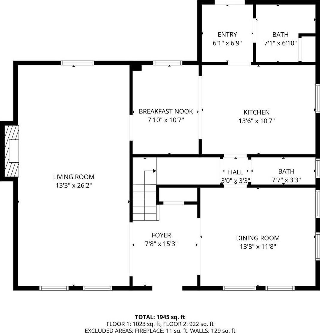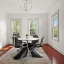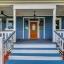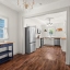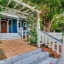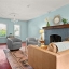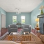 The home’s soft blue exterior, framed by century oaks and a white picket fence, embodies the grace and craftsmanship of the period. The broad front porch welcomes you into a light-filled foyer that immediately conveys the sense of history and hospitality this home has long represented. To the left, a spacious living room stretches nearly twenty-six feet, centered around a painted brick fireplace and surrounded by windows that capture the natural light from morning to evening. The adjoining formal dining room retains its original millwork and seamlessly connects to a cheerful kitchen, designed with both charm and functionality in mind. The kitchen features butcher-block counters, glass-front cabinetry, open shelving, and a breakfast nook overlooking the backyard.