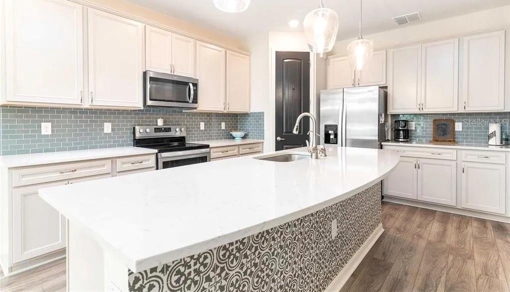 Welcome to this stunning 5 bedroom, 3 bath, 2 car garage with a huge BONUS room. The home in the desirable gated community of Epperson Ranch community featuring the FIRST NATIONAL CRYSTAL LAGOON! Citrus Grove model & CUSTOM DESIGNED, At the heart of the home is the beautiful kitchen with gleaming quartz countertops, ample storage space including a pantry, sleek tile backsplash, and all stainless steel appliances. The large working island extends out to a counter-height breakfast bar and overlooks the spacious family room and the dining area, so you never have to miss out on a thing! The spacious first-floor master suite includes a dual-sink vanity, walk-in closet, and a large walk-in shower. The 2nd bedroom and bath are on the first floor as well which is perfect for your guest or your home office. Upstairs you will find the 3 additional bedrooms with walk-in closets and a massive bonus room, which makes for the perfect game room, play area, exercise room, home theater, or anything you want! The large backyard is great to play or have a relaxing evening on your back lanai with your beautiful pond view. The lagoon features sandy beaches, cabanas, waterslides, and water toy rentals. Epperson is an ultrafine community, offering the fastest internet speeds run over an all-fiber network. Cable and internet are included in your HOA fee. Epperson is a golf cart-friendly community with trails and tunnels throughout the neighborhood. Additional parks, playgrounds, dog parks,s and green spaces located throughout the community make this the perfect place to live and play! The community is in the heart of Wesley Chapel, close to the best shopping and dining options, and convenient access to highways for a quick commute to downtown, or the Tampa Airport. Come take a look and see all this community.