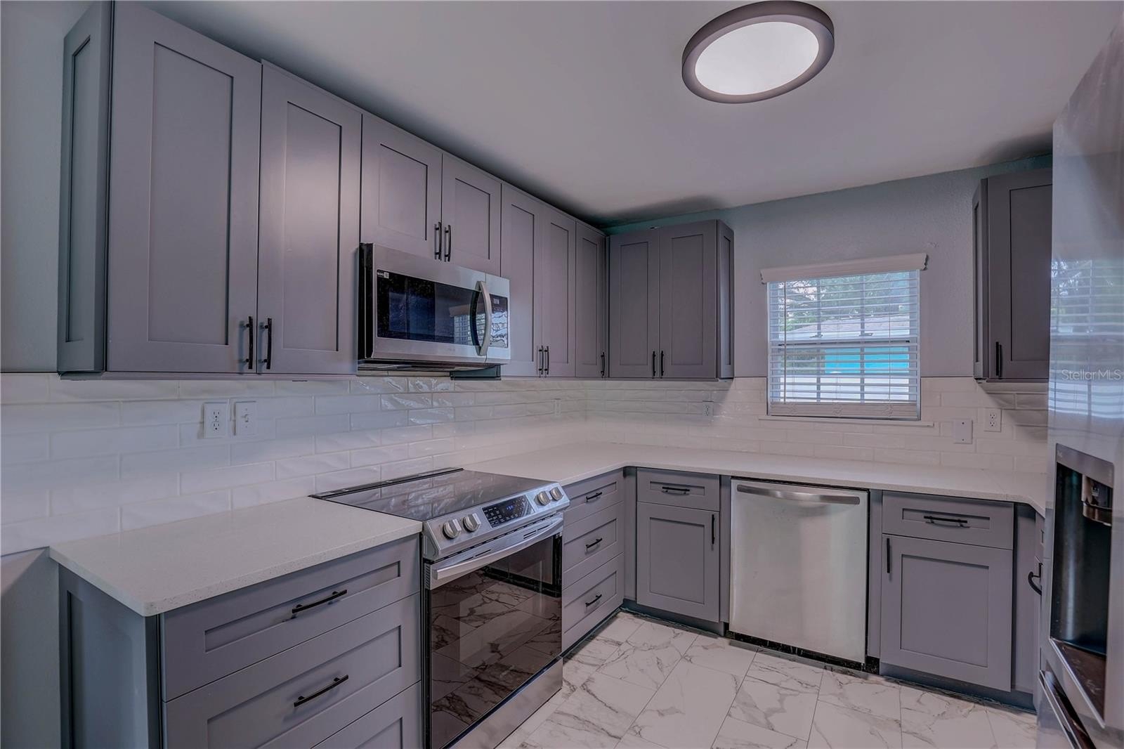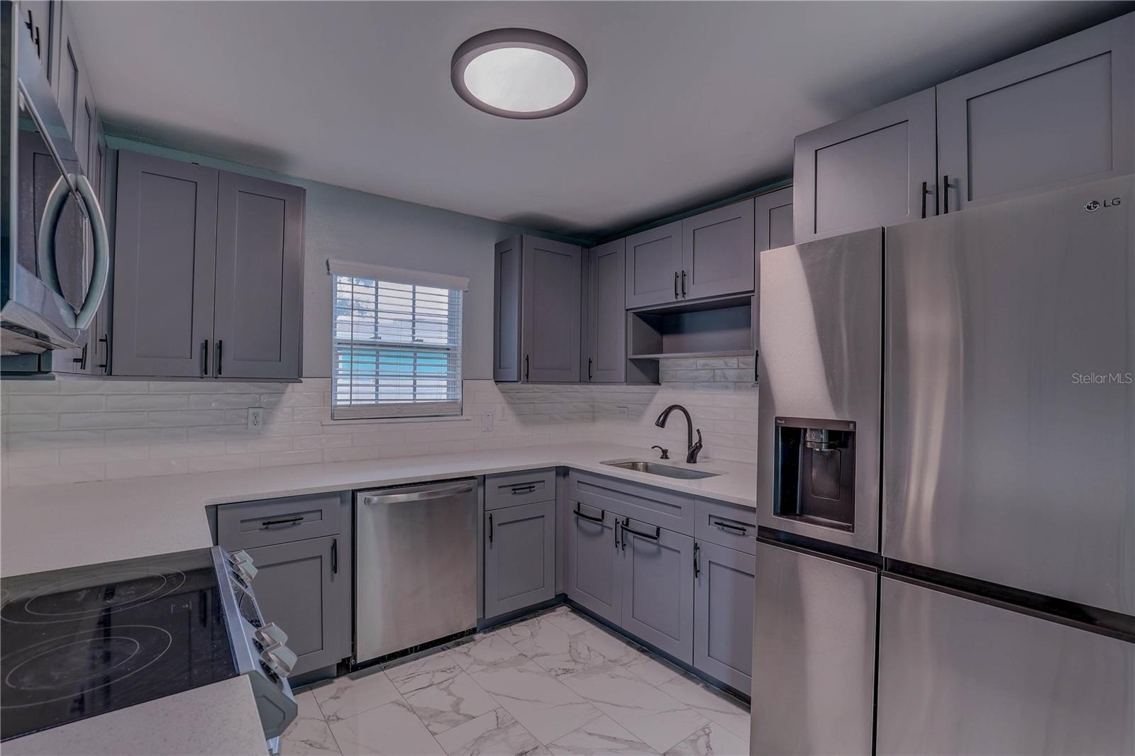The kitchen? Let’s talk about that. It’s outfitted with stone counters that scream sleek sophistication, and includes everything you’d want — dishwasher, disposal, electric range, refrigerator, washer, and dryer — all seamlessly integrated. Whether you’re whipping up breakfast or hosting a dinner party, this space keeps up with your lifestyle.