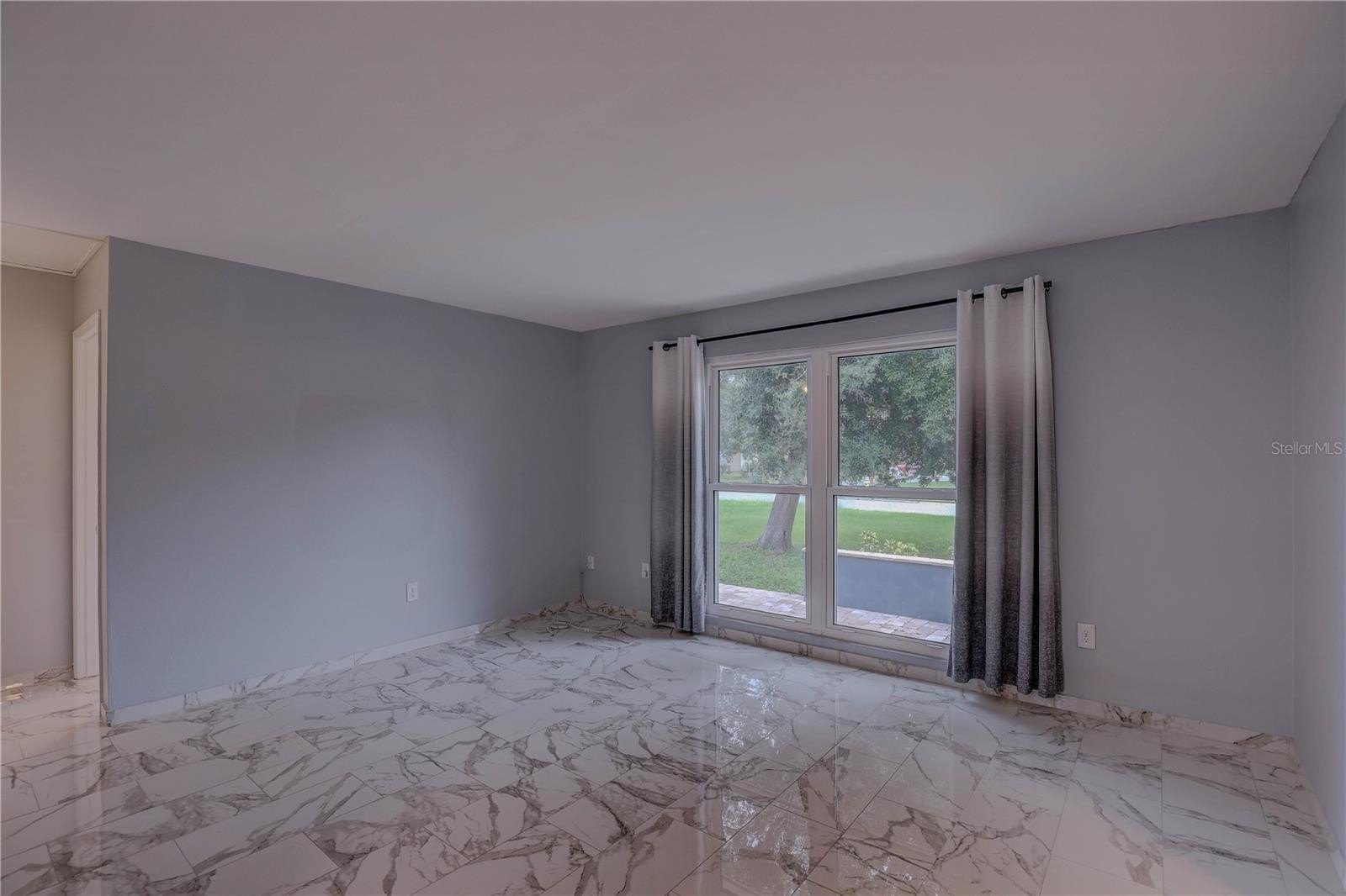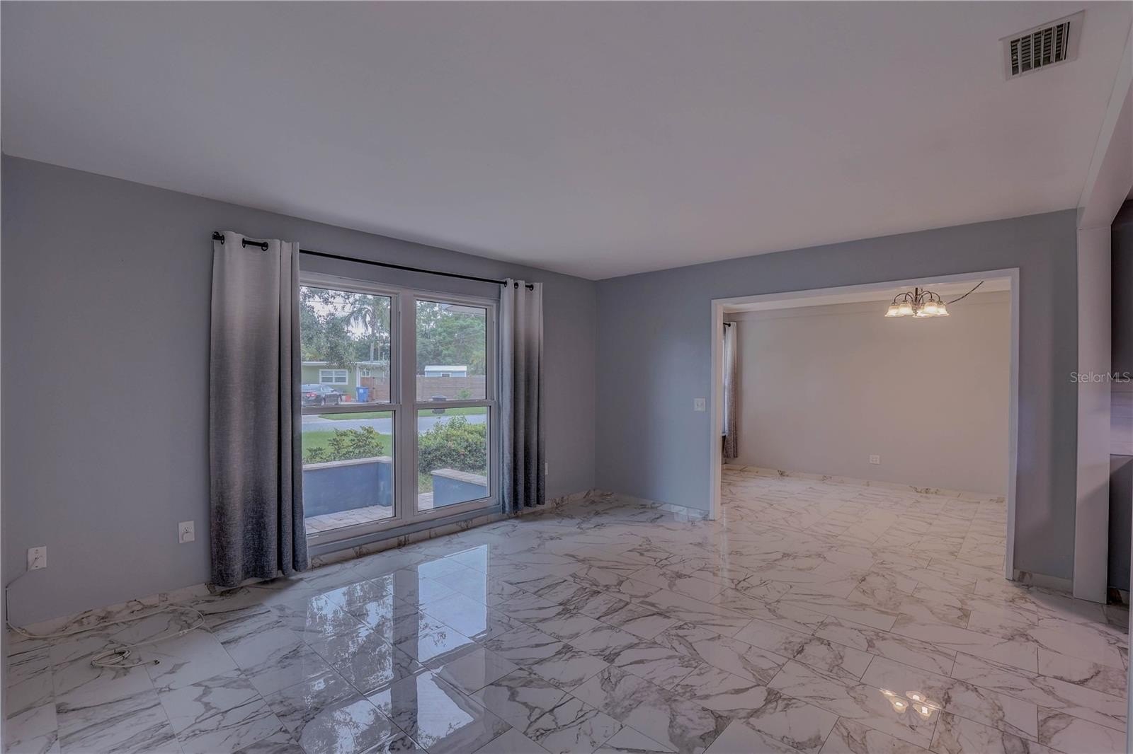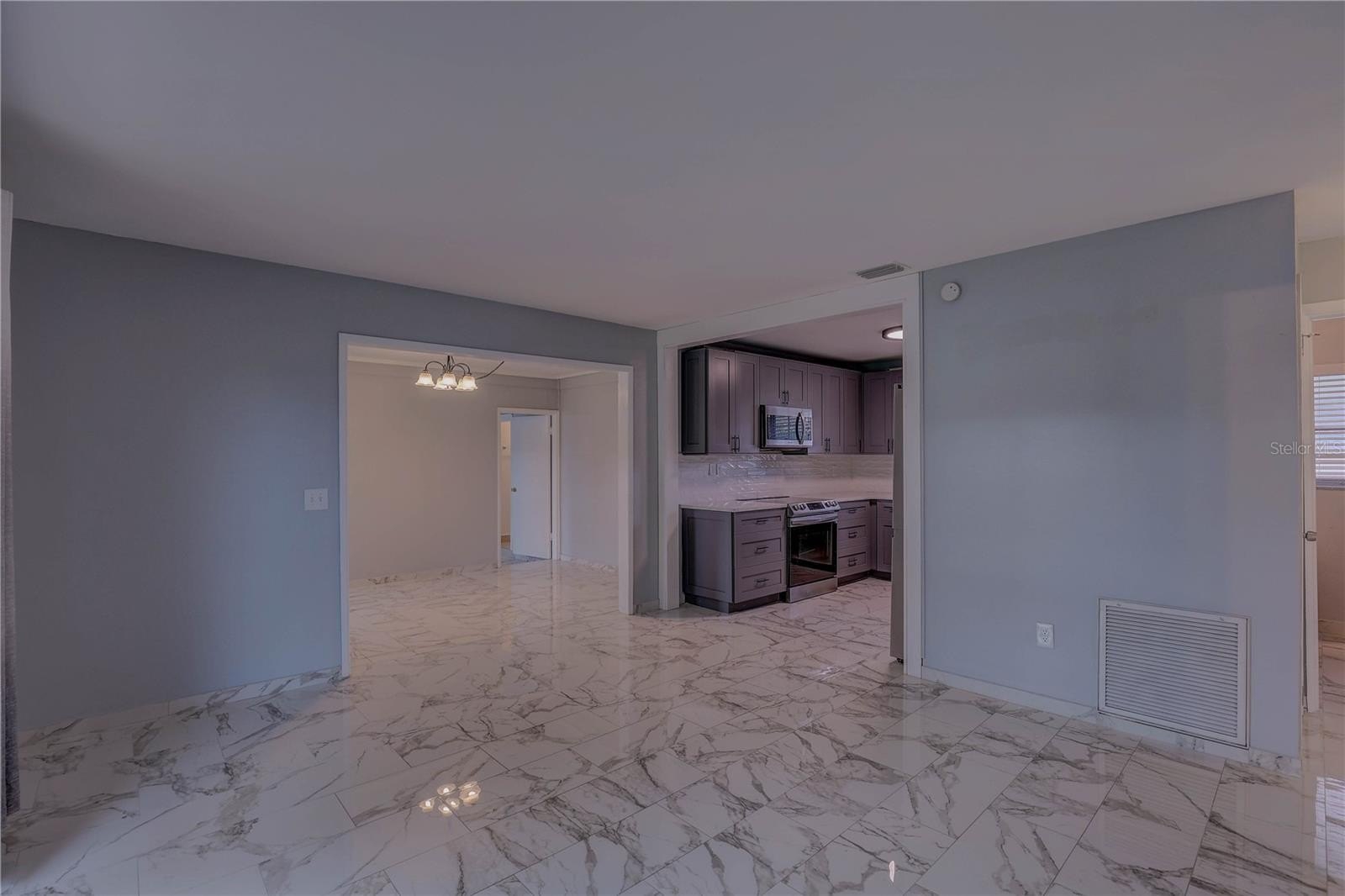 Step inside, and you're greeted with a thoughtfully flowing floor plan where every inch feels curated. The living and dining spaces are open, airy, and full of natural light, with terrazzo, tile, and carpeted floors that balance warmth and function. The central air conditioning keeps things cool and crisp, while the layout flows easily for everyday living or effortless entertaining.