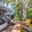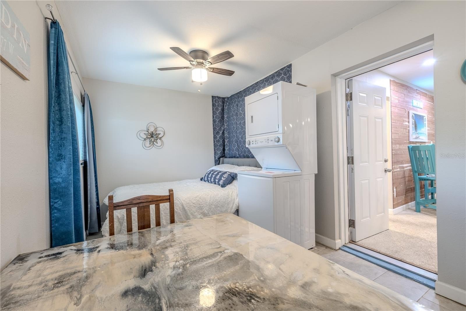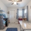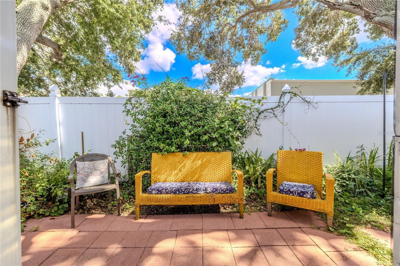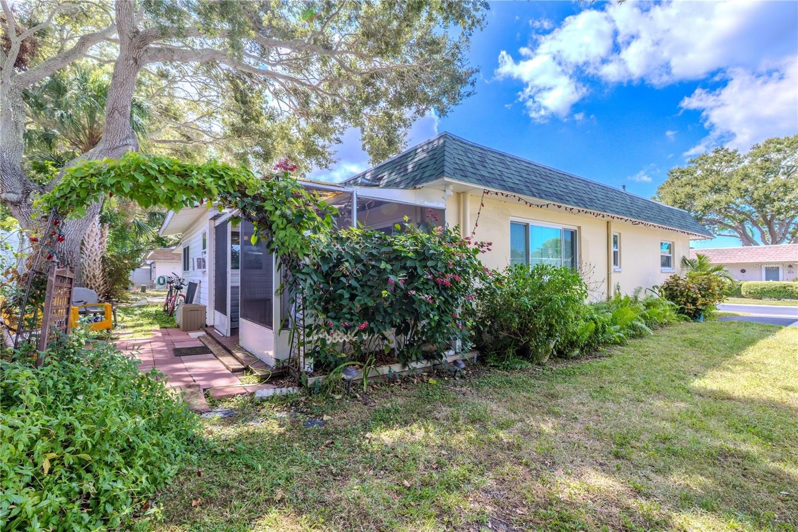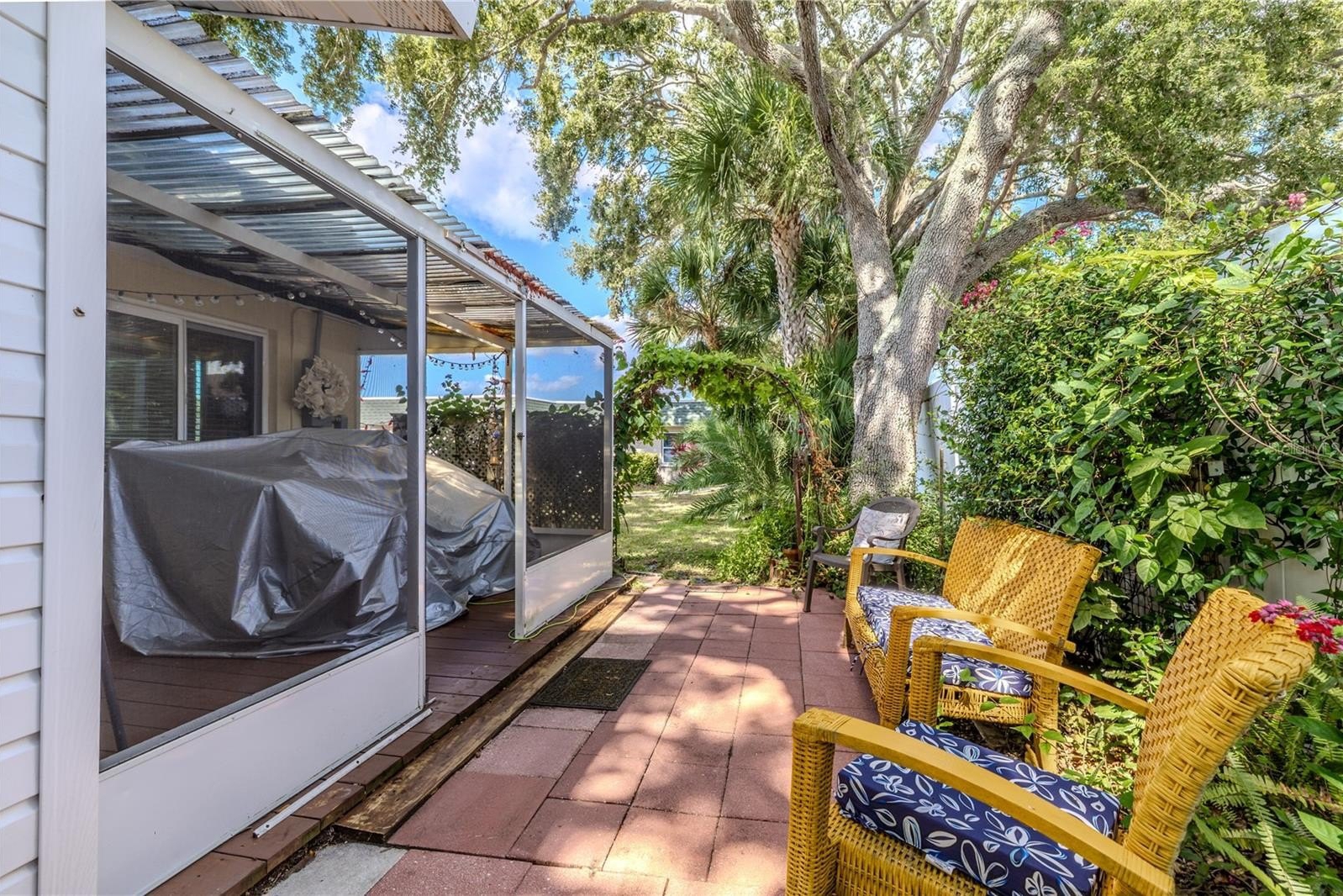 At the back of the home, a versatile bonus room extends the living space and connects directly to the outdoors. This flexible area can serve as a cozy reading lounge, creative studio, or laundry space, with direct access to the screened patio just beyond. The covered, tiled enclosure is perfect for enjoying a quiet morning coffee or relaxing in the shade, while the adjoining open patio invites you to unwind under the sky or share a meal alfresco.