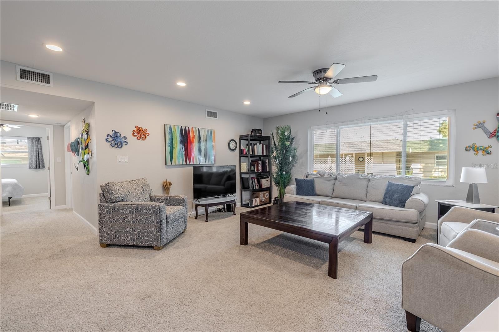 Welcome to this beautifully cared-for 2-bedroom, 2-bath end-unit villa in the sought-after Skye Loch Villas community of Dunedin. Step in from the covered carport and you’ll immediately feel at home in the spacious living room, where soft carpet, warm natural light, and a calm neutral palette create a setting made for both comfort and connection. This inviting main space is perfect for quiet evenings or casual gatherings and flows naturally into the dining area, where large windows frame garden views and bring the outdoors in.