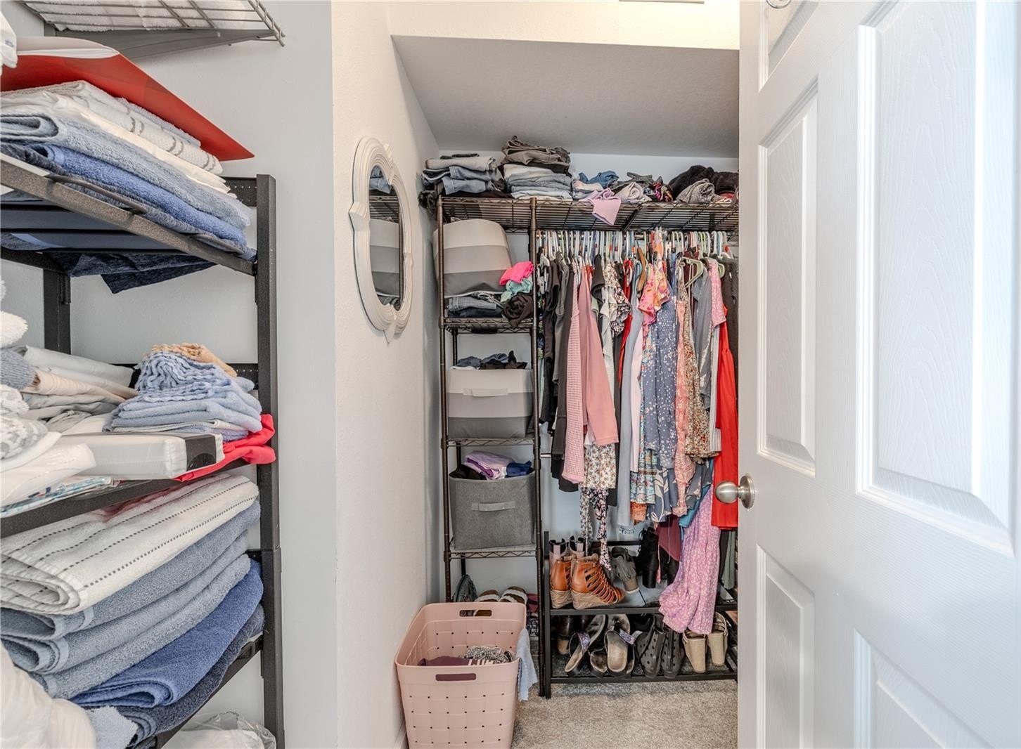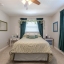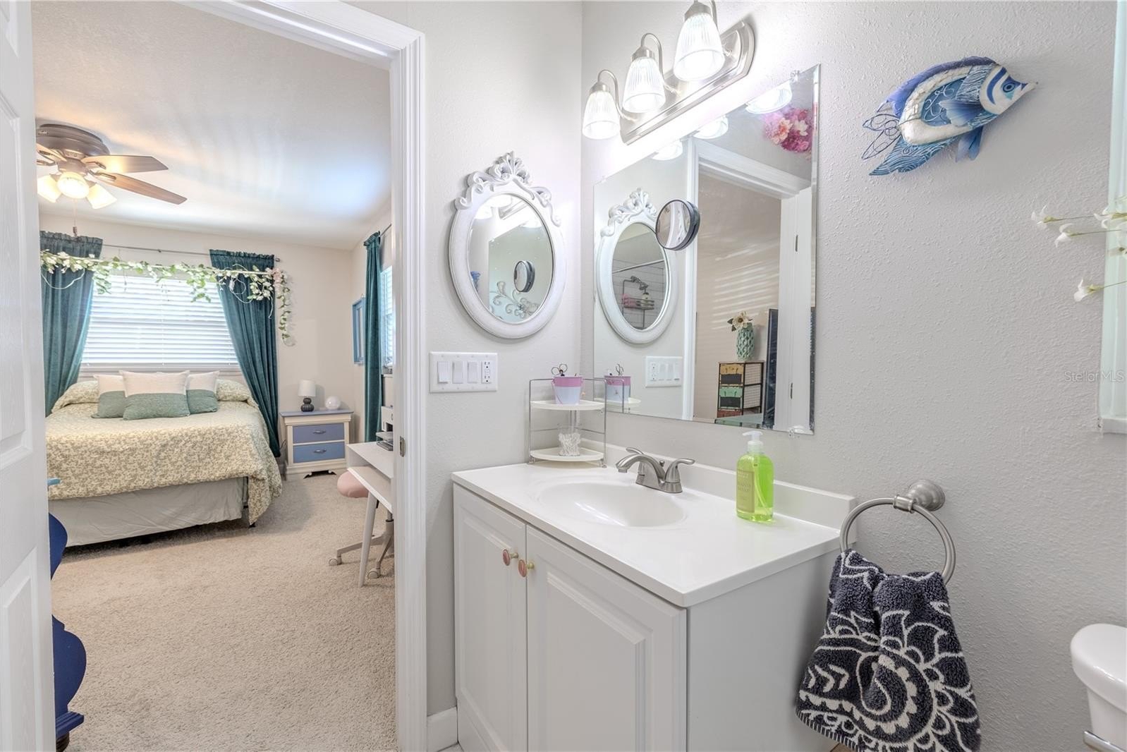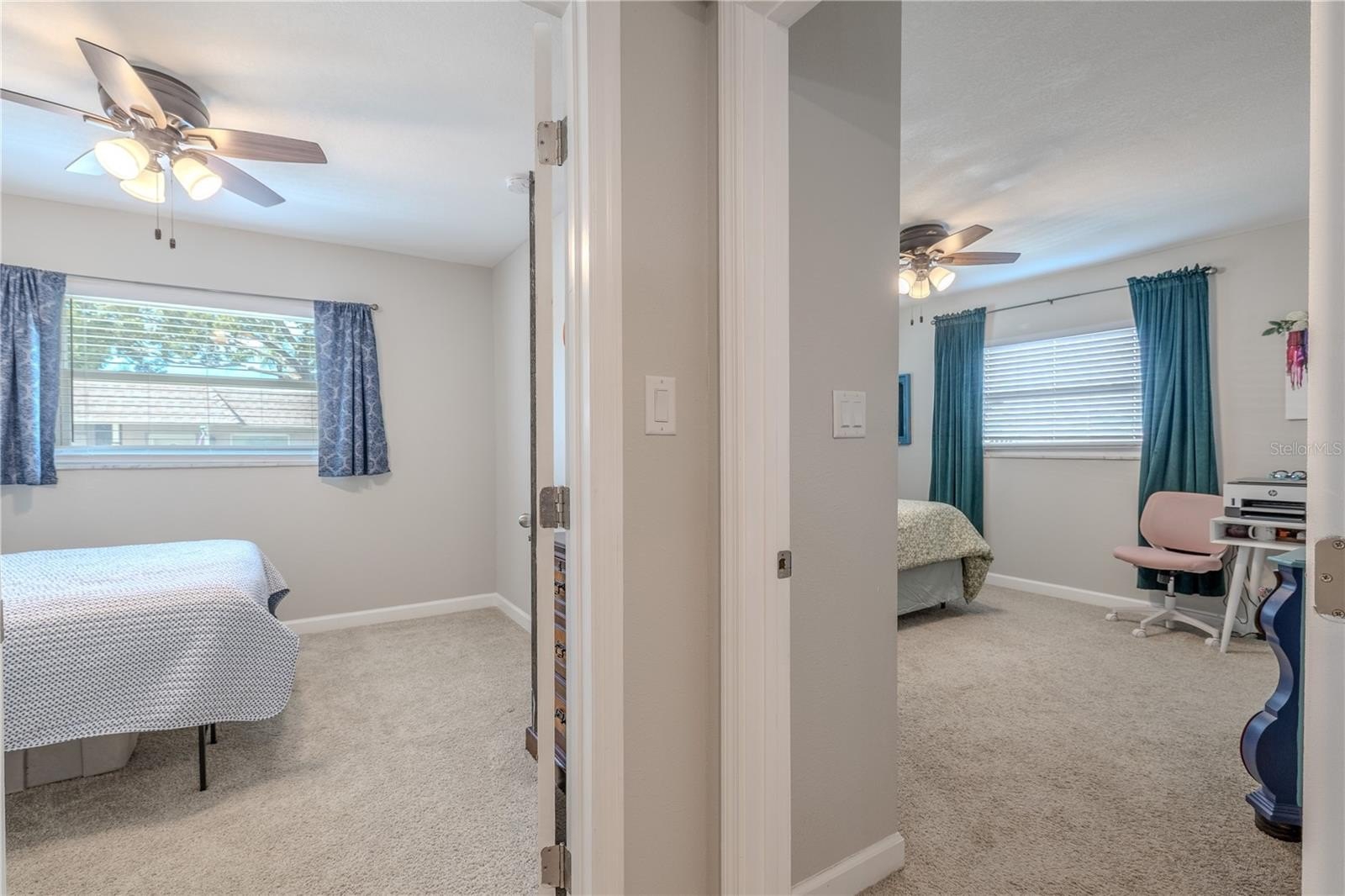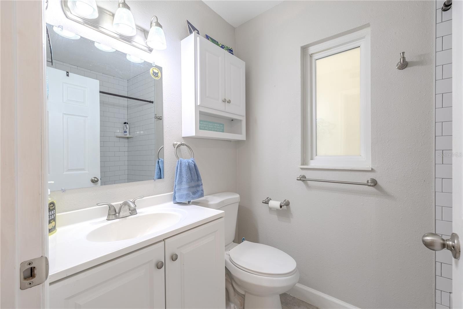 Down the hall, both bedrooms are positioned for convenience and privacy from the main living area. The guest bedroom is light and comfortable, with ample closet space and easy access to the updated hall bath featuring a sleek vanity, fresh tilework, and a tub-shower combination that feels modern and functional. The primary suite sits just beyond, offering a peaceful retreat with plush carpet, a spacious walk-in closet, and an ensuite bathroom with a walk-in shower, tiled walls, and a recessed storage nook discreetly built behind the door, ideal for linens and essentials.
