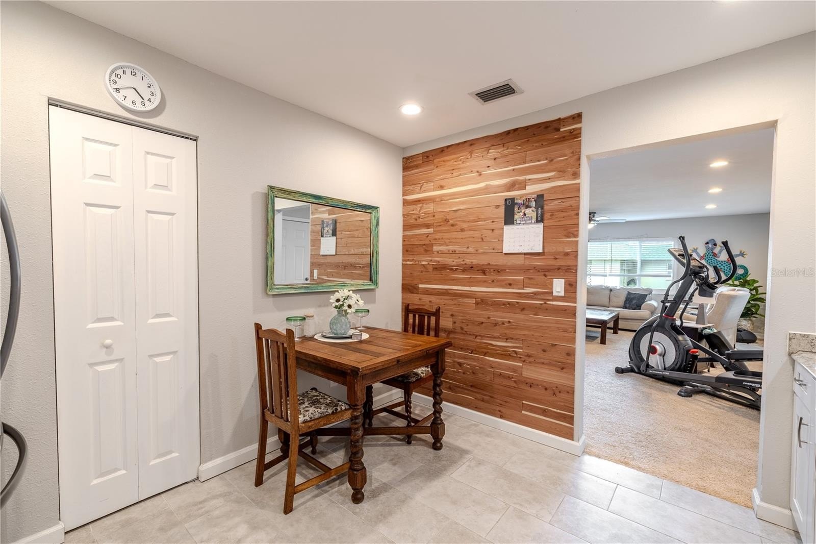 The kitchen sits just beyond, offering both practicality and charm. With generous cabinetry, tile flooring, and a convenient pass-through that keeps the layout open, this space makes everyday living easy. A nearby pantry and extra closet provide valuable storage, while the bright finishes make it feel welcoming and timeless.