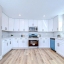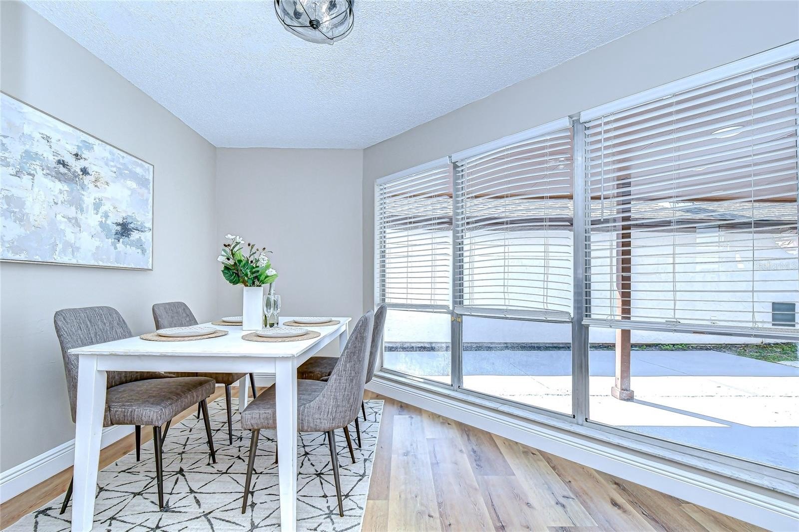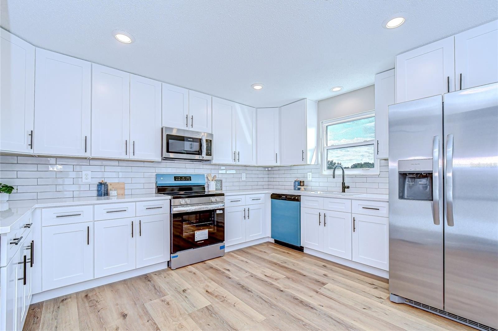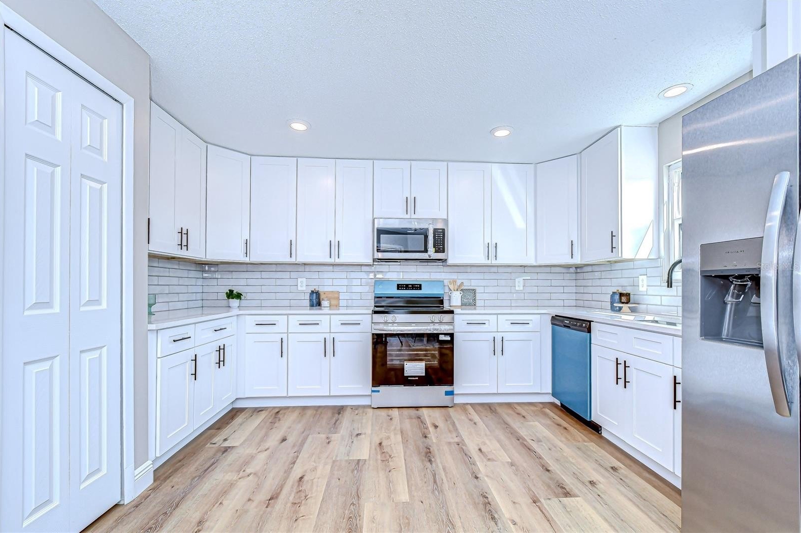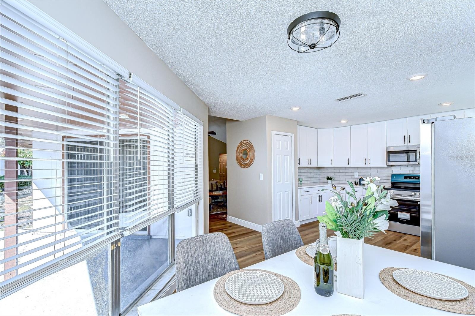 The stunning kitchen blends functionality with flair, featuring 42” shaker-style cabinetry, quartz countertops, a designer tile backsplash, recessed lighting, pantry, and a full suite of NEW stainless-steel appliances including a smooth-top range, side-by-side refrigerator, microwave, and dishwasher. A cozy café nook offers the perfect spot for morning coffee overlooking the courtyard.