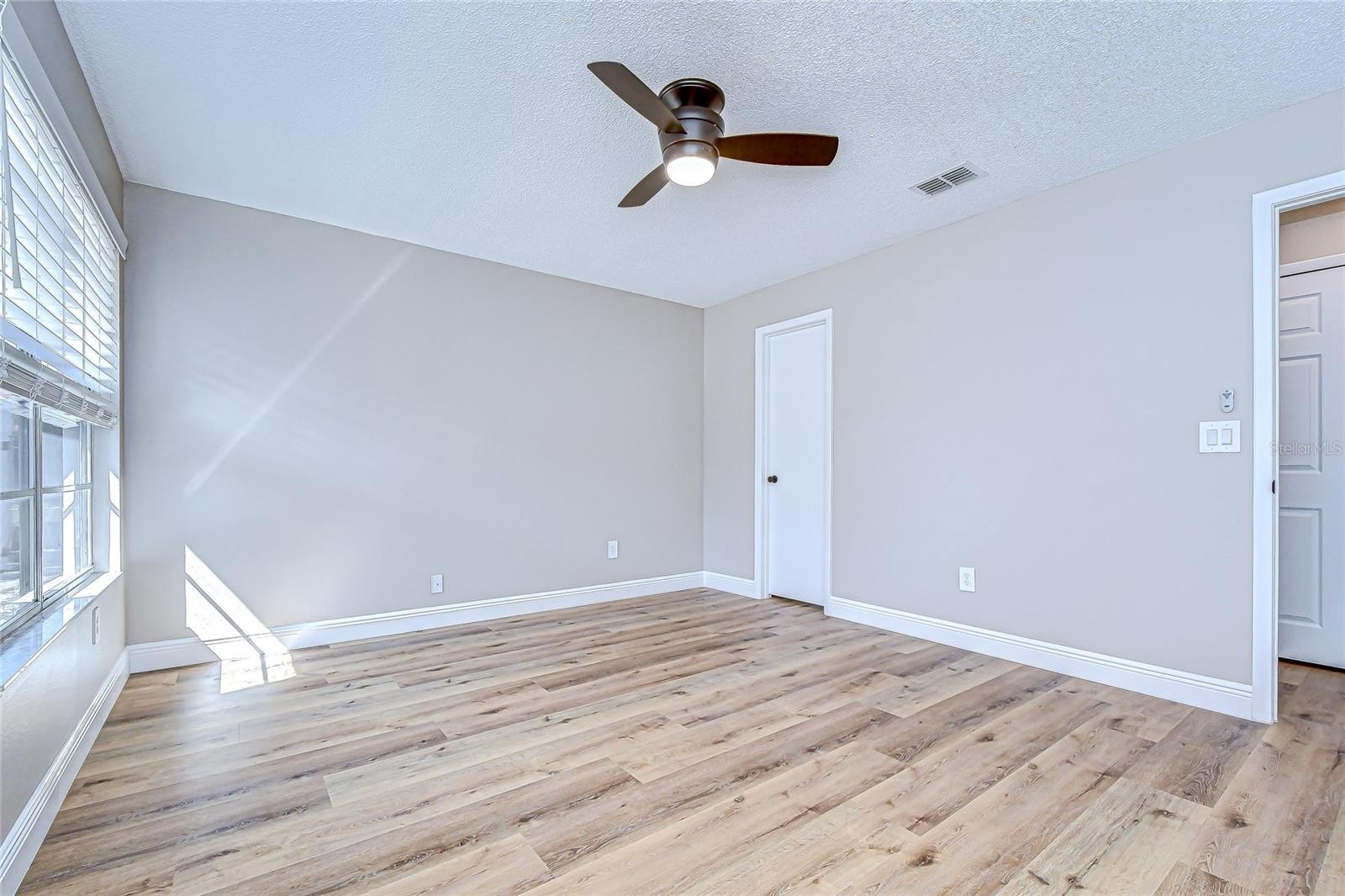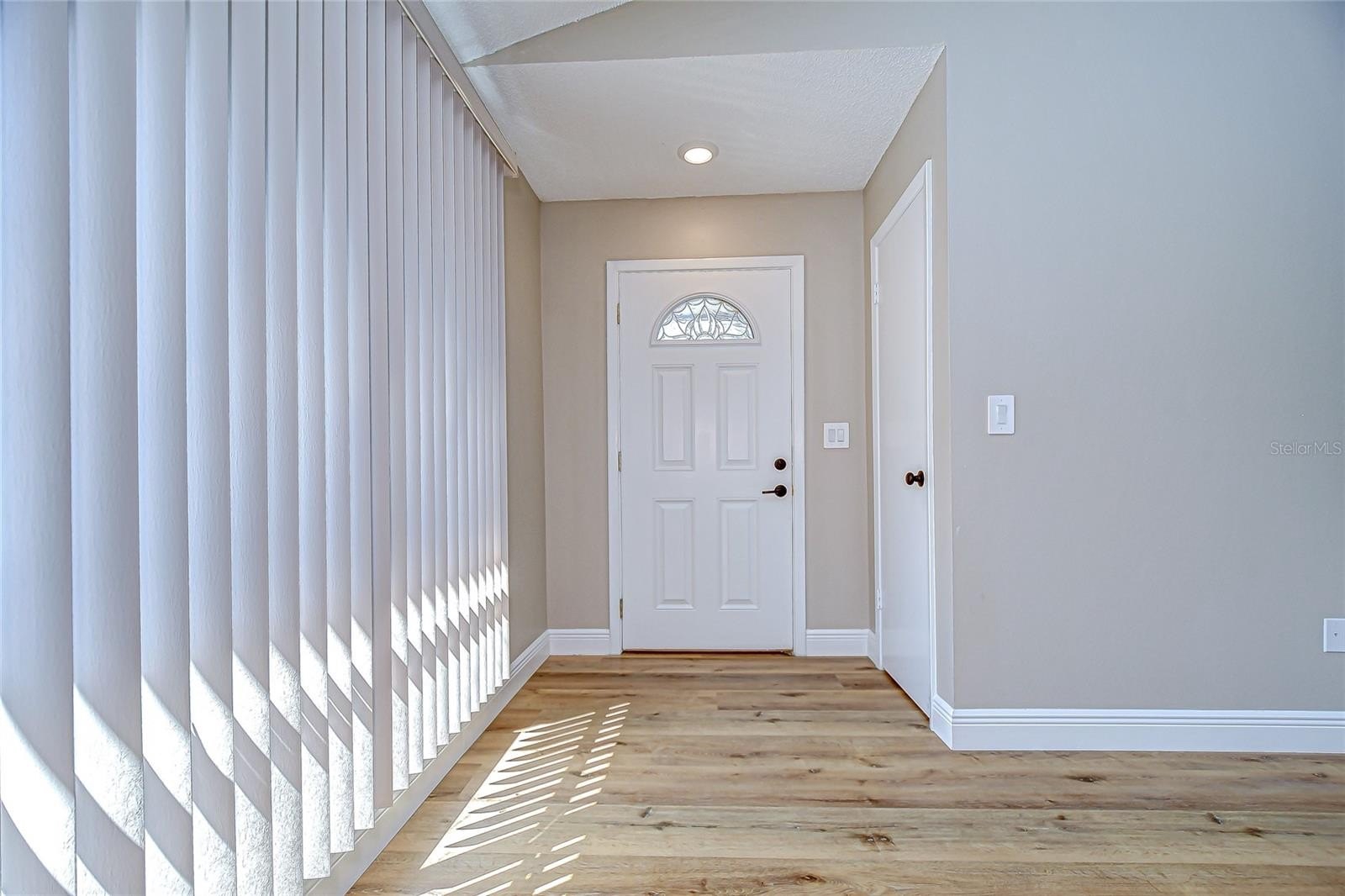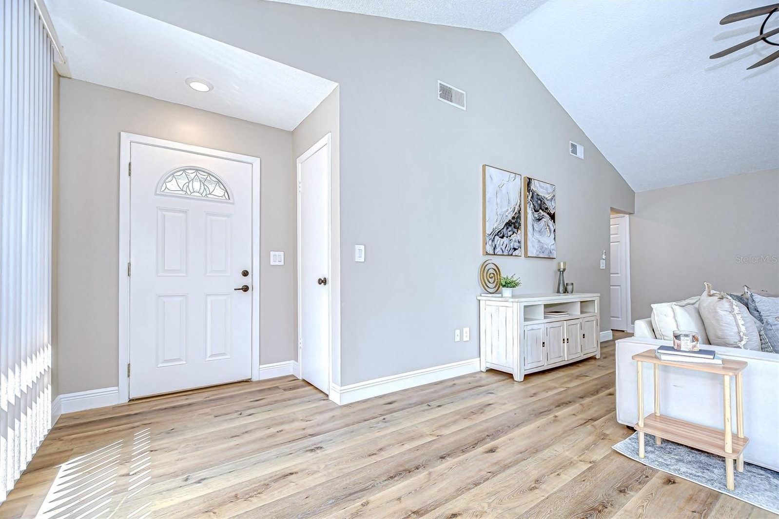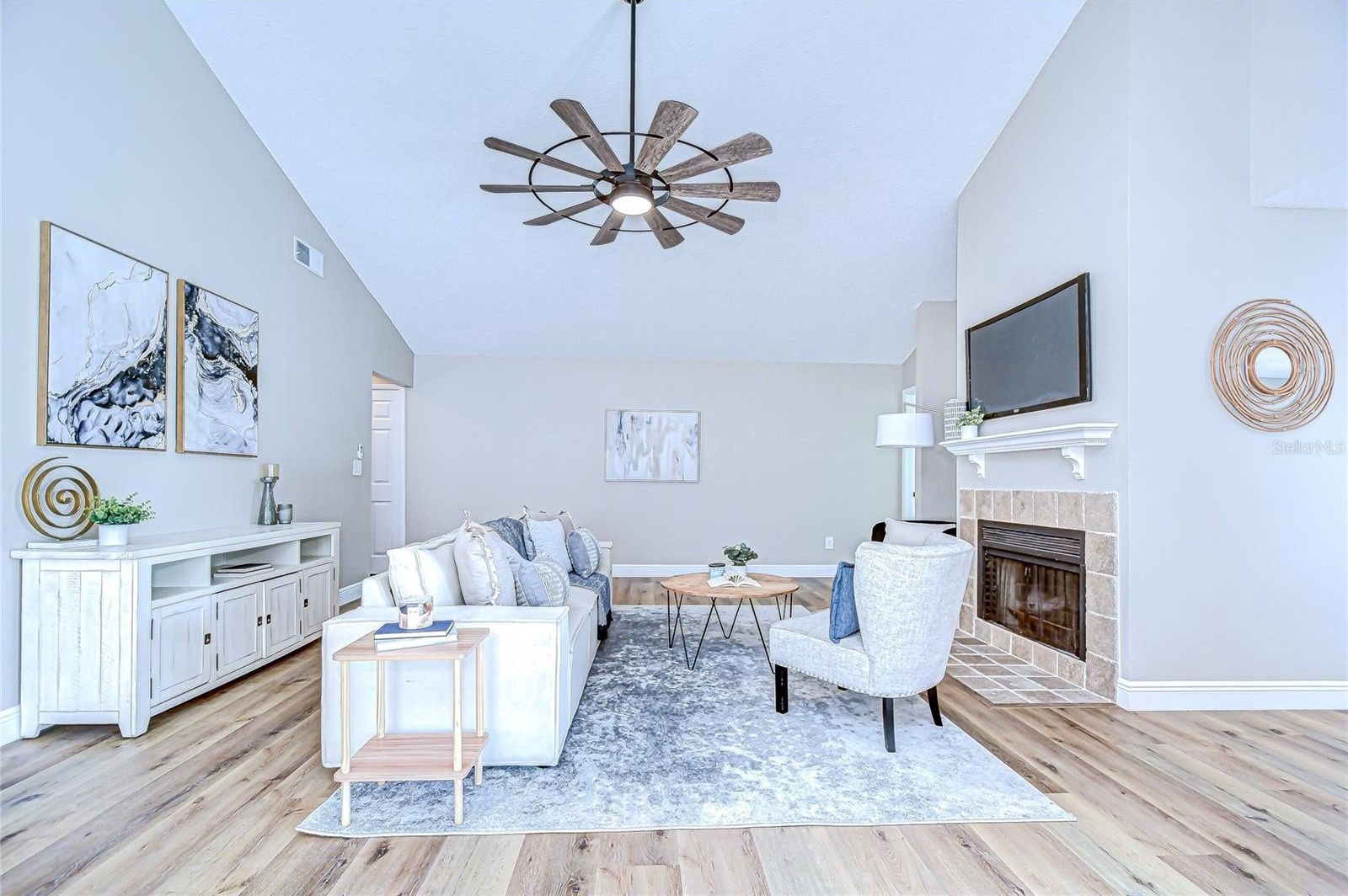 Inside the foyer, a convenient coat closet, the open-concept great room impresses with soaring vaulted ceilings, abundant natural light, and a striking fireplace with a custom mantle — the perfect centerpiece for relaxing or entertaining. A dramatic NEW 60” ceiling fan hangs gracefully from the 12’ ceiling, adding both comfort and flair. Newly installed luxury vinyl plank flooring flows seamlessly throughout the home, complemented by fresh 5-1/4” high baseboards and a modern, neutral palette, freshly painted, that enhances the sense of space and sophistication.