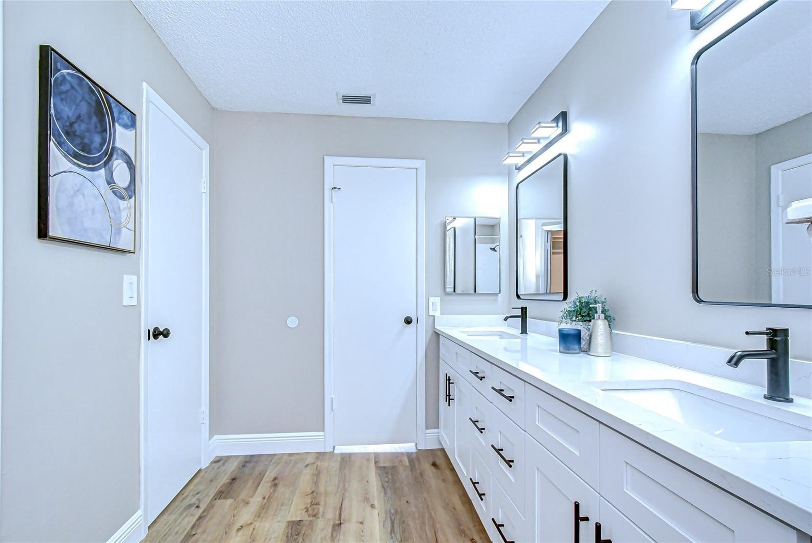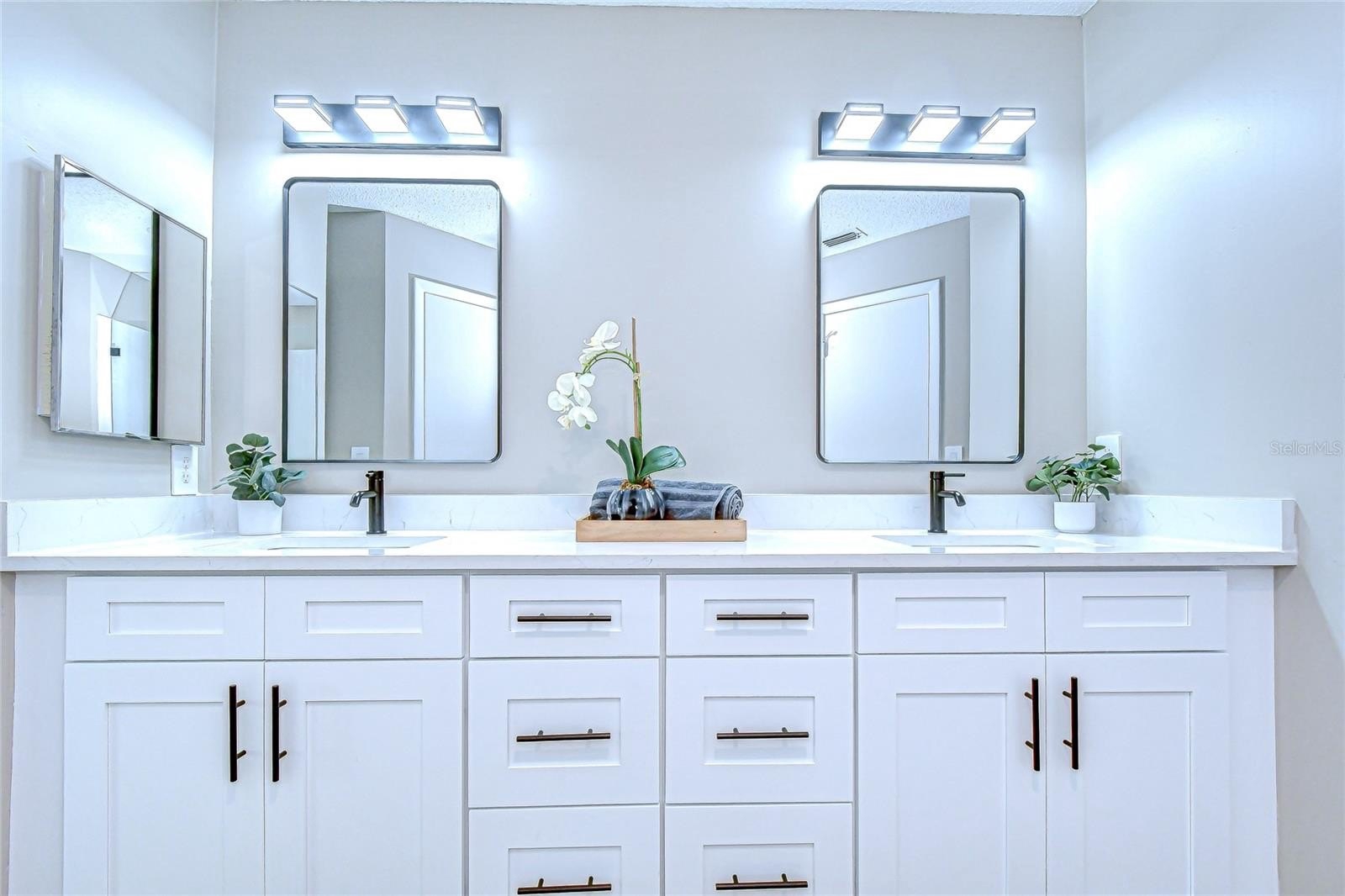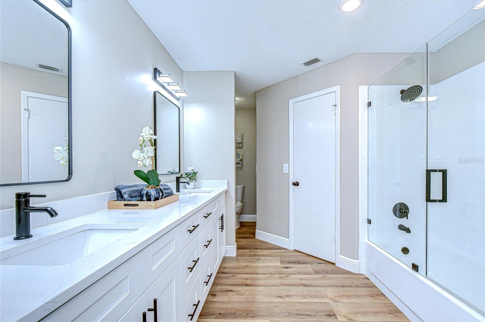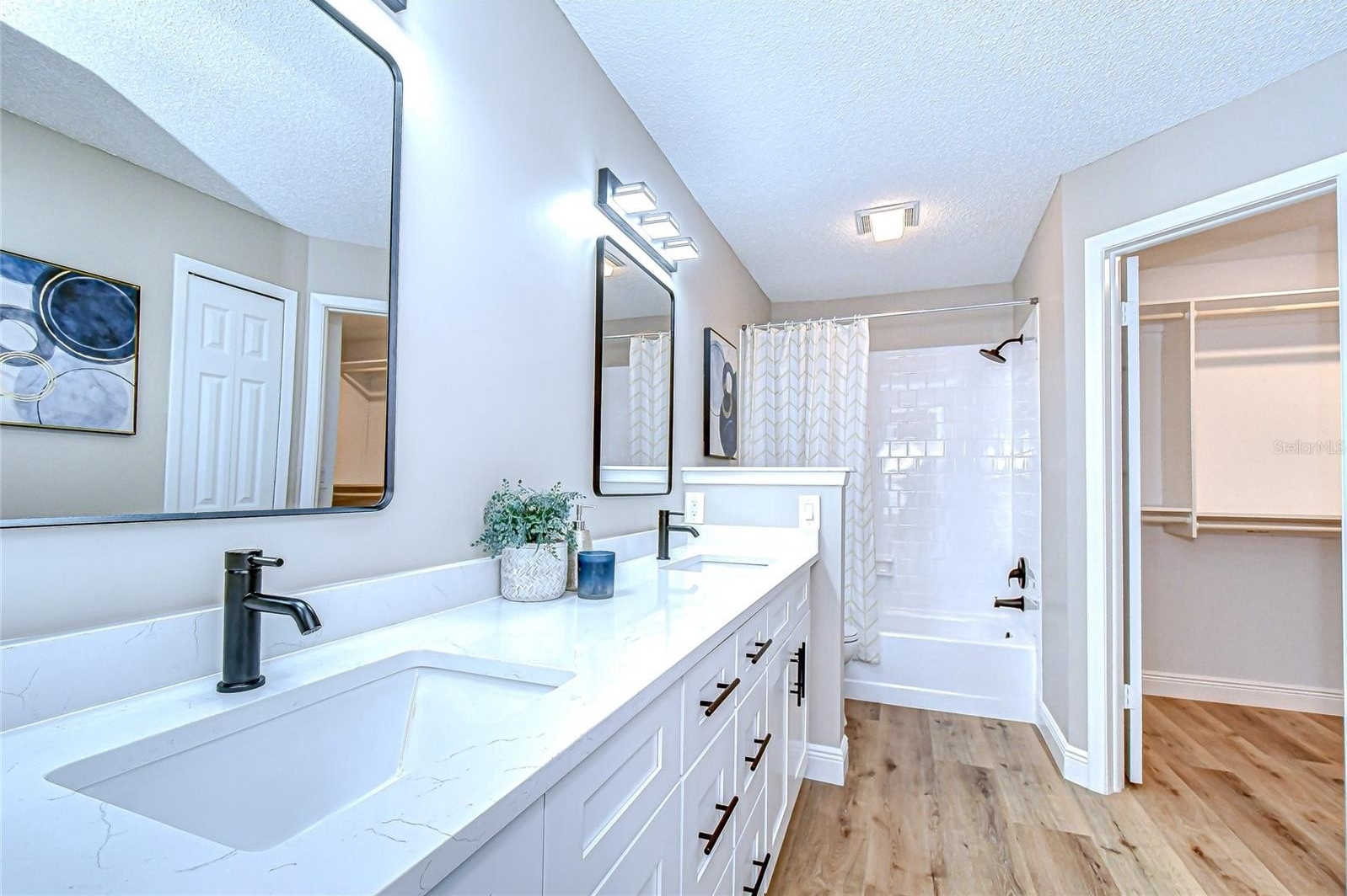 Enjoy two spacious primary suites, each offering NEW double vanities with drawers, quartz countertops, and undermount sinks. The main suite stands out with vaulted ceilings, a NEW ceiling fan, dual walk-in closets with built-in organizers, a linen closet, and a beautifully tiled tub/shower with glass enclosure.